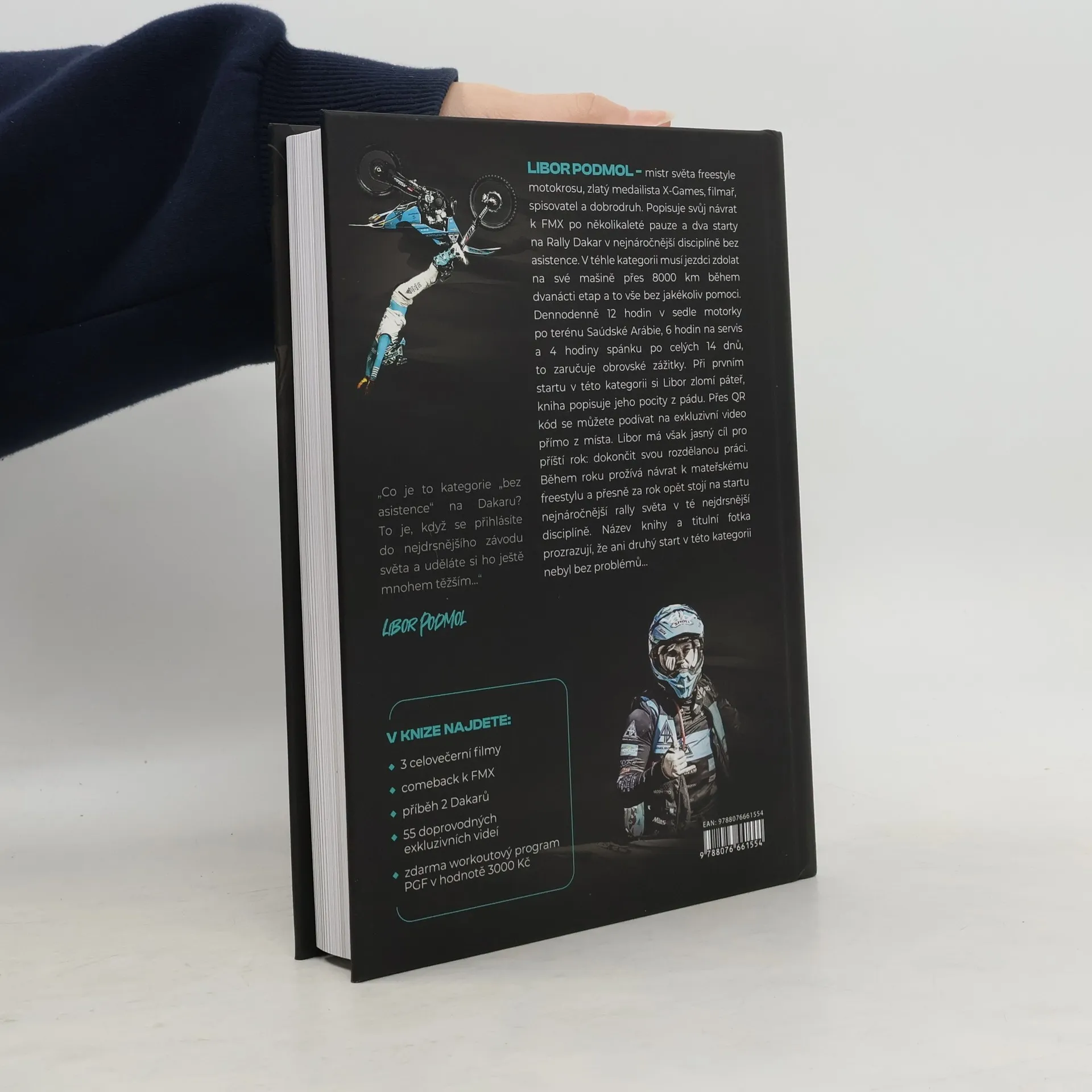 Libor Podmol – mistr světa Freestyle Motocrossu, zlatý medailista X-Games, filmař, spisovatel a dobrodruh. Popisuje svůj návrat k FMX po několikaleté pauze a dva starty na Rally Dakar v nejnáročnější disciplíně bez asistence. V téhle kategorii musí zdolat jezdci na své mašině přes 8000km během 12 etap, servisovat motorku, spát ve stanu a to vše bez jakékoliv pomoci. Denodenně 12 hodin v sedle motorky po terénu Saúdské Arábie, 6 hodin na servis a 4 hodiny spánku po celých 14 dnů zaručují obrovské zážitky. Při prvním startu v této kategorii si Libor zlomí páteř, kniha popisuje jeho pocity z pádu a přes QR kód se můžete podívat na exkluzivní video přímo z místa. Libor má však jasný cíl na příští rok, dokončit svou rozdělanou práci. Během roku prožívá návrat k jeho mateřskému freestylu a přesně za rok se opět staví na start nejnáročnější rally světa v té nejdrsnější disciplíně. Název knihy a titulní fotka prozrazují, že ani druhý start v této kategorii nebyl bez problémů… „Co je to kategorie bez asistence na Dakaru? To je když se přihlásíte do nejdrsnějšího závodu světa a uděláte si ho ještě mnohem těžší…“