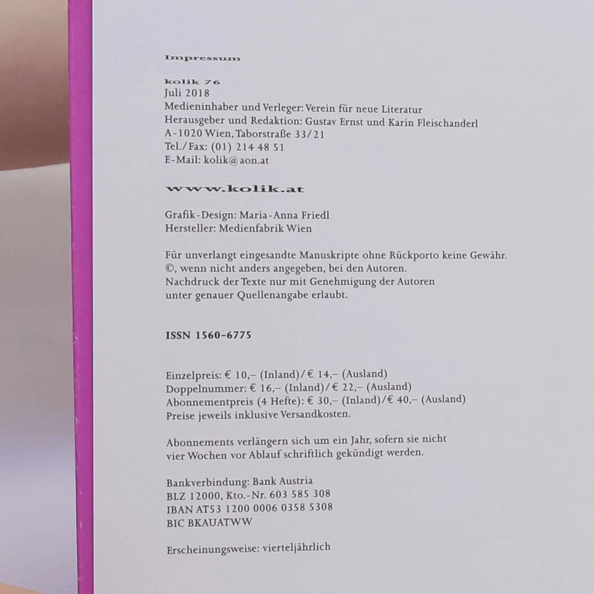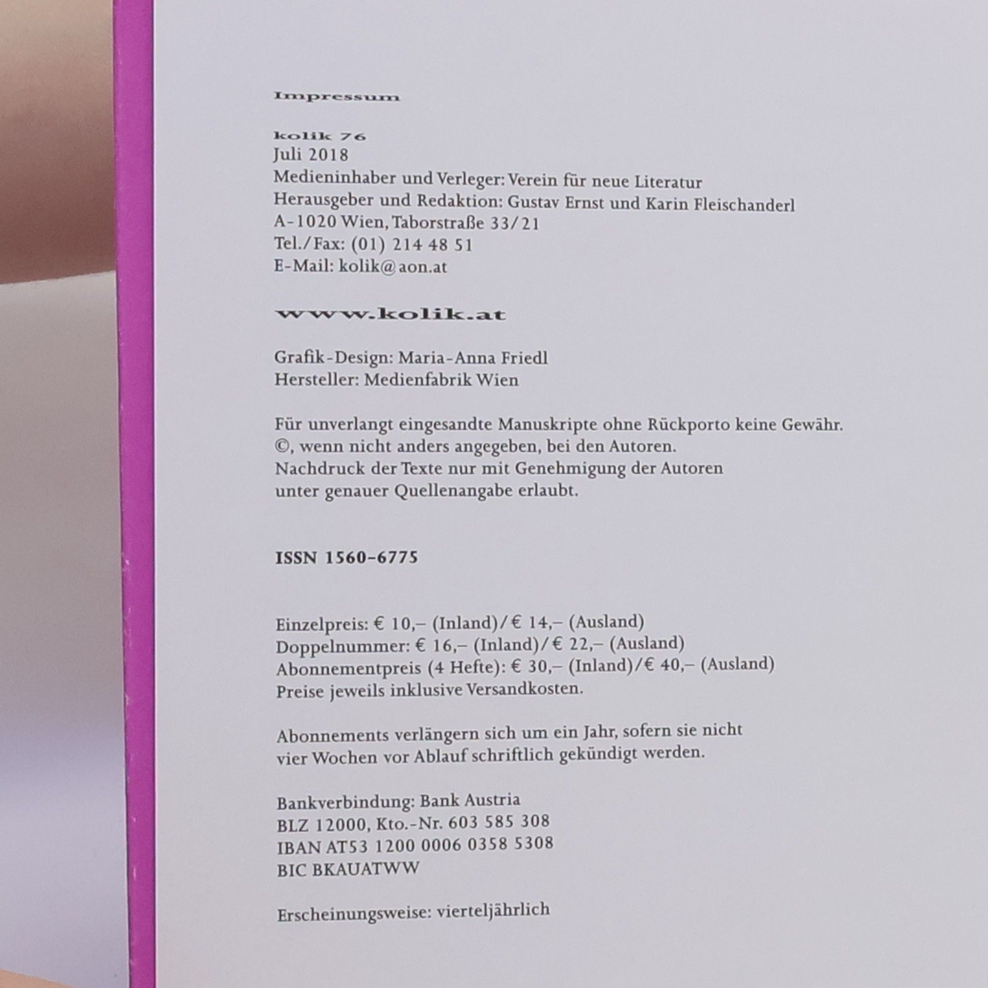 Kolik 76. Zeitschrift für Literatur 76/2018