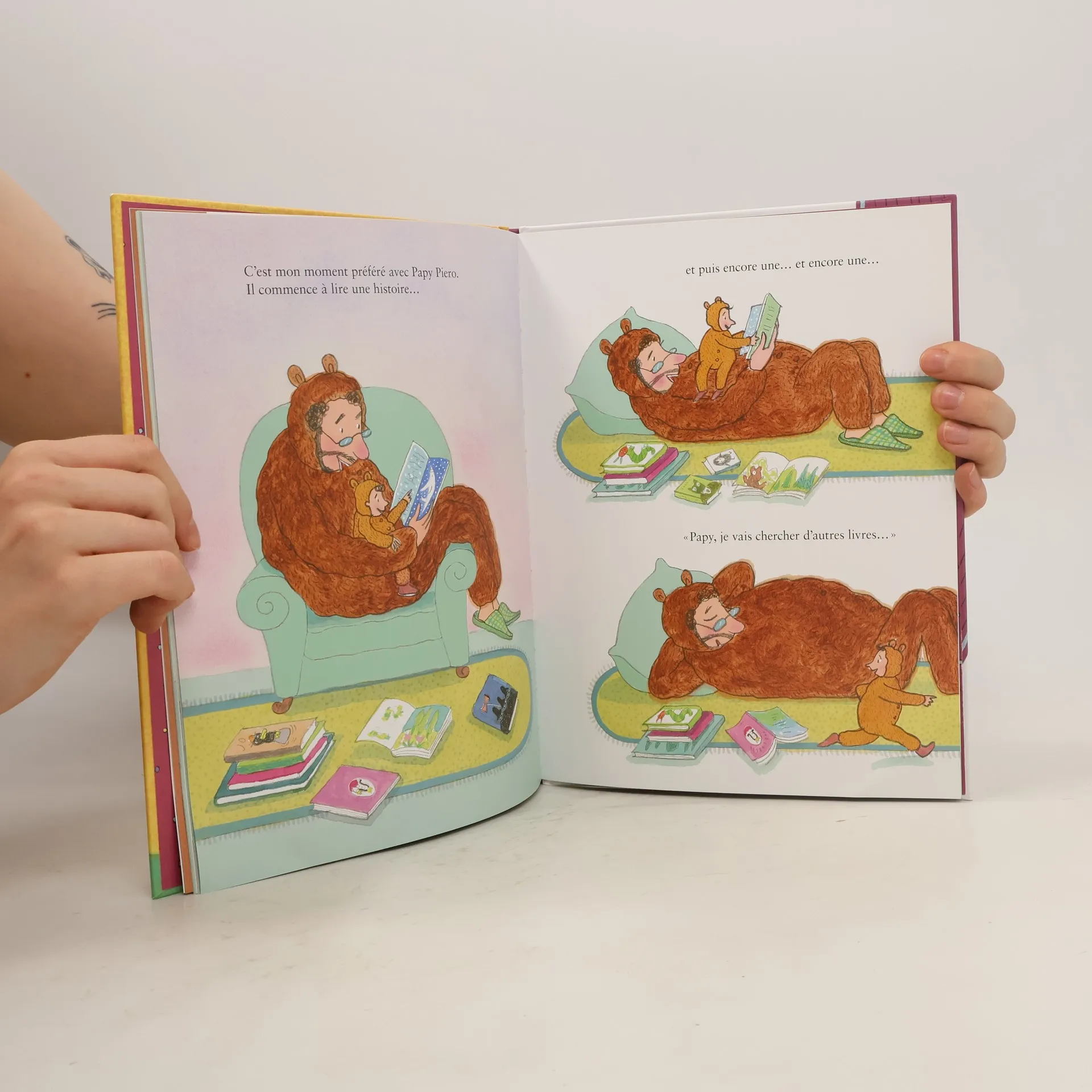 "Aujourd'hui, c'est Papy Piero qui va chercher Léo à l'école. Ils retournent ainsi chez ce dernier sur son vélo de course et, tandis que Mamie se rend à son cours de danse, ils passent la soirée à s'amuser en jouant les chevaliers, le chat et la souris, le pilote d'avion et les gymnastes blessés grâce aux multiples costumes du grand-père. Au moment de manger, il se déguise même en lapin et en singe pour inciter le garçon à avaler ses légumes et ses fruits. De plus, l'éléphant célèbre l'heure du bain et l'ours, celui des histoires et du coucher, mais Papy pourrait bien se mettre à ronfler avant le petit Léo!"--SDM