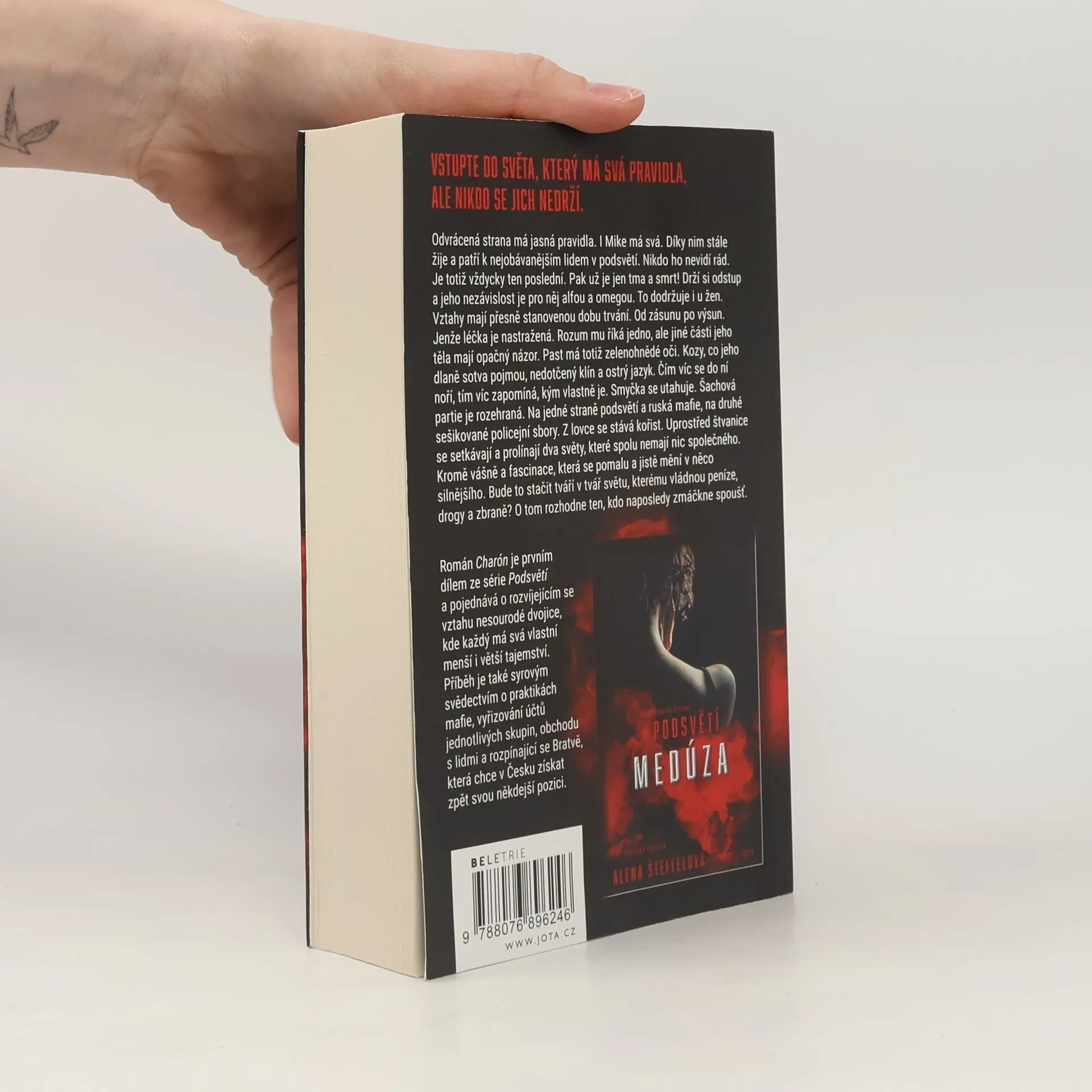 Když si zahráváš s ohněm, můžeš se spálit.Odvrácená strana má jasná pravidla. I Mike má svá. Díky nim stále žije a patří k nejobávanějším lidem v podsvětí. Nikdo ho nevidí rád. Je totiž vždycky ten poslední. Pak už je jen tma a smrt! Drží si odstup a jeho nezávislost je pro něj alfou a omegou. To dodržuje i u žen. Vztahy mají přesně stanovenou dobu trvání. Od zásunu po výsun. Jenže léčka je nastražená. Rozum mu říká jedno, ale jiné části jeho těla mají opačný názor. Past má totiž zelenohnědé oči. Kozy, co jeho dlaně sotva pojmou, nedotčený klín a ostrý jazyk. Čím víc se do ní noří, tím víc zapomíná, kým vlastně je.Smyčka se utahuje. Šachová partie je rozehraná. Na jedné straně podsvětí a ruská mafie, na druhé sešikované policejní sbory. Z lovce se stává kořist. Uprostřed štvanice se setkávají a prolínají dva světy, které spolu nemají nic společného. Kromě vášně a fascinace, která se pomalu a jistě mění v něco silnějšího. Bude to stačit tváří v tvář světu, kterému vládnou peníze, drogy a zbraně? O tom rozhodne ten, kdo naposledy zmáčkne spoušť.Román Charón je první díl série erotických thrillerů z českého podsvětí o rozvíjejícím se vztahu nesourodé dvojice, kde každý má svá menší i větší tajemství. Charón je drsné svědectví o praktikách podsvětí v Česku; syrové vyprávění se strhujícím dějem, nečekanými zápletkami a sarkasmem na každé stránce.Vstupte do světa, který má svá pravidla, ale nikdo se jich nedrží. Vstupte do Podsvětí.