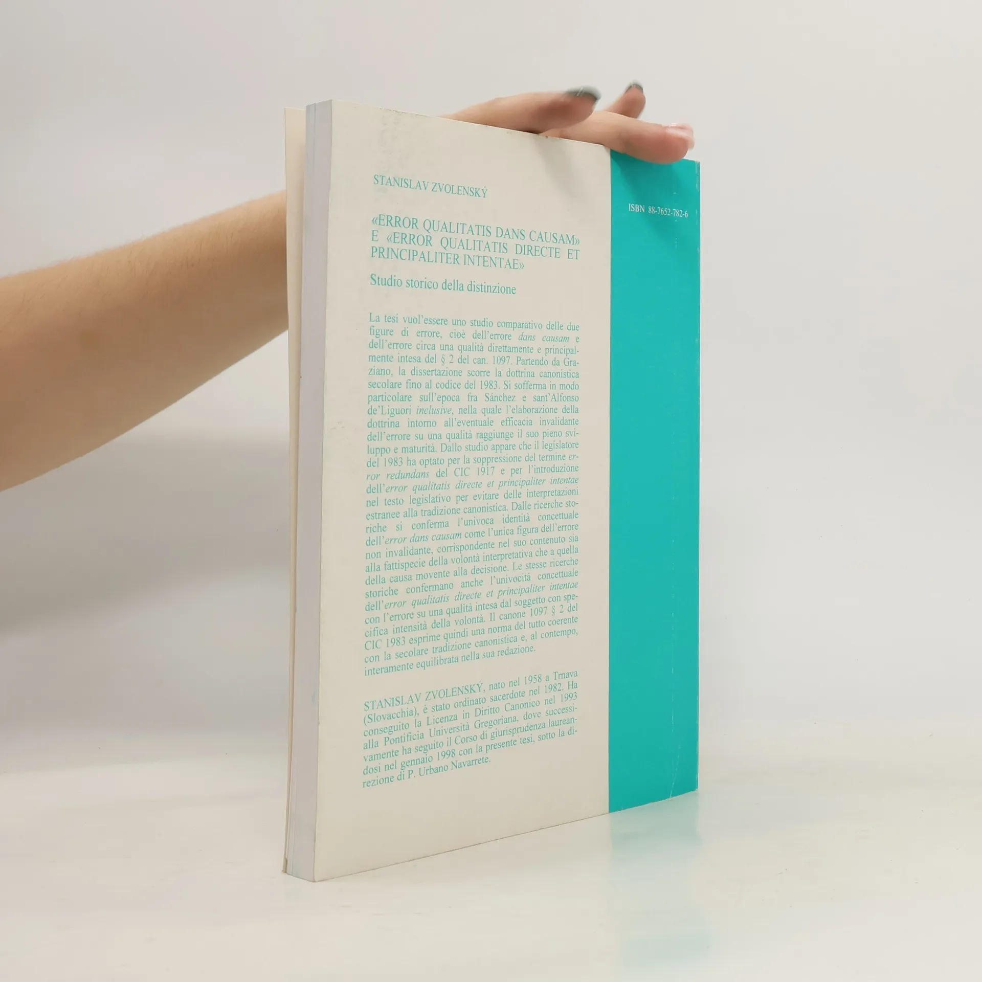 Questo studio vuol camparare due figure di errore, ossia l'errore dans causam e l'errore circa una qualita direttamente e principalmente intesa del 2 del can 1097. Partendo da Graziano la dissertazione scorre la dottrina canonistica secolare fino al codice 1983. Si sofferma sull'epoca fra Sanchez e sant'Alfonso de' Liguori inclusive, nella quale l'elaborazione della dottrina intorno all'eventuale efficacia invalidante dell'errore su una qualita raggiunge il suo pieno sviluppo e maturita. Stanislav Zvolensk? 1958, ha conseguito licenza e dottorato in diritto canonico presso la Pontificia Universita Gregoriana sotto la direzione del S.E.R.Card. Urbano Navarrete.