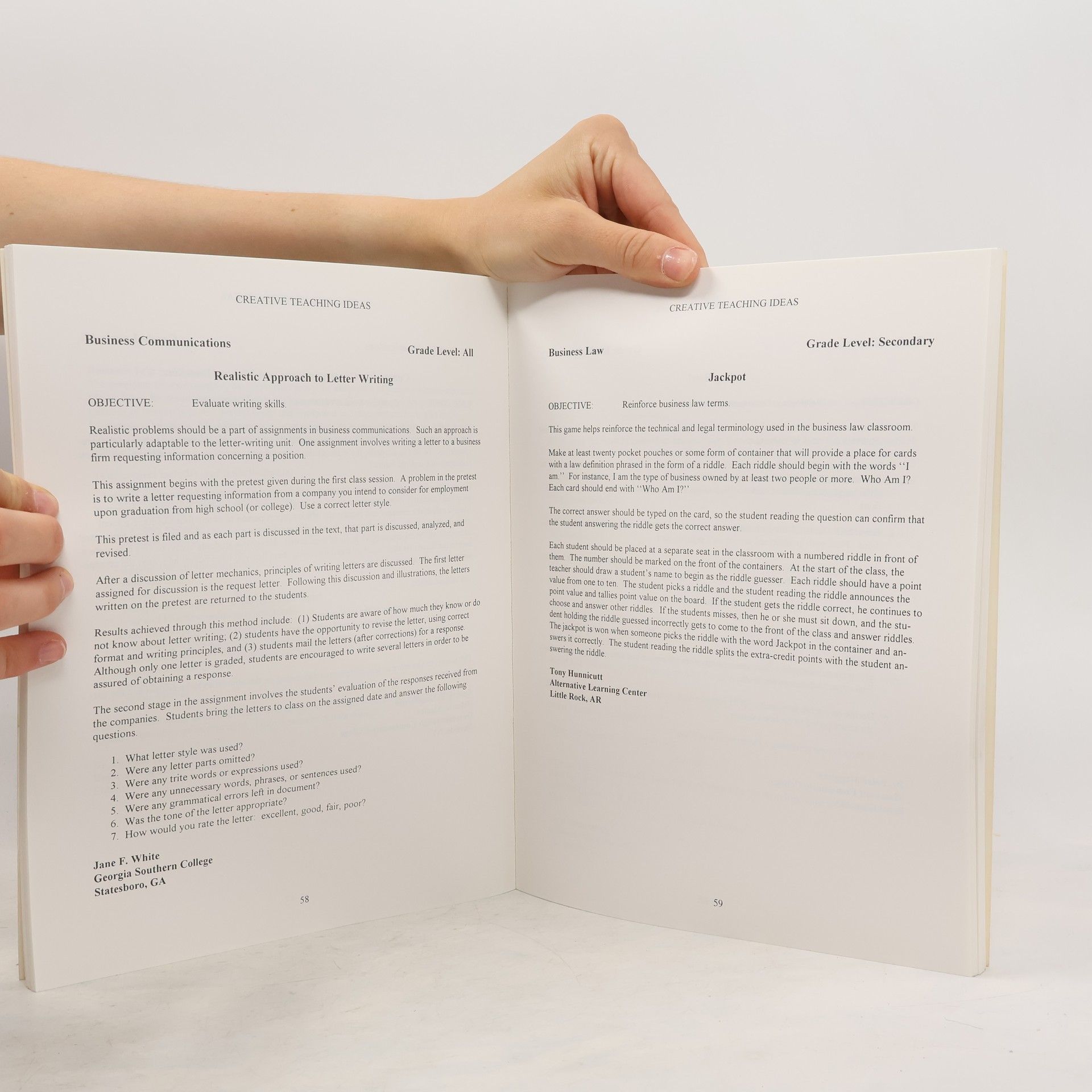 This book contains 172 creative teaching ideas pertaining to various subject areas and aspects of business education. Most of the ideas included are intended for use in secondary and postsecondary classrooms; however, a few are applicable at all grade levels. The teaching ideas are organized according to the following subject areas/topics: accounting (beginning, intermediate, and advanced accounting); administrative management systems (administrative office procedures and dictation/transcription); banking; basic business; business communications; business law; business math; computer technology (database, desktop publishing, electronic mail, information/word processing, spreadsheets, telecommunications, and general); critical thinking skills; economics; entrepreneurship; ergonomics; evaluation; human relations (interviewing and interpersonal skills/relationships); imports/exports; insurance; international business; keyboarding; marketing business education (placement and recruitment and retention); miscellaneous; and professional development (dress, ethics, etiquette, personal finance, professional growth, work attitudes). Each idea is presented on a separate information sheet. Each information sheet contains the following: subject area, grade level, title, objective, step-by-step procedure, and contributor's name and school. A list of contributors is included. (MN)