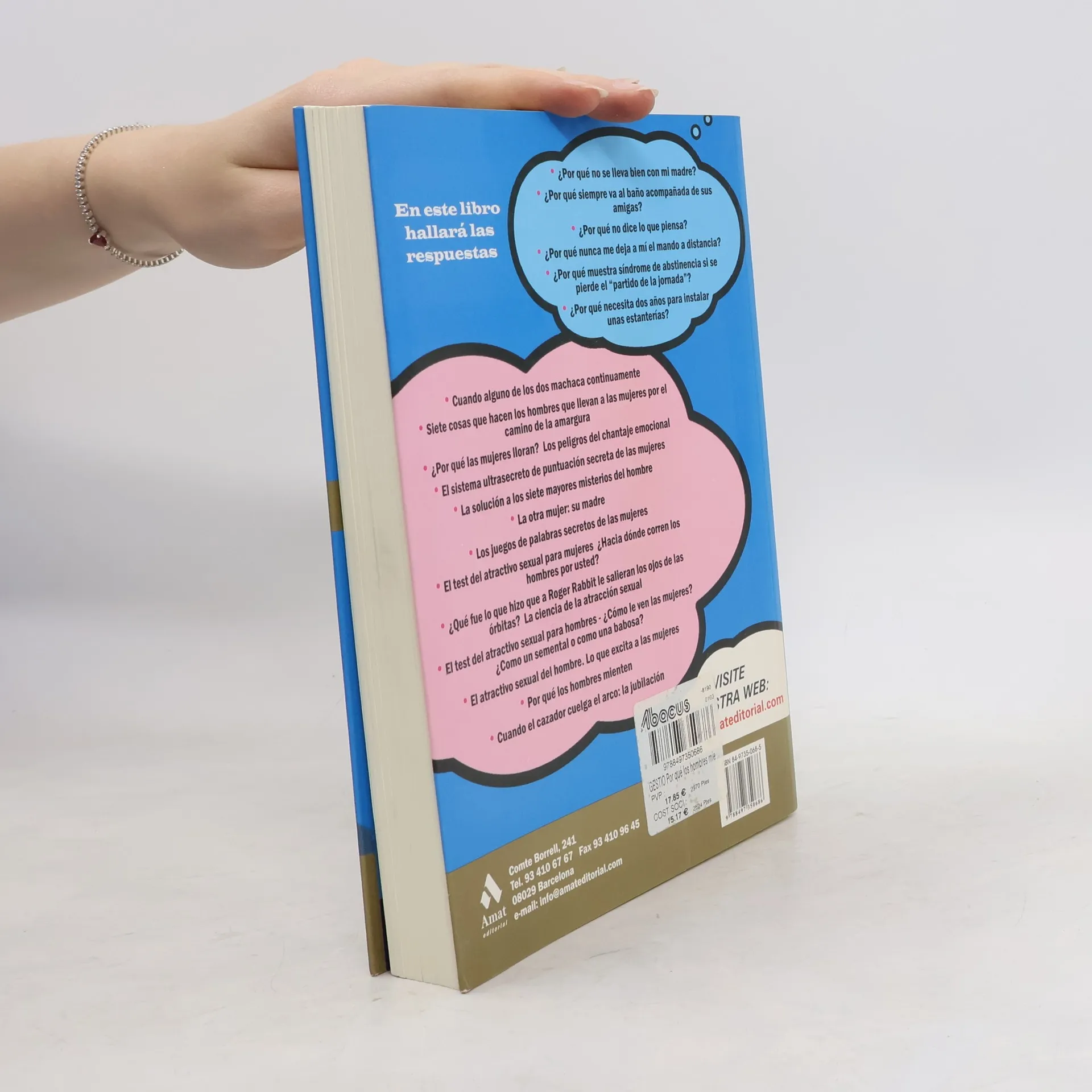 En este libro hallará las respuestas: .¿Por qué no se lleva bien con mi madre? .¿Por qué siempre va al baño acompañada de sus amigas? .¿Por qué no dice lo que piensa? .¿Por qué nunca me deja a mí el mando a distancia? .¿Por qué muestra síndrome de abstinencia si se pierde el “partido de la jornada”? .¿Por qué necesita dos años para instalar unas estanterías? .Cuando alguno de los dos machaca continuamente .Siete cosas que hacen los hombres que llevan a las mujeres por el camino de la amargura .¿Por qué las mujeres lloran? Los peligros del chantaje emocional .El sistema ultrasecreto de puntuación secreta de las mujeres .La solución a los siete mayores misterios del hombre .La otra mujer: su madre .Los juegos de palabras secretos de las mujeres .El test del atractivo sexual para mujeres ¿Hacia dónde corren los hombres por usted? .¿Qué fue lo que hizo que a Roger Rabbit le salieran los ojos de las órbitas? La ciencia de la atracción sexual .El test del atractivo sexual para hombres - ¿Cómo le ven las mujeres? ¿Cómo un semental o como una babosa? .El atractivo sexual del hombre. Lo qué excita a las mujeres .Por qué los hombres mienten .Cuando el cazador cuelga el arco: La jubilación