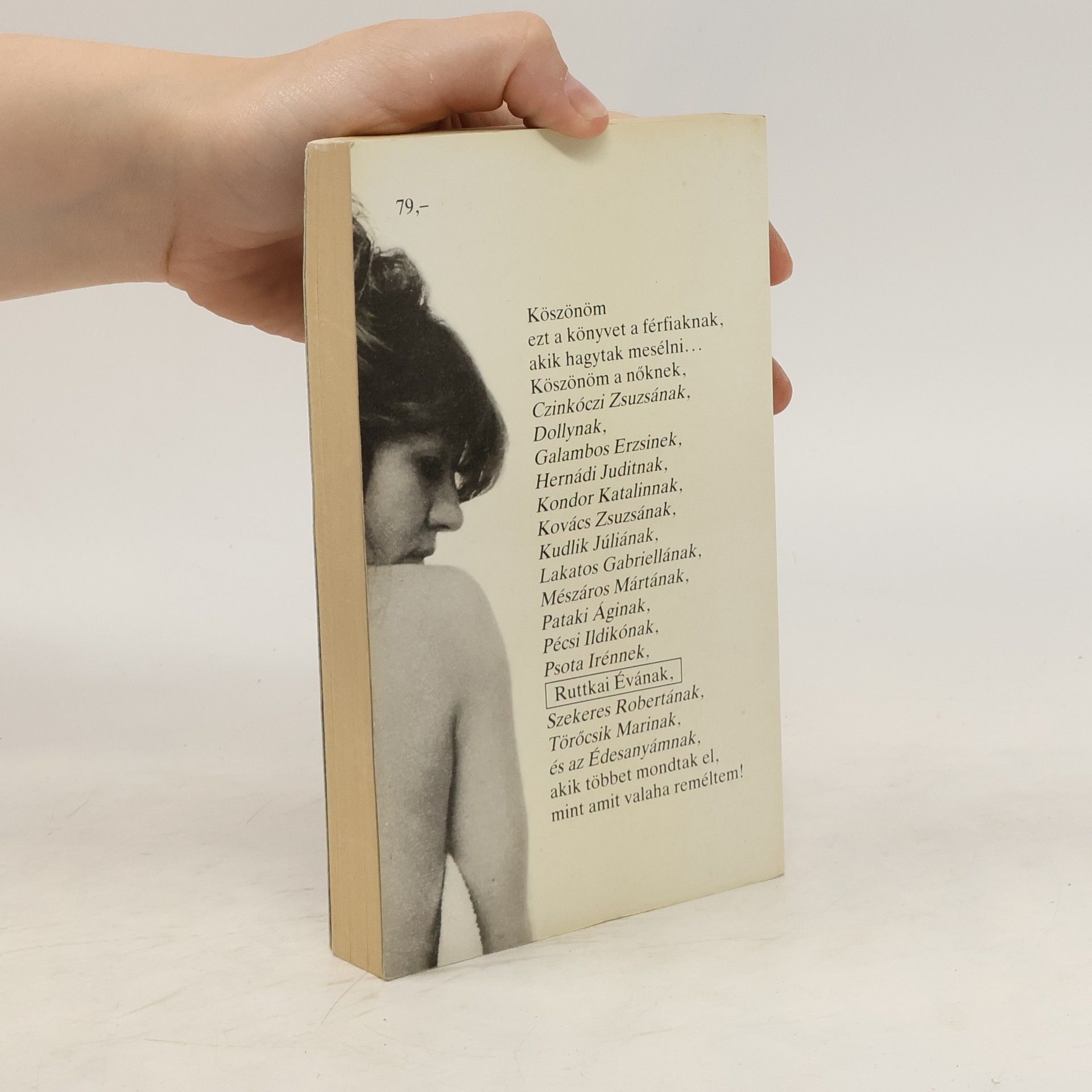 Köszönöm ezt a könyvet a férfiaknak, akik hagytak mesélni…Köszönöm a nőknek, Czinkóczi Zsuzsának, Dollynak, Galambos Erzsinek, Hernádi Juditnak, Kondor Katalinnak, Kovács Zsuzsának, Kudlik Júliának, Lakatos Gabriellának, Mészáros Mártának, Pataki Áginak, Pécsi Ildikónak, Psota Irénnek, Ruttkai Évának, Szekeres Robertának, Törőcsik Marinak és az Édesanyámnak, akik többet mondtak el, mint amit valaha reméltem!