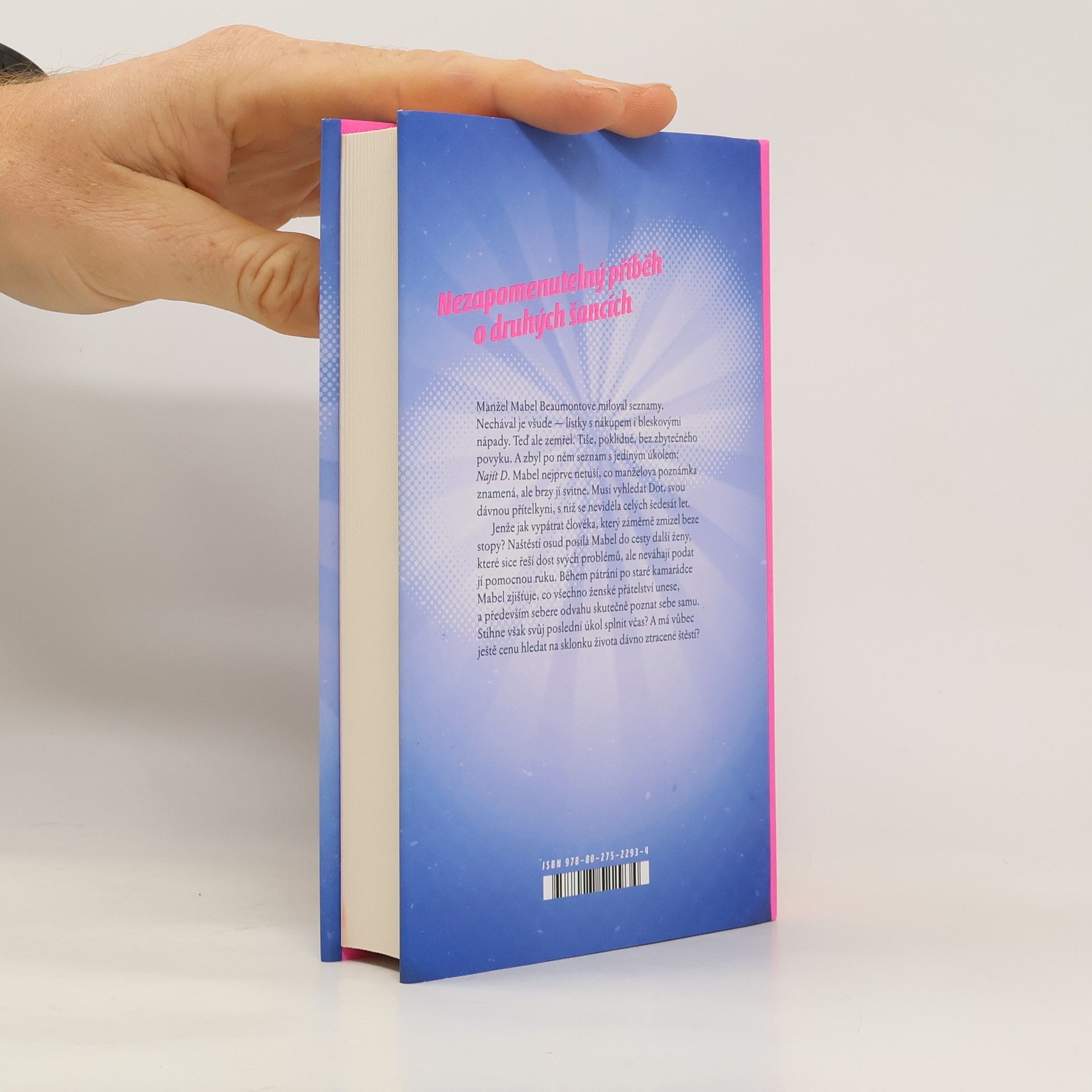 Nezapomenutelný příběh o druhých šancích Manžel Mabel Beaumontové miloval seznamy. Nechával je všude — lístky s nákupem i bleskovými nápady. Teď ale Arthur odešel. Zemřel tiše, poklidně, bez zbytečného povyku. A zbyl po něm seznam s jedním posledním úkolem: „Najít D“. Mabel nejprve netuší, co manželova poznámka znamená, ale brzy jí svitne. Musí vyhledat Dot, svou dávnou přítelkyni, s níž se neviděla celých šedesát let. Jenže jak vypátrat člověka, který záměrně zmizel beze stopy? Naštěstí osud posílá Mabel do cesty další ženy, které sice řeší dost svých problémů, ale neváhají podat pomocnou ruku. Během pátrání po staré kamarádce Mabel zjišťuje, co všechno přátelství mezi ženami unese, a především sebere odvahu skutečně poznat sebe samu. Stihne však svůj poslední úkol splnit včas? A má vůbec ještě cenu na sklonku života hledat dávno ztracené štěstí?