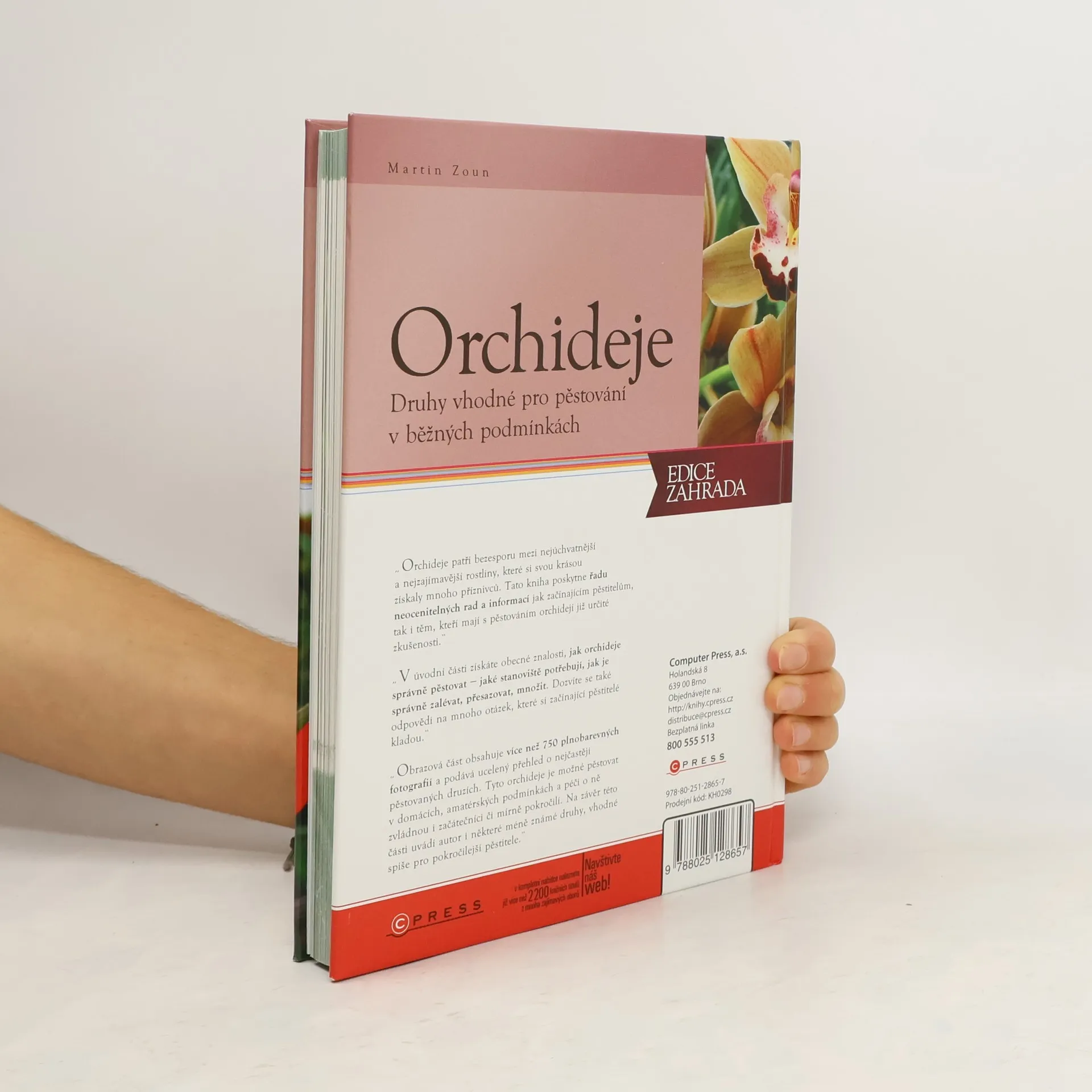 „Orchideje patří bezesporu mezi nejúchvatnější a nejzajímavější rostliny, které si svou krásou získaly mnoho příznivců. Tato kniha poskytne řadu neocenitelných rad a informací jak začínajícím pěstitelům, tak i těm, kteří mají s pěstováním orchidejí již určité zkušenosti.“ „V úvodní části získáte obecné znalosti, jak orchideje správně pěstovat – jaké stanoviště potřebují, jak je správně zalévat, přesazovat, množit. Dozvíte se také odpovědi na mnoho otázek, které si začínající pěstitelé kladou.“ „Obrazová část obsahuje více než 750 plnobarevných fotografií a podává ucelený přehled o nejčastěji pěstovaných druzích. Tyto orchideje je možné pěstovat v domácích, amatérských podmínkách a péči o ně zvládnou i začátečníci či mírně pokročilí. Na závěr této části uvádí autor i některé méně známé druhy, vhodné spíše pro pokročilejší pěstitele.“