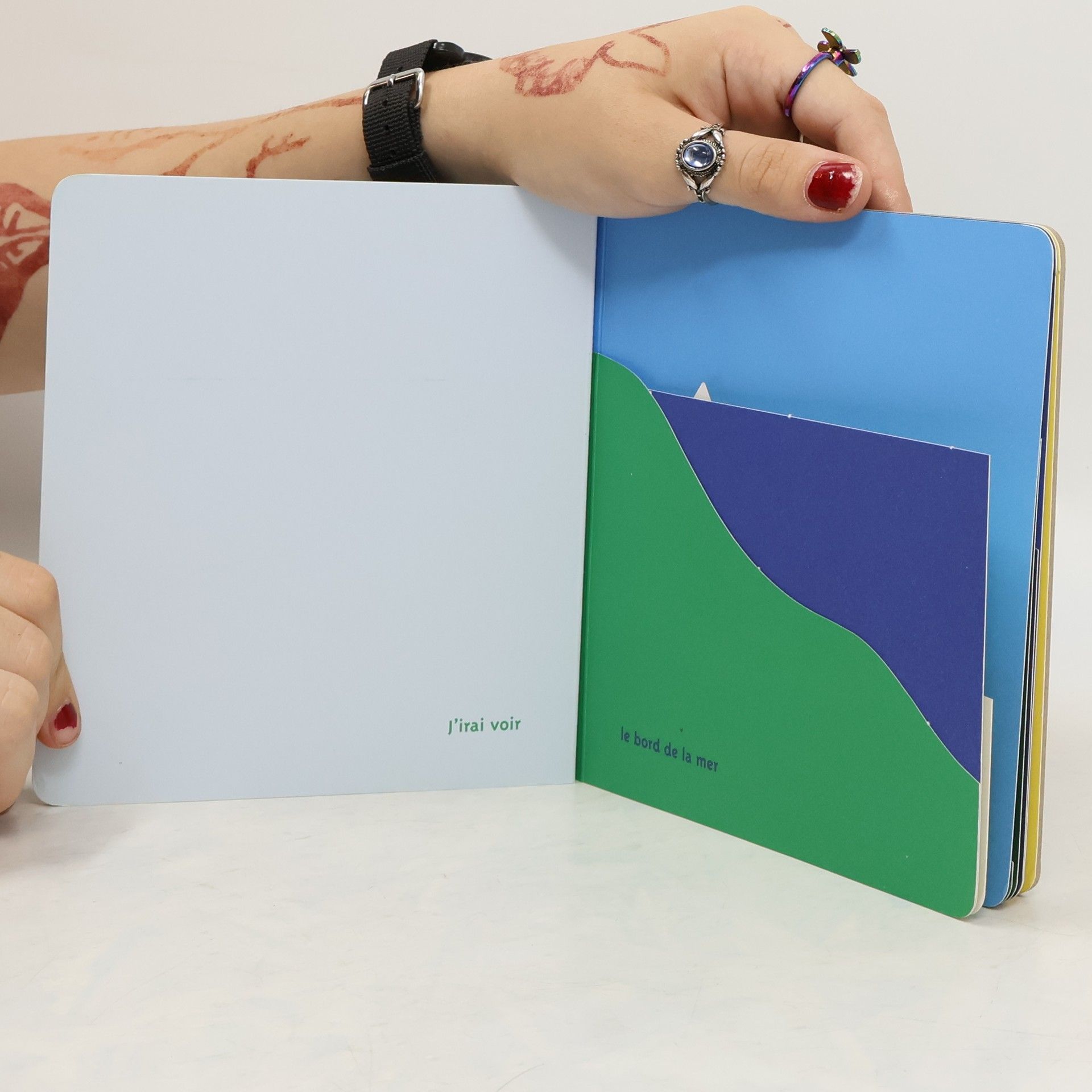 Un grand voyage, tout en couleur et en découpes.J’irai voir… le bord de la mer, la brume, le grand océan, les neiges éternelles, le désert, une île inconnue, une grotte secrète, la forêt, l’espace… puis j’irai me reposer, jusqu’à demain… Voici un voyage étonnant et dépaysant, raconté très simplement avec des aplats de couleurs et des découpes dans les pages. En tournant la page, les formes prennent un sens différent grâce aux superpositions de couleurs : le bord de mer devient la brume, une montagne une dune de sable, la forêt un décor lunaire. Un petit livre objet original et coloré qui ravira les tout-petits lecteurs. J’irai voir reprend le principe de J’aime : des aplats de couleur et des découpes pour faire surgir du sens et de la poésie.