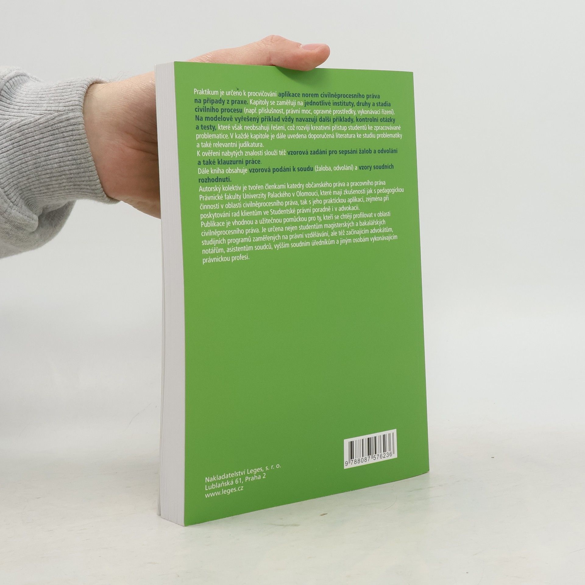 Praktikum je určeno k procvičování aplikace norem civilněprocesního práva na případy z praxe. Kapitoly se zaměřují na jednotlivé instituty, druhy a stadia civilního procesu (např. příslušnost, právní moc, opravné prostředky, vykonávací řízení). Na modelově vyřešený příklad vždy navazují další příklady, kontrolní otázky a testy, které však neobsahují řešení, což rozvíjí kreativní přístup studentů ke zpracovávané problematice. V každé kapitole je dále uvedena doporučená literatura ke studiu problematiky a také relevantní judikatura. K ověření nabytých znalostí slouží též vzorová zadání pro sepsání žalob a odvolání a také klauzurní práce. Dále kniha obsahuje vzorová podání k soudu (žaloba, odvolání) a vzory soudních rozhodnutí. Autorský kolektiv je tvořen členkami katedry občanského práva a pracovního práva Právnické fakulty Univerzity Palackého v Olomouci, které mají zkušenosti jak s pedagogickou činností v oblasti civilněprocesního práva, tak s jeho praktickou aplikací, zejména při poskytování rad klientům ve Studentské právní poradně i v advokacii. Publikace je vhodnou a užitečnou pomůckou pro ty, kteří se chtějí profilovat v oblasti civilněprocesního práva. Je určena nejen studentům magisterských a bakalářských studijních programů zaměřených na právní vzdělávání, ale též začínajícím advokátům, notářům, asistentům soudců, vyšším soudním úředníkům a jiným osobám vykonávajícím právnickou profesi.