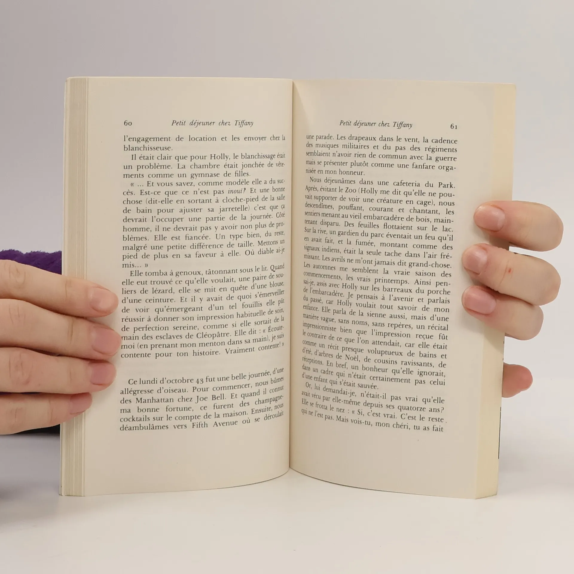 J'avais été au cinéma, j'étais rentré et je m'étais mis au lit avec un grog au rhum et le dernier Simenon. C'était tellement mon idée d'une soirée confortable que je ne parvenais pas à comprendre le sentiment de malaise qui s'amplifia en moi au point que je pouvais entendre les battements de mon cœur... Le sentiment que l'on m'épiait. Que quelqu'un était dans la chambre. Puis il y eut une succession de coups secs sur la vitre, une apparition d'un gris spectral. Je renversai le grog. Il me fallut un certain temps avant que je me décide à ouvrir la fenêtre et à demander à Miss Golightly ce qu'elle voulait. L'histoire de Holiday Golightly, la cover-girl incarnée à l'écran par Audrey Hepburn.