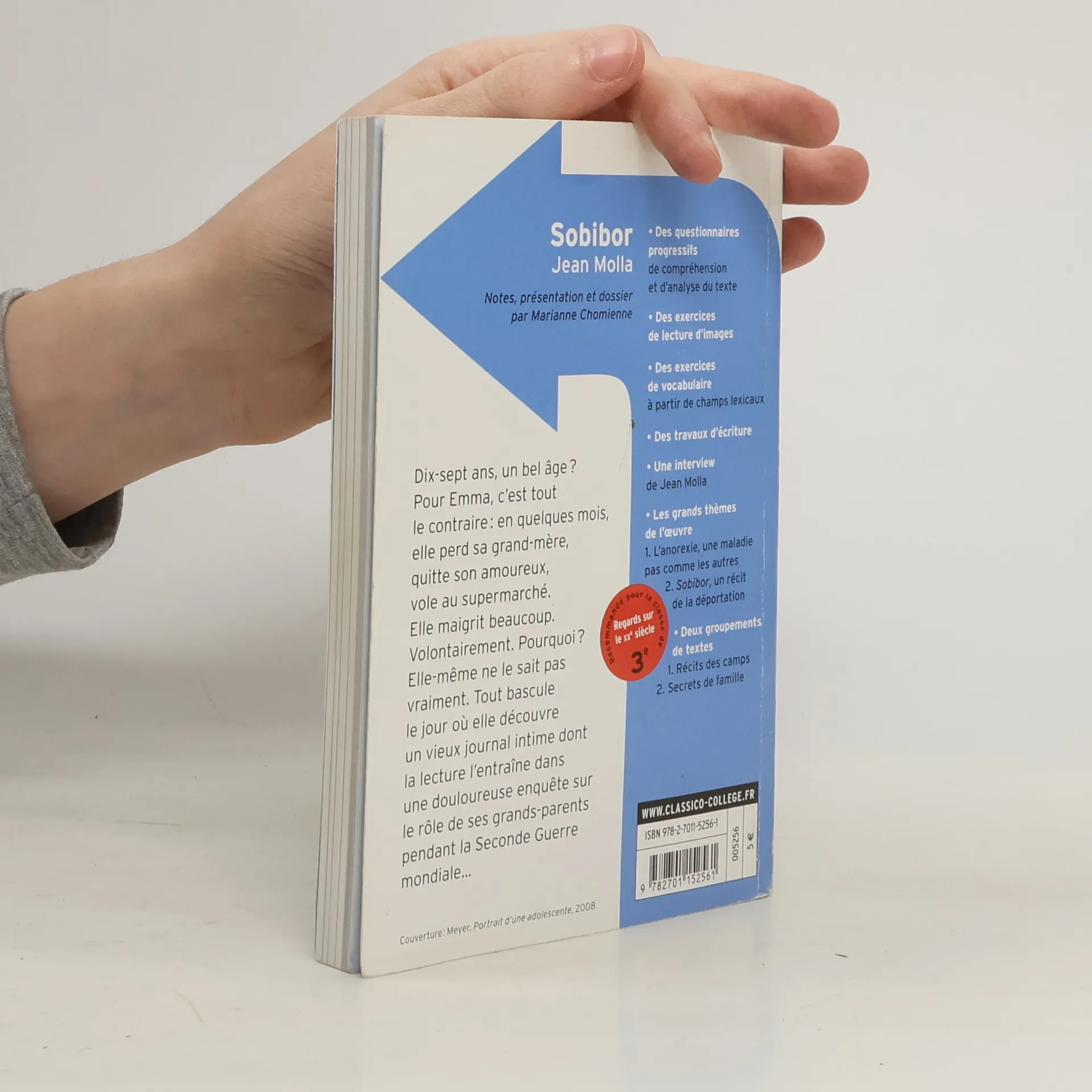 Dix-sept ans, un bel âge ? Pour Emma, c'est tout le contraire : en quelques mois, elle perd sa grand-mère, quitte son amoureux, vole au supermarché. Elle maigrit beaucoup. Volontairement. Pourquoi ? Elle-même ne le sait pas vraiment. Tout bascule le jour où elle découvre un vieux journal intime dont la lecture l'entraîne dans une douloureuse enquête sur le rôle de ses grands-parents pendant la Seconde Guerre mondiale... Des questionnaires progressifs de compréhension et d'analyse du texte. Des exercices de lecture d'images. Des exercices de vocabulaire à partir de champs lexicaux. Des travaux d'écriture. Une interview imaginaire de Jean Molla. Les grands thèmes de l'oeuvre 1. L'anorexie, une maladie pas comme les autres 2. Sobibor, un récit de la déportation. Deux groupements de textes 1. Récits des camps 2. Secrets de famille Recommandé pour la classe de 3e.