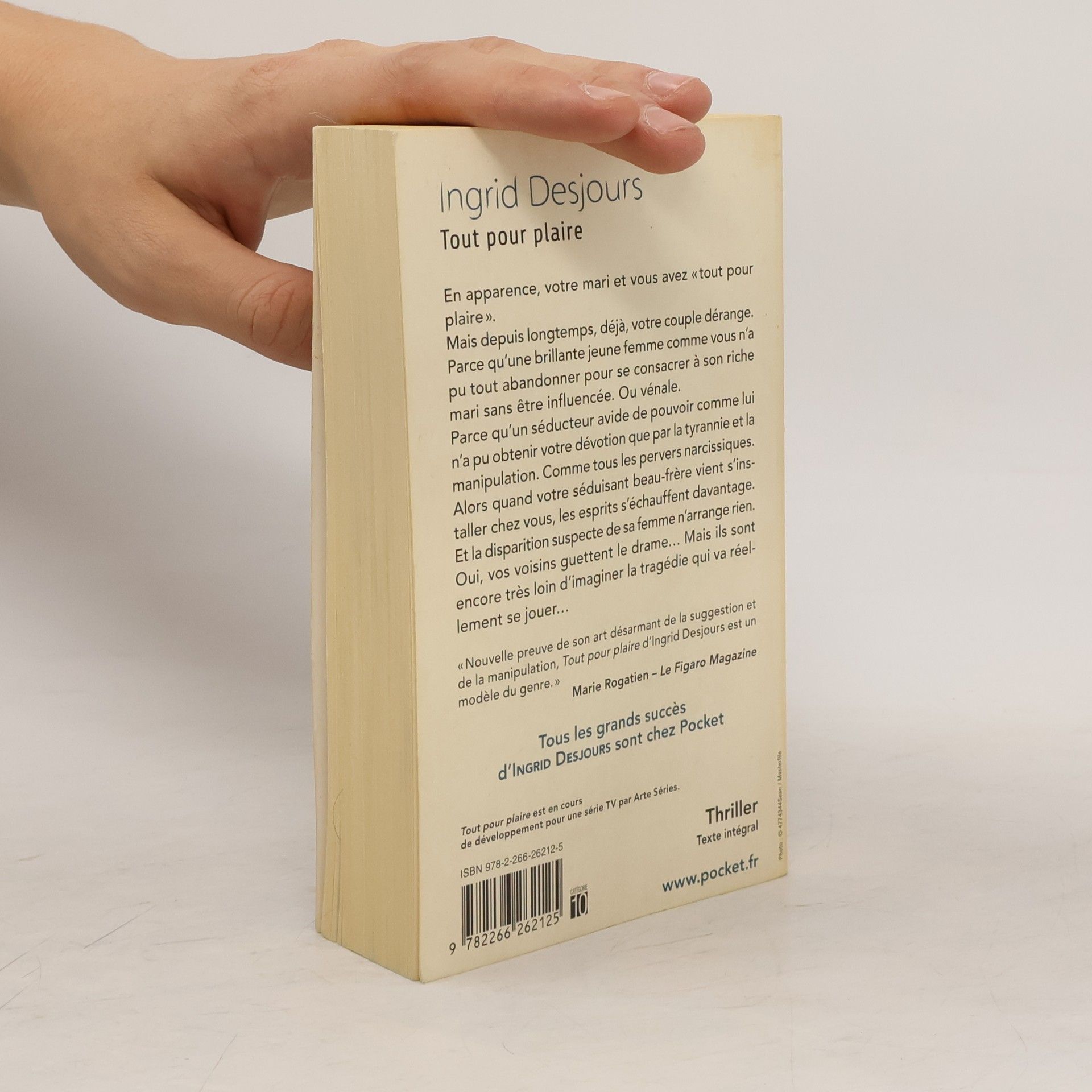 En apparence, votre mari et vous avez « tout pour plaire ». Mais depuis longtemps, déjà, votre couple dérange. Parce qu'une brillante jeune femme comme vous n'a pu tout abandonner pour se consacrer à son riche mari sans être influencée. Ou vénale. Parce qu'un séducteur avide de pouvoir comme lui n'a pu obtenir votre dévotion que par la tyrannie et la manipulation. Comme tous les pervers narcissiques. Alors quand votre séduisant beau-frère vient s'installer chez vous, les esprits s'échauffent davantage. Et la disparition suspecte de sa femme n'arrange rien. Oui, vos voisins guettent le drame... Mais ils sont encore très loin d'imaginer la tragédie qui va réellement se jouer... « Nouvelle preuve de son art désarmant de la suggestion et de la manipulation, Tout pour plaire d'Ingrid Desjours est un modèle du genre. » Marie Rogatien – Le Figaro magazine Tout pour plaire est en cours de développement pour une série TV par Arte Séries.