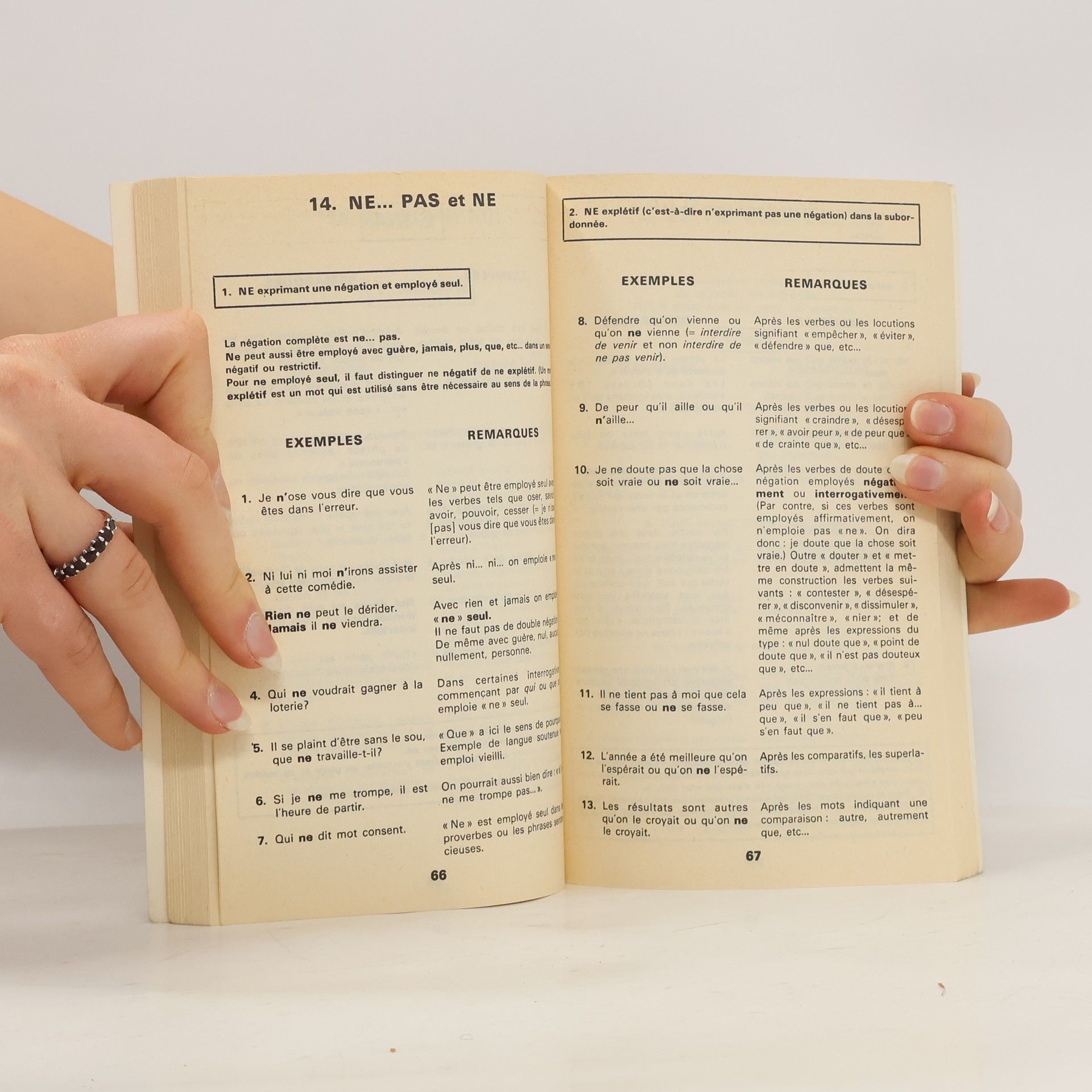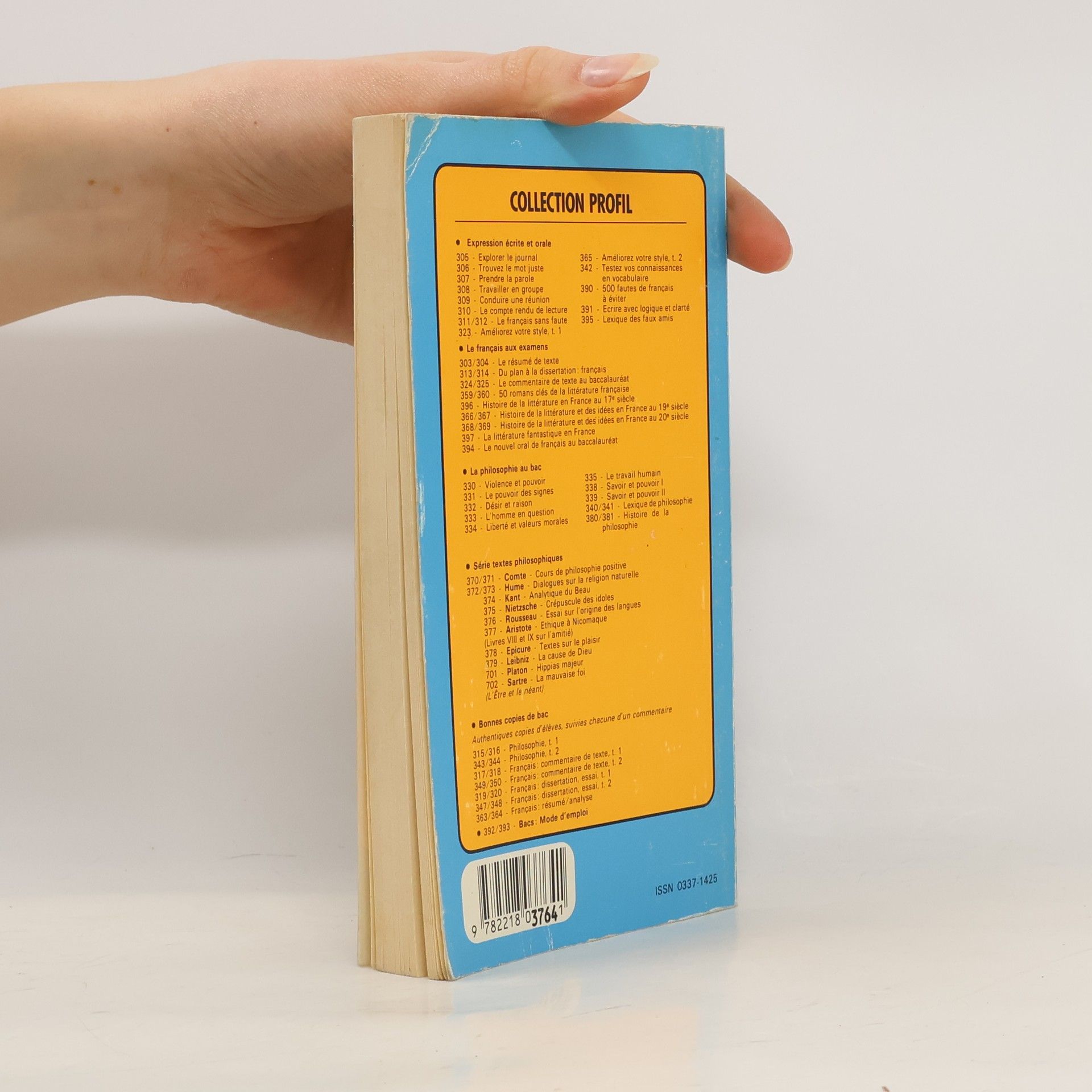 Petit ouvrage à vocation pratique qui permet au lecteur, au moyen d'un index de 1500 entrées (p. 141-159), de résoudre un bon nombre des difficultés essentielles de construction et d'accord. Cinq parties: Les accords - Les constructions - Les cas particuliers (aucun et nul; ou et où?; quel, qu'elle, tel qu'elle, etc.) - L'orthographe d'usage - Les fautes à éviter (pléonasmes, sens abusifs, expressions erronées, etc.). Caractères typographiques contrastés mais très petits.