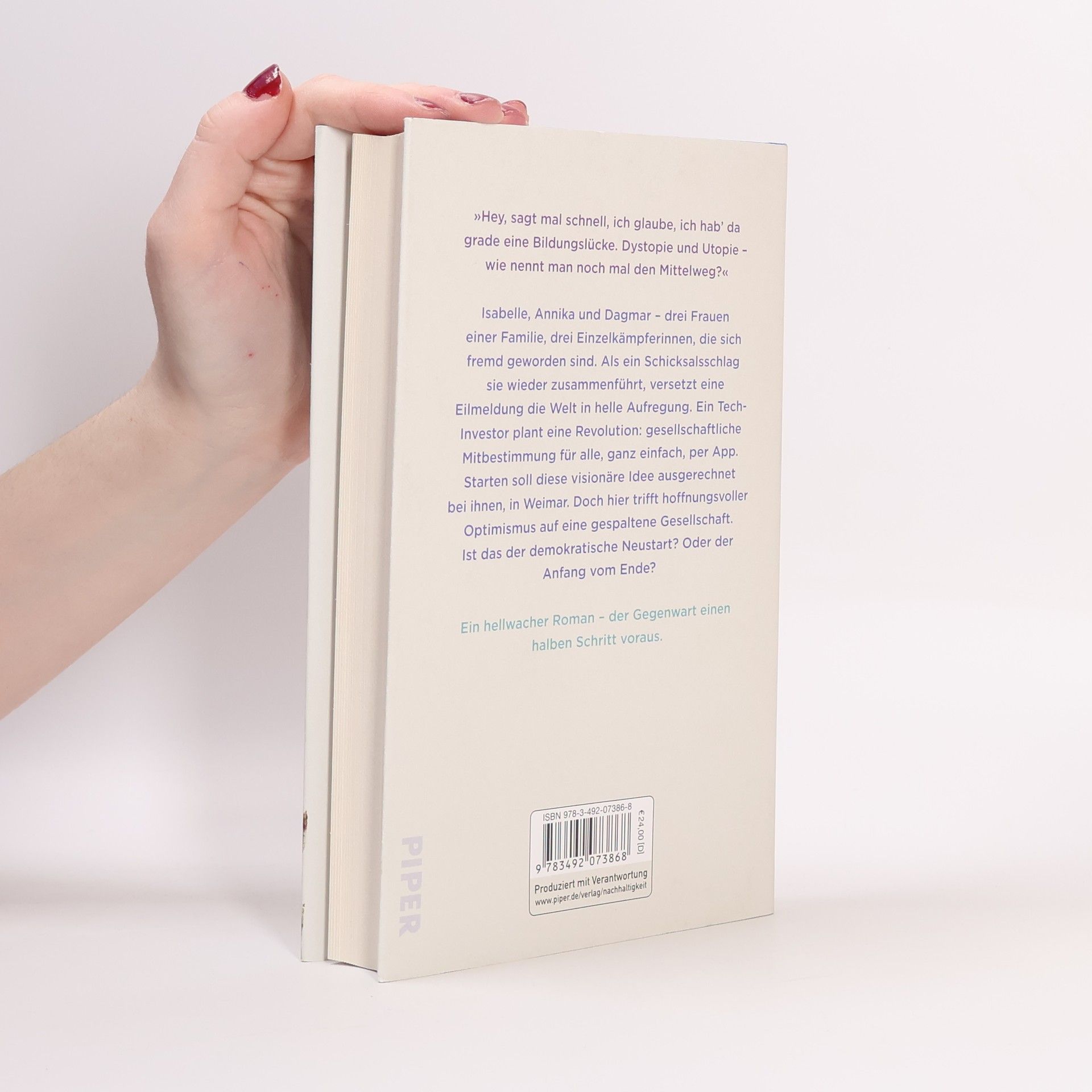 Eine entzweite Familie, ein gespaltenes Land, ein Tech-Milliardär und seine Vision von Gesellschaft Isabelle und Annika haben verlernt, miteinander zu sprechen. Nun, am Sterbebett ihrer Mutter, müssen sie es tun. Auch ihre Tante Dagmar ist da. Drei Frauen, drei Einzelkämpferinnen. Und noch während sie sich an das Gefühl herantasten, als Familie zusammenzugehören, launcht ein internationaler Tech-Milliardär seine Idee einer revolutionär neuen Gemeinschaft. Er will der Gesellschaft ein Update verpassen. Per App. Und alle können sich dabei einbringen. Der Start für das Projekt soll ausgerechnet hier bei ihnen sein: in Weimar. Schon Tage später sind die drei Teil einer öffentlichen Debatte. Denn was da auf sie zukommt, klingt so vielversprechend wie rätselhaft. Ist das der Neustart für die Demokratie? Oder der Anfang vom Ende?