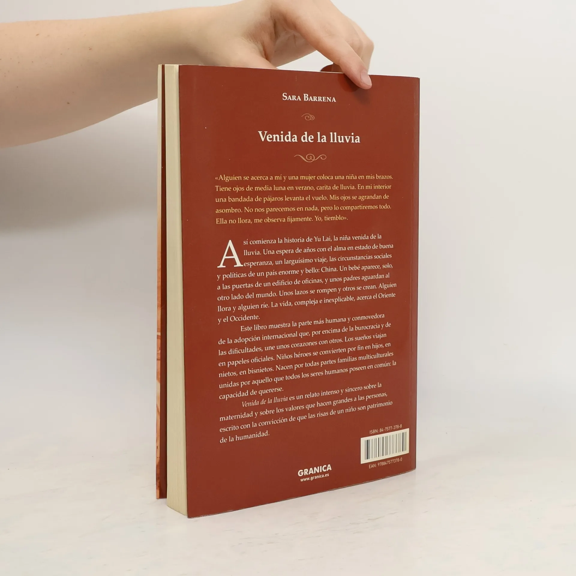 Esta es la historia de Yu Lai, la niña venida de la lluvia. Una espera de años con el alma en estado de buena esperanza, un larguísimo viaje, las circunstancias sociales y políticas de un país enorme y bello: China. Un bebé aparece, solo, a las puertas de un edificio de oficinas, y unos padres aguardan al otro lado del mundo. Unos lazos se rompen y otros se crean. Alguien llora y alguien ríe. La vida, compleja e inexplicable, acerca el Oriente y el Occidente. Este libro muestra la parte más humana y conmovedora de la adopción internacional que, por encima de la burocracia y de las dificultades, une unos corazones con otros. Los sueños viajan en papeles oficiales. Niños héroes se convierten por fin en hijos, en nietos, en bisnietos. Nacen por todas partes familias multiculturales unidas por aquello que todos los seres humanos poseen en común: la capacidad de quererse. Venida de la lluvia es un relato intenso y sincero sobre la maternidad y sobre los valores que hacen grandes a las personas, escrito con la convicción de que las risas de un niño son patrimonio de la humanidad.