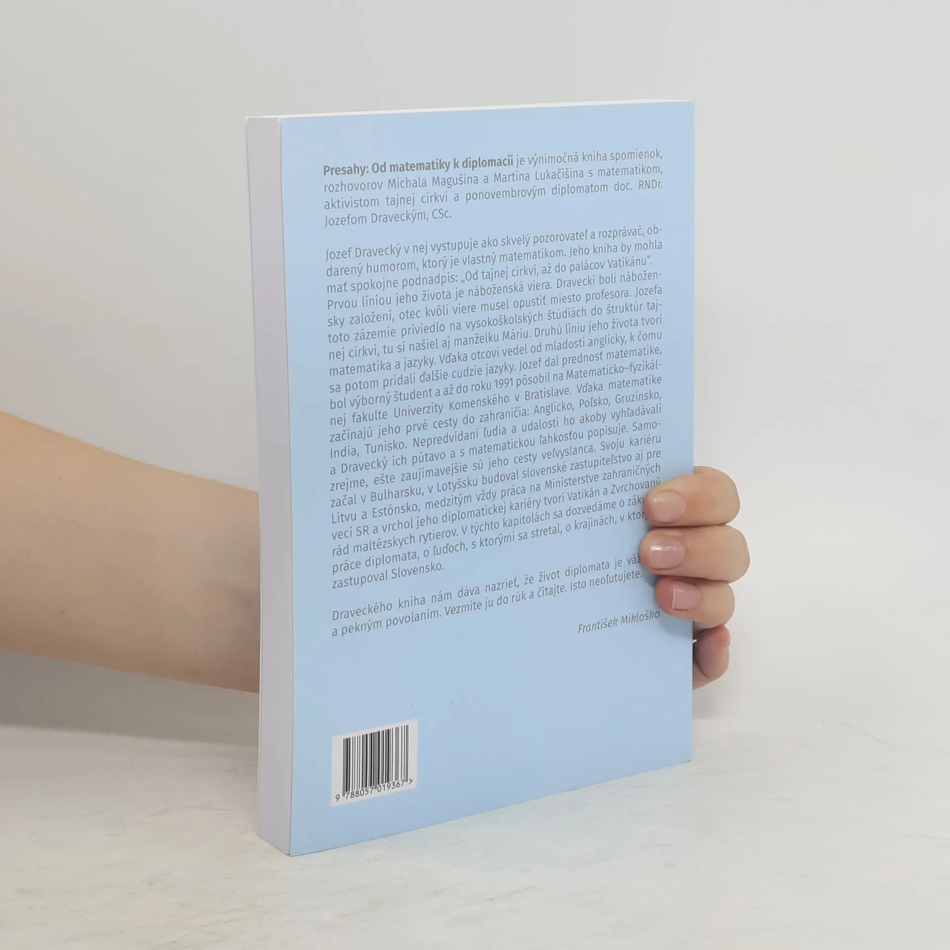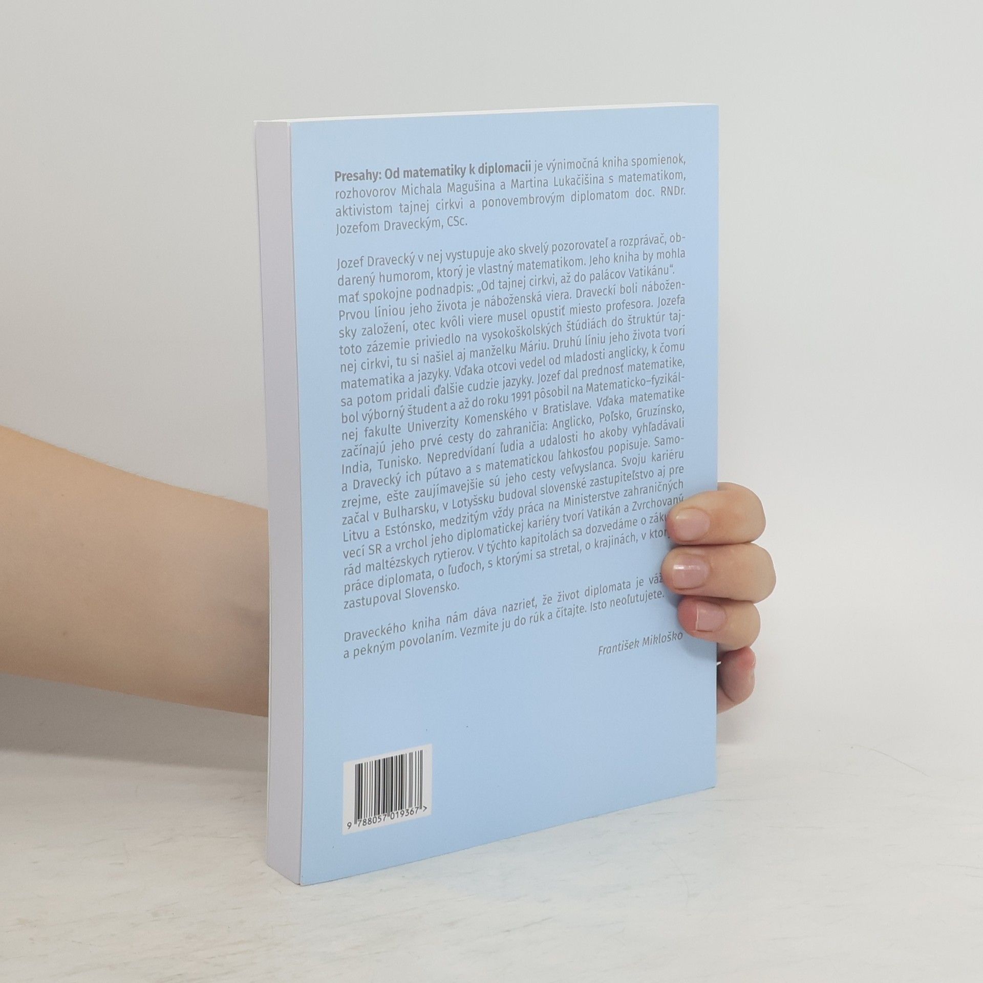 Jozef Dravecký (1947 - ), niekdajší veľvyslanec SR pri Svätej stolici, predtým člen podzemnej cirkvi a matematik, nám v rozhovore s novinárom a moderátorom Michalom Magušinom a Martinom Lukačišinom približuje dôležité etapy svojho profesionálneho i rodinného života. Čitateľa prevedie od svojho detstva v Spišskej Novej Vsi a práce matematika v Bratislave či Tunisku cez rozhodujúce udalosti Novembra, ktoré ho nasmerovali na úspešnú dráhu diplomata, až ku zážitkom zo svojej práce veľvyslanca v Bulharsku, v pobaltských krajinách a vo Vatikáne. Dôraz pritom kladie na presahy medzi jeho osobnými zážitkami a udalosťami s celospoločenským významom. Jeho pozornosť pre detail kombinovaná s pohotovými otázkami životopiscov tak vytvára pútavú mozaiku životných osudov človeka vzájomne sa prelínajúcich s historickými udalosťami našej krajiny.