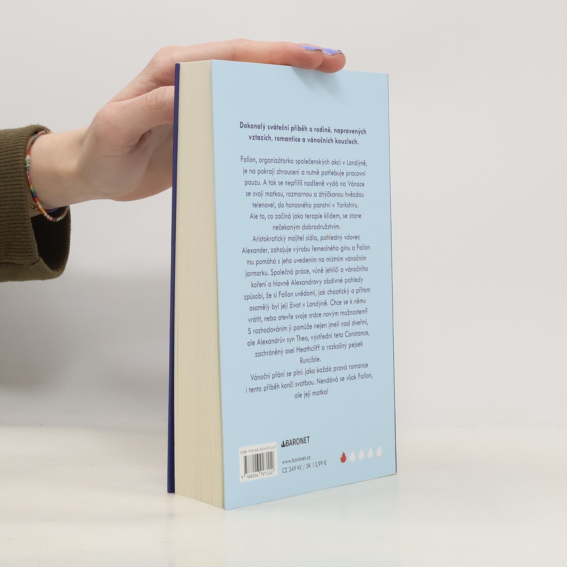Dokonalý sváteční příběh o rodině, napravených vztazích, romantice a vánočních kouzlech. Fallon, organizátorka společenských akcí v Londýně, je na pokraji zhroucení a nutně potřebuje pracovní pauzu. A tak se nepříliš nadšeně vydá na Vánoce se svojí matkou, rozmarnou a zhýčkanou hvězdou telenovel, do honosného panství v Yorkshiru. Ale to, co začíná jako terapie klidem, se stane nečekaným dobrodružstvím. Aristokratický majitel sídla, pohledný vdovec Alexander, zahajuje výrobu řemeslného ginu a Fallon mu pomáhá s jeho uvedením na místním vánočním jarmarku. Společná práce, vůně jehličí a vánočního koření a hlavně Alexandrovy obdivné pohledy způsobí, že si Fallon uvědomí, jak chaotický a přitom osamělý byl její život v Londýně. Chce se k němu vrátit nebo otevře svoje srdce novým možnostem? S rozhodováním jí pomůže nejen jmelí nad dveřmi, ale Alexandrův syn Theo, výstřední teta Constance, zachráněný osel Heathcliff a rozkošný pejsek Runcible. Vánoční přání se plní: jako každá pravá romance i tento příběh končí svatbou. Nevdává se však Fallon, ale její matka!