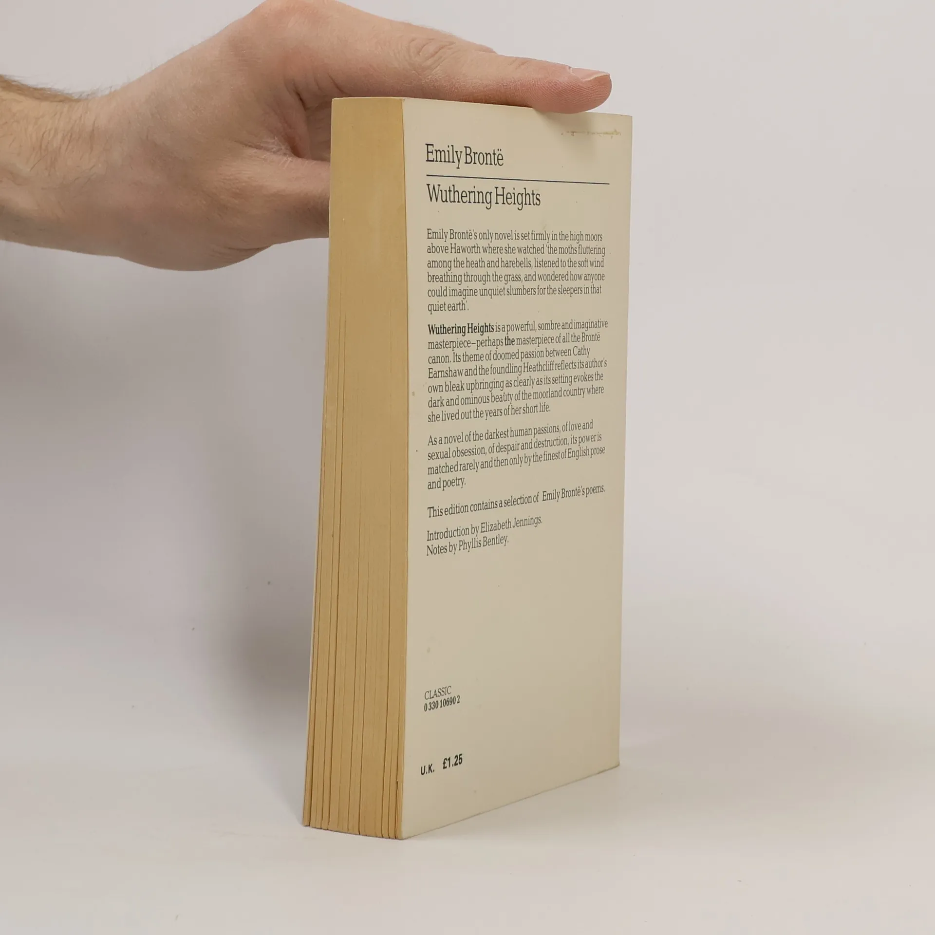 Emily Bronté's only novel is set firmly in the high moors above Haworth where she watched 'the moths fluttering among the heath and harebells, listened to the soft wind breathing through the grass, and wondered how anyone could imagine unquiet slumbers for the sleepers in that quiet earth'. Wuthering Heights is a powerful, sombre and imaginative masterpiece—perhaps the masterpiece of all the Bronté canon. Its theme of doomed passion between Cathy Earnshaw and the foundling Heathcliff reflects its author's own bleak upbringing as clearly as its setting evokes the dark and ominous beauty of the moorland country where she lived out the years of her short life. As a novel of the darkest human passions, of love and sexual obsession, of despair and destruction, its power is matched rarely and then only by the finest of English prose and poetry. This edition contains a selection of Emily Bronté's poems. Introduction by Elizabeth Jennings. Notes by Phyllis Bentley. --back cover