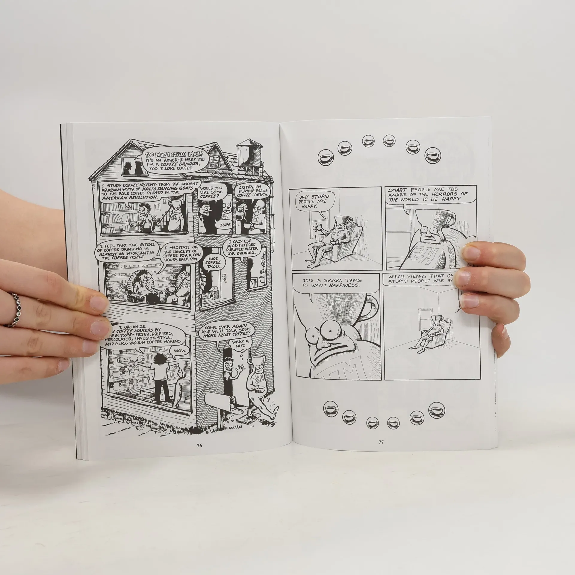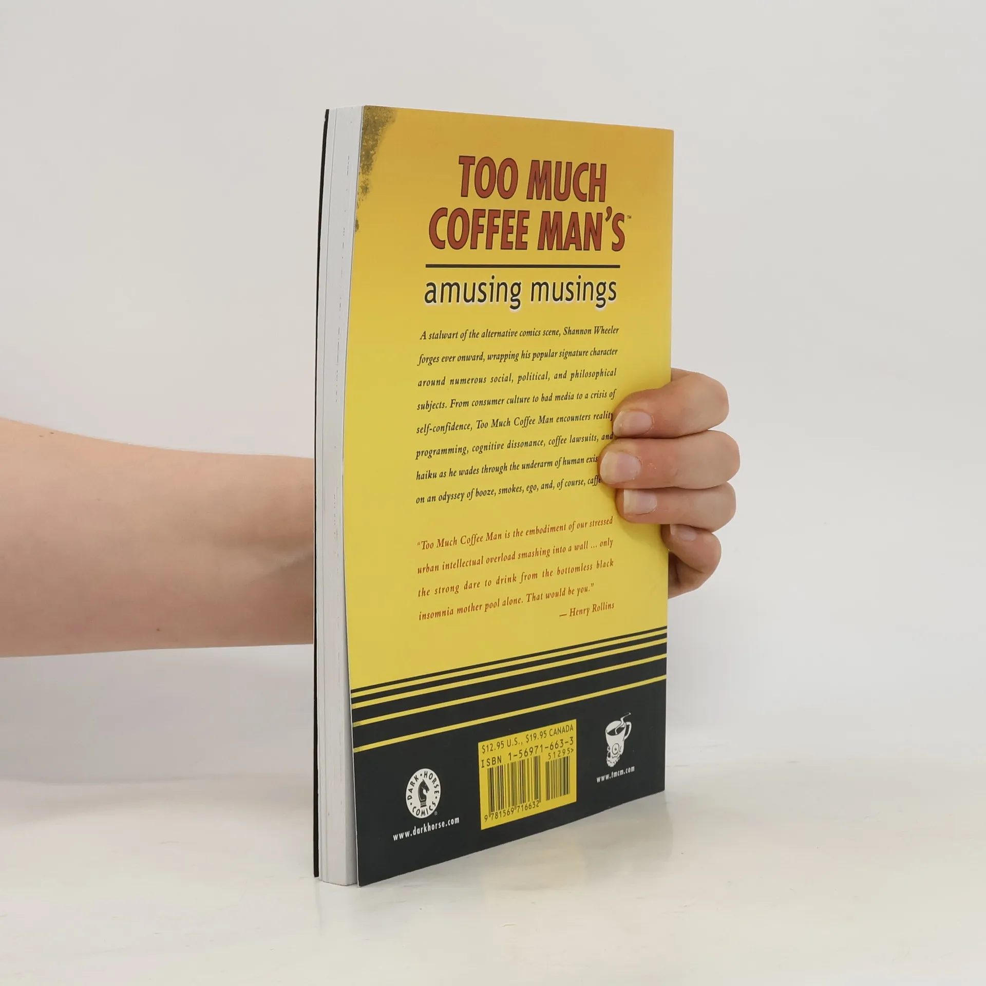 A stalwart of the alternative comics scene, Shannon Wheeler has forged ever forward, wrapping his acerbic signature character around numerous social, political, and philosophical subjects. From consumer culture to self-confidence to bad media, Too Much Coffee Man wades through the underarm of human existence, centering on those habits we hate to liquor, cigarettes, ego, gambling, and, of course, caffeine. Observe Too Much Coffee Man as he encounters reality programming, cognitive dissonance, waifish supermodels, infotainment, hot McDonalds' coffee, and haiku.