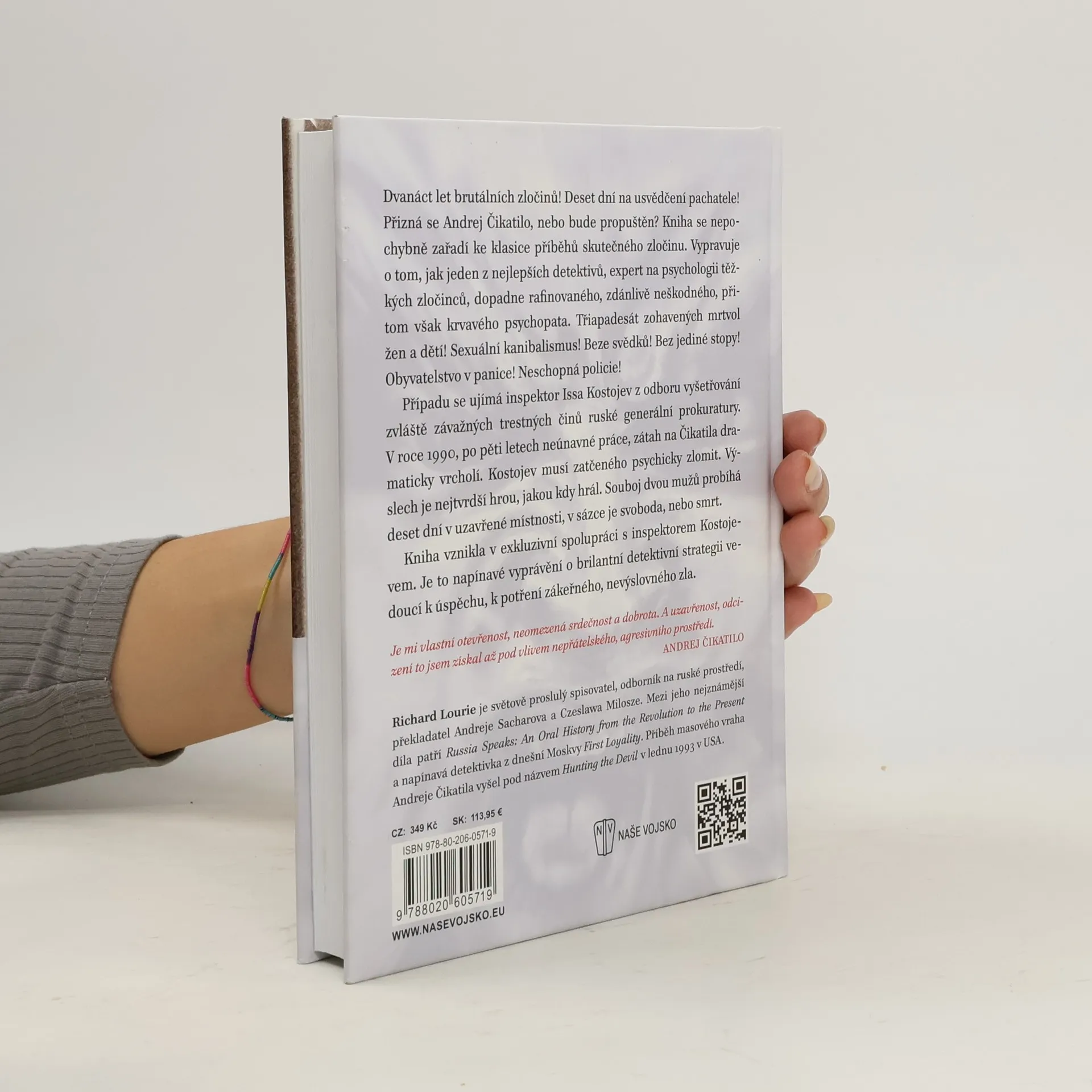 Dvanáct let brutálních zločinů! Deset dní na usvědčení pachatele! Přizná se Andrej Čikatilo, nebo bude propuštěn? Kniha se nepochybně zařadí ke klasice příběhů skutečného zločinu. Vypravuje o tom, jak jeden z nejlepších detektivů, expert na psychologii těžkých zločinců, dopadne rafinovaného, zdánlivě neškodného, přitom však krvavého psychopata. Třiapadesát zohavených mrtvol žen a dětí! Sexuální kanibalismus! Beze svědků! Bez jediné stopy! Obyvatelstvo v panice! Neschopná policie! Případu se ujímá inspektor Issa Kostojev z odboru vyšetřování zvláště závažných trestných činů ruské generální prokuratury. V roce 1990, po pěti letech neúnavné práce, zátah na Čikatila dramaticky vrcholí. Kostojev musí zatčeného psychicky zlomit. Výslech je nejtvrdší hrou, jakou kdy hrál. Souboj dvou mužů probíhá deset dní v uzavřené místnosti, v sázce je svoboda, nebo smrt. Kniha vznikla v exkluzivní spolupráci s inspektorem Kostojevem. Je to napínavé vyprávění o brilantní detektivní strategii vedoucí k úspěchu, k potření zákeřného, nevýslovného zla. Je mi vlastní otevřenost, neomezená srdečnost a dobrota. A uzavřenost, odcizeníto jsem získal až pod vlivem nepřátelského, agresivního prostředí.