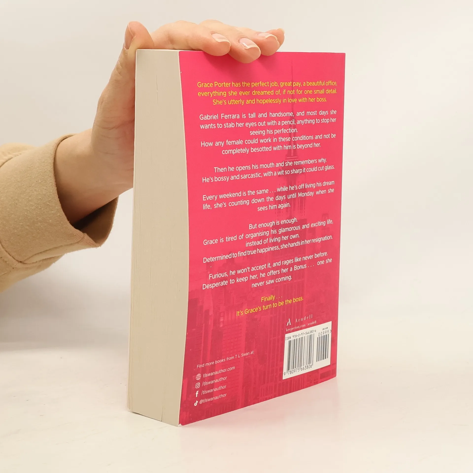 From Wall Street Journal, BookTok, and #1 Amazon bestselling author T L Swan comes the sizzling story of Gabriel Ferrara and Grace Porter. Bonus chapters included in this exclusive paperback edition! Grace Porter has the perfect job, great pay, a beautiful office, everything she ever dreamed of, if not for one small detail. She's utterly and hopelessly in love with her boss. Gabriel Ferrara is tall and handsome, and most days she wants to stab her eyes out with a pencil, anything to stop her seeing his perfection. How any female could work in these conditions and not be completely besotted with him is beyond her. Then he opens his mouth and she remembers why. He's bossy and sarcastic, with a wit so sharp it could cut glass. Every weekend is the same . . . while he's off living his dream life, she's counting down the days until Monday when she sees him again. But enough is enough. Grace is tired of organising his glamorous and exciting life, instead of living her own. Determined to find true happiness, she hands in her resignation. Furious, he won't accept it, and rages like never before. Desperate to keep her, he offers her a Bonus . . . one she never saw coming. Finally . . . It's Grace's turn to be the boss.
