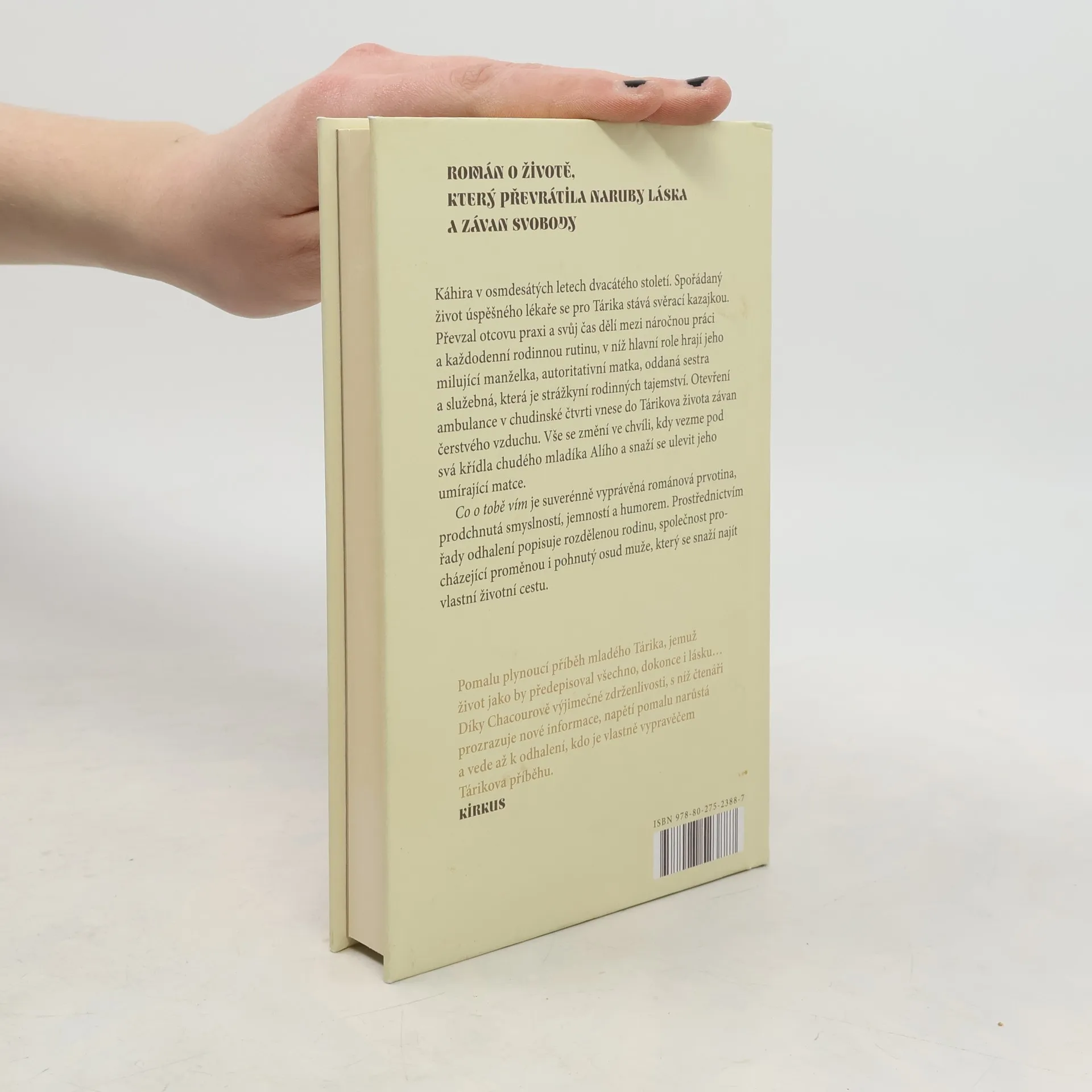 Káhira v osmdesátých letech dvacátého století. Spořádaný život se pro mladého lékaře Tárika stal svěrací kazajkou. Převzal otcovu lékařskou praxi, dělí svůj čas mezi náročnou práci a každodenní rodinou rutinu, v níž hlavní roli hraje jeho milující manželka, autoritativní matka, důvěřivá sestra a služebná, která je strážkyní rodinných tajemství. Otevření ambulance v chudinské čtvrti vnese do Tárikova života závan čerstvého vzduchu. Vše se mění ve chvíli, kdy vezme pod svá křídla chudého mladíka Alího a mezi oběma muži se rozvine nevyřčený vztah, který hrozí rozvrátit Tárikovu rodinu. Co o tobě vím je pečlivě zpracovaná románová prvotina, prodchnutá humorem, smyslností a jemností. Prostřednictvím řady odhalení, brilantně vydestilovaných odvážným vyprávěním, popisuje rozdělenou rodinu, společnost procházející proměnou a pohnutý osud muže, který hledá svou pravdu.