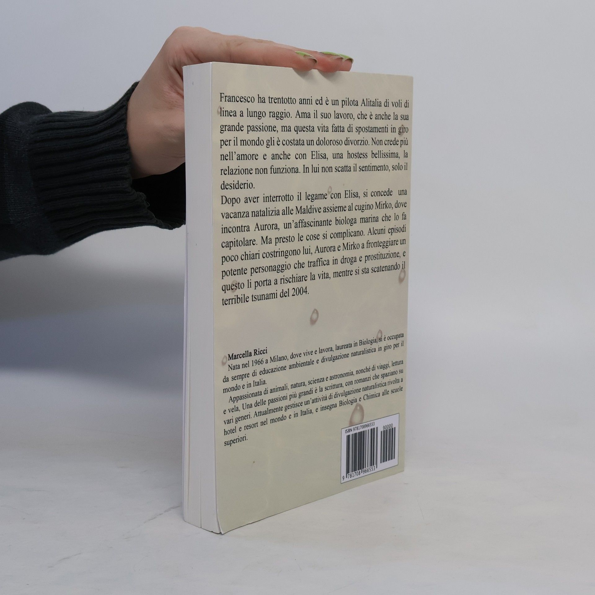 Francesco ha trentotto anni ed è un pilota Alitalia di voli di linea a lungo raggio; ama il suo lavoro, che è anche la sua grande passione, ma questa vita fatta di spostamenti in giro per il mondo gli è costata un doloroso divorzio. Non crede più nell’amore e anche con Elisa, una hostess bellissima, la relazione non funziona. In lui non scatta il sentimento, solo il desiderio. Dopo aver interrotto il legame con Elisa, durante una lunga vacanza natalizia alle Maldive con il cugino Mirko, incontrerà Aurora, un’affascinante biologa marina che lo farà capitolare, anche se le avversità si faranno presto Francesco deve tornare al lavoro, in Italia, dopo la vacanza. Inoltre alcuni episodi poco chiari sull’isola costringono lui, Aurora e Mirko a fronteggiare un potente personaggio che traffica in droga e prostituzione, e questo li porta a rischiare la vita mentre si sta scatenando il terribile tsunami del 2004.Marcella RicciNata nel 1966 a Milano, dove vive e lavora, laureata in Biologia, si è occupata da sempre di educazione ambientale e divulgazione naturalistica in giro per il mondo e in Italia.Appassionata di animali, natura, scienza e astronomia, nonché di viaggi, lettura e vela, Una delle passioni più grandi è la scrittura, con romanzi che spaziano su vari generi. Attualmente gestisce un’attività di divulgazione naturalistica rivolta a hotel e resort nel mondo e in Italia, e insegna Biologia e Chimica alle scuole superiori.