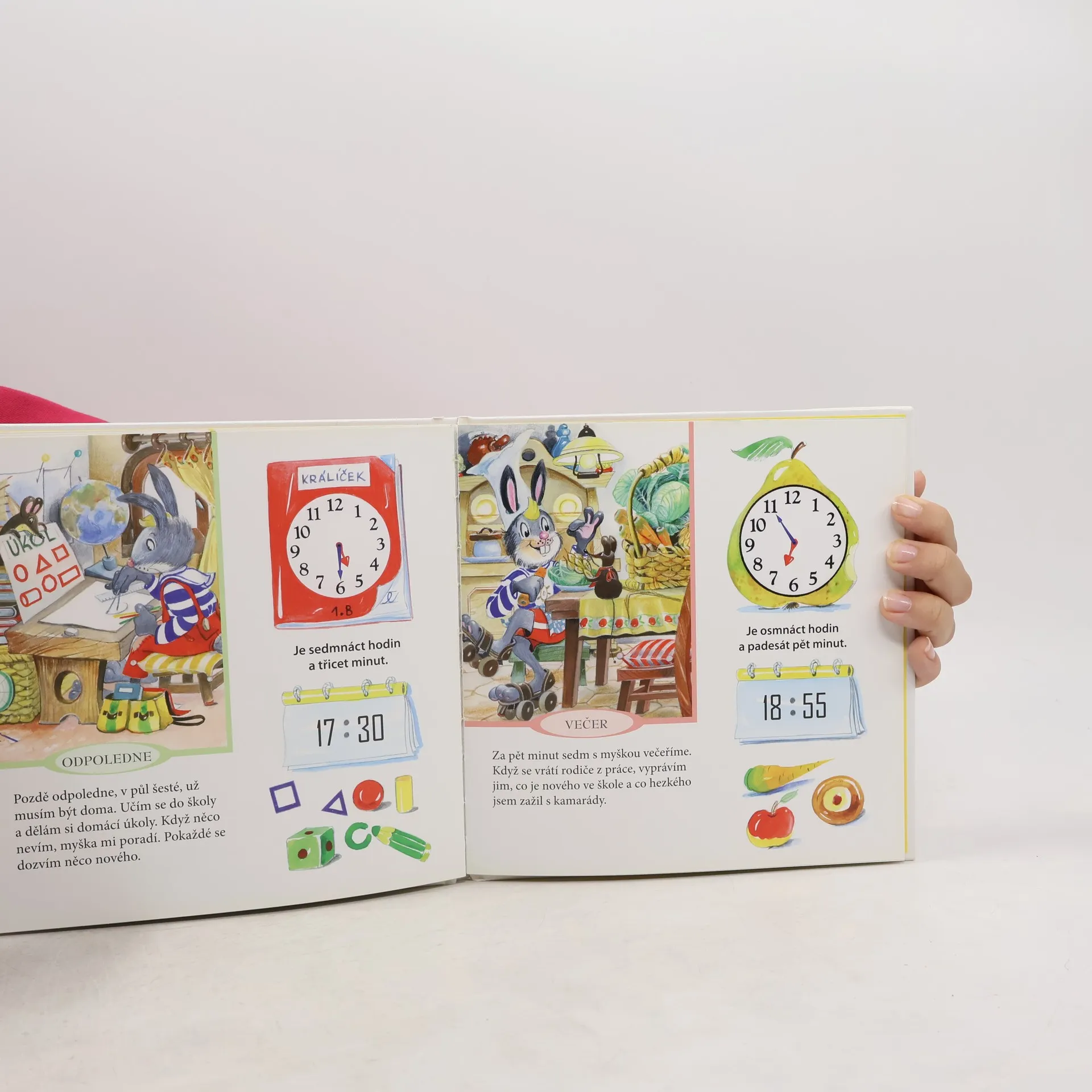 S pomocí králíčka a jeho kamarádky myšky se předškoláci a malí školáci naučí rozeznávat čas na hodinách a také pochopí, jak je důležité členění dne. Prostřednictvím konkrétních situací poznají, že v různých denních dobách se lidé věnují různým činnostem. Veselé barevné ilustrace hravým způsobem doplňují krátký, názorný text, v němž králíček vypráví, co zrovna dělá. V závěru knihy najdete naučné stránky, kde si děti mohou formou hry všechno procvičit.