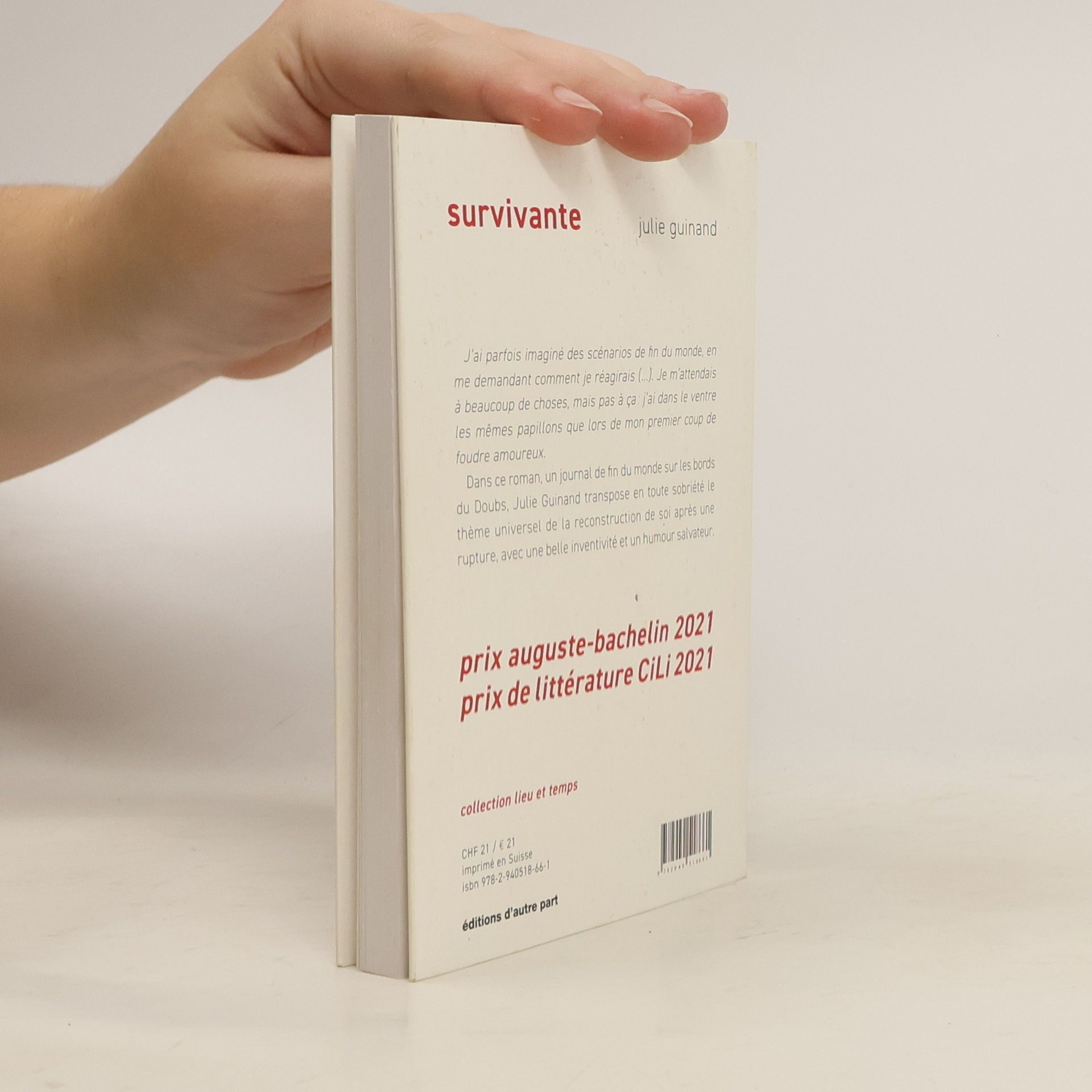 «J'ai parfois imaginé des scénarios de fin du monde, en me demandant comment je réagirais, quelles forces nouvelles je me découvrirais, à quelles actions mon instinct de survie me pousserait. Je m'attendais à beacoup de choses: l'état de choc et l'hébétude qui s'ensuit, le froid, le silence, la peur, le manque. Je m'attendais à beaucoup de choses, mais pas à ça: j'ai dans le ventre les mêmes papillons que lors de mon premier coup de foudre amoureux.»Dans ce roman, un journal de fin du monde sur les bords du Doubs, Julie Guinant transpose en toute sobriété le thème universel de la reconstruction de soi après une rupture, avec une belle inventivité et un humour salvateur.