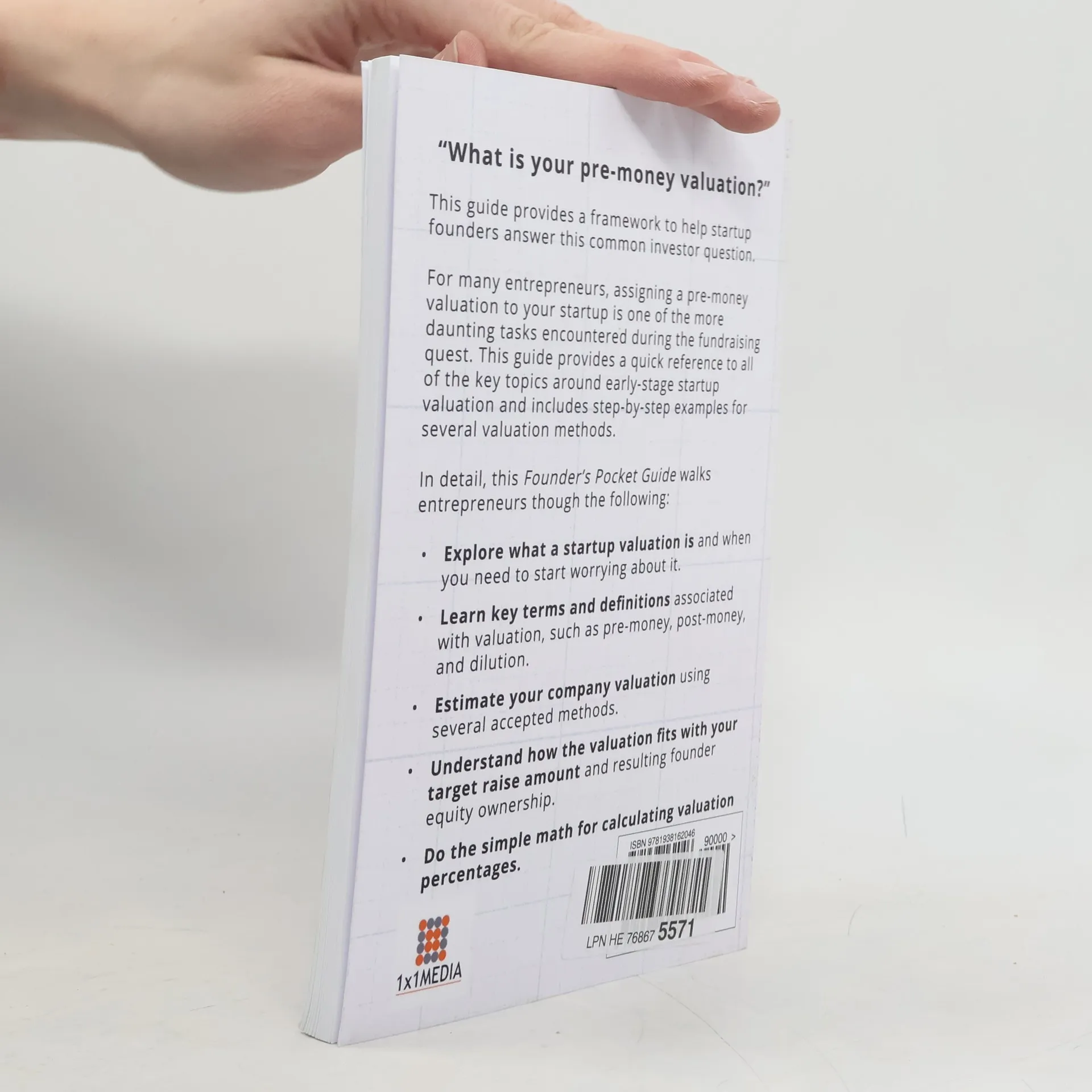 This updated edition includes several new features, including: · The Startup Valuation Explorer · Expanded coverage of Valuation Methods · Responding to investor questions about your valuation · Understanding option pool impact on your valuation For many early-stage entrepreneurs assigning a pre-money valuation to your startup is one of the more daunting tasks encountered during the fundraising quest. This guide provides a quick reference to all of the key topics around early-stage startup valuation and provides step-by-step examples for several valuation methods. This Founder’s Pocket Guide helps startup founders learn: • What a startup valuation is and when you need to start worrying about it. • Key terms and definitions associated with valuation, such as pre-money, post-money, and dilution. • How investors view the valuation task, and what their expectations are for early-stage companies. • How the valuation fits with your target raise amount and resulting founder equity ownership. • How to do the simple math for calculating valuation percentages. • How to estimate your company valuation using several accepted methods. • What accounting valuation methods are and why they are not well suited for early-stage startups.