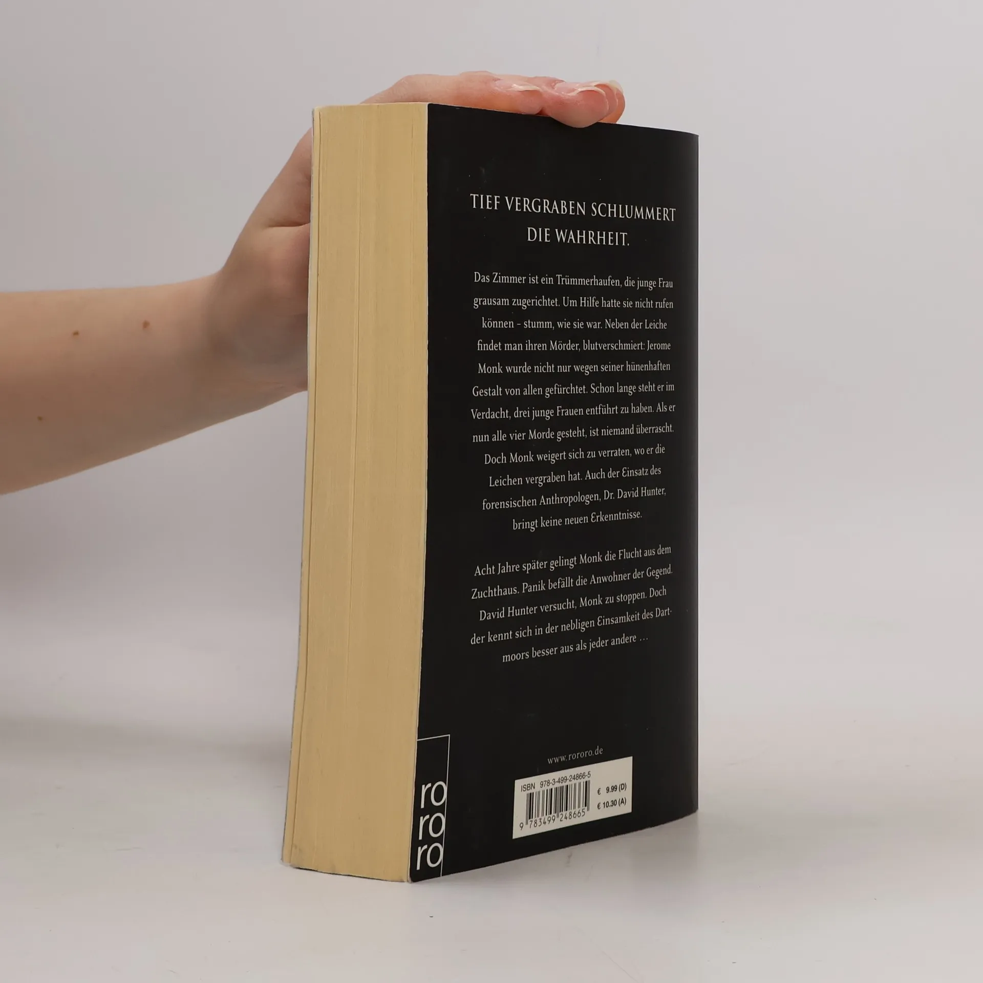 Tief vergraben schlummert die Wahrheit. Das Zimmer ist ein Trümmerhaufen, die junge Frau grausam zugerichtet. Neben der Leiche findet man den Mörder, blutverschmiert: Schon lange steht Jerome Monk im Verdacht, drei junge Frauen getötet zu haben. Als er nun alle vier Morde gesteht, ist niemand überrascht. Doch Monk weigert sich zu verraten, wo er die Leichen vergraben hat. Auch der Einsatz des forensischen Anthropologen, Dr. David Hunter, bringt keine neuen Erkenntnisse. Acht Jahre später gelingt Monk die Flucht aus dem Zuchthaus. Panik befällt die Anwohner der Gegend. David Hunter versucht, Monk zu stoppen. Doch der kennt sich in der nebligen Einsamkeit des Dartmoor besser aus als jeder andere ...