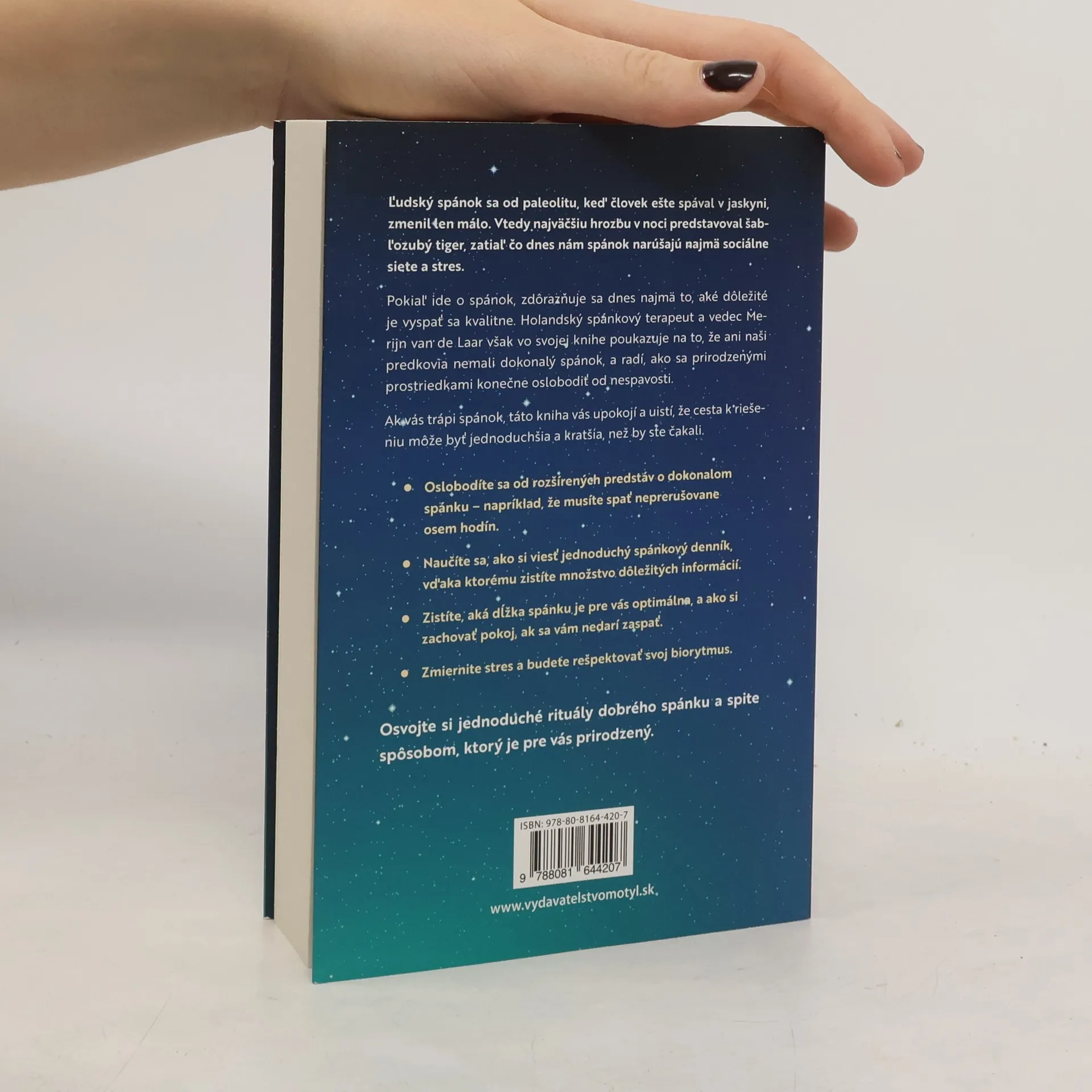 Ľudský spánok sa od paleolitu, keď človek ešte spával v jaskyni, zmenil len málo. Vtedy najväčšiu hrozbu v noci predstavoval šabľozubý tiger, zatiaľ čo dnes nám spánok narúšajú najmä sociálne siete a stres. Pokiaľ ide o spánok, zdôrazňuje sa dnes najmä to, aké dôležité je vyspať sa kvalitne. Holandský spánkový terapeut a vedec Merijn van de Laar však vo svojej knihe poukazuje na to, že ani naši predkovia nemali dokonalý spánok, a radí, ako sa prirodzenými prostriedkami konečne oslobodiť od nespavosti. Ak vás trápi spánok, táto kniha vás upokojí a uistí, že cesta k riešeniu môže byť jednoduchšia a kratšia, než by ste čakali. Oslobodíte sa od rozšírených predstáv o dokonalom spánku – napríklad, že musíte spať neprerušovane osem hodín. Naučíte sa, ako si viesť jednoduchý spánkový denník, vďaka ktorému zistíte množstvo dôležitých informácií. Zistíte, aká dĺžka spánku je pre vás optimálna, a ako si zachovať pokoj, ak sa vám nedarí zaspať. Zmiernite stres a budete rešpektovať svoj biorytmus. Osvojte si jednoduché rituály dobrého spánku a spite spôsobom, ktorý je pre vás prirodzený.