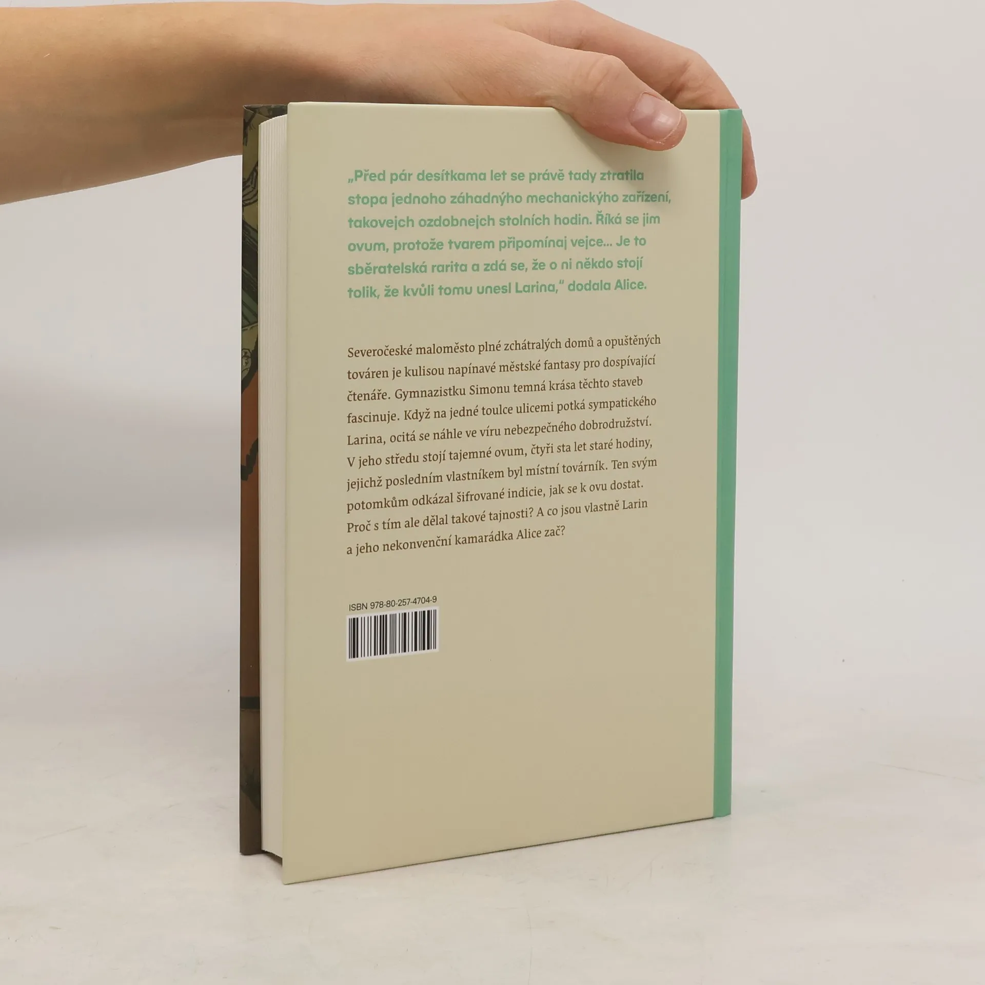 Severočeské maloměsto plné starých, zchátralých domů a pustnoucích továren je kulisou napínavé urban fantasy pro dospívající čtenáře. Gymnazistku Simonu temná krása staveb fascinuje. Na jedné toulce ulicemi potká Larina, který také prolézá staré budovy, ale z jiných důvodů. Než se o nich Simona může dozvědět víc, Larina někdo unese a ona se ocitá ve víru nebezpečného dobrodružství. V jeho středu stojí tajemné Ovum, čtyři sta let staré hodiny ve tvaru vejce, jejichž posledním známým vlastníkem byl místní továrník. Ten svým potomkům odkázal záhadné indicie, jak se k Ovu dostat. Proč s tím dělal takové tajnosti? A co jsou vlastně Larin a jeho nekonvenční kamarádka Alice zač? Nakladatelská anotace. Kráceno.