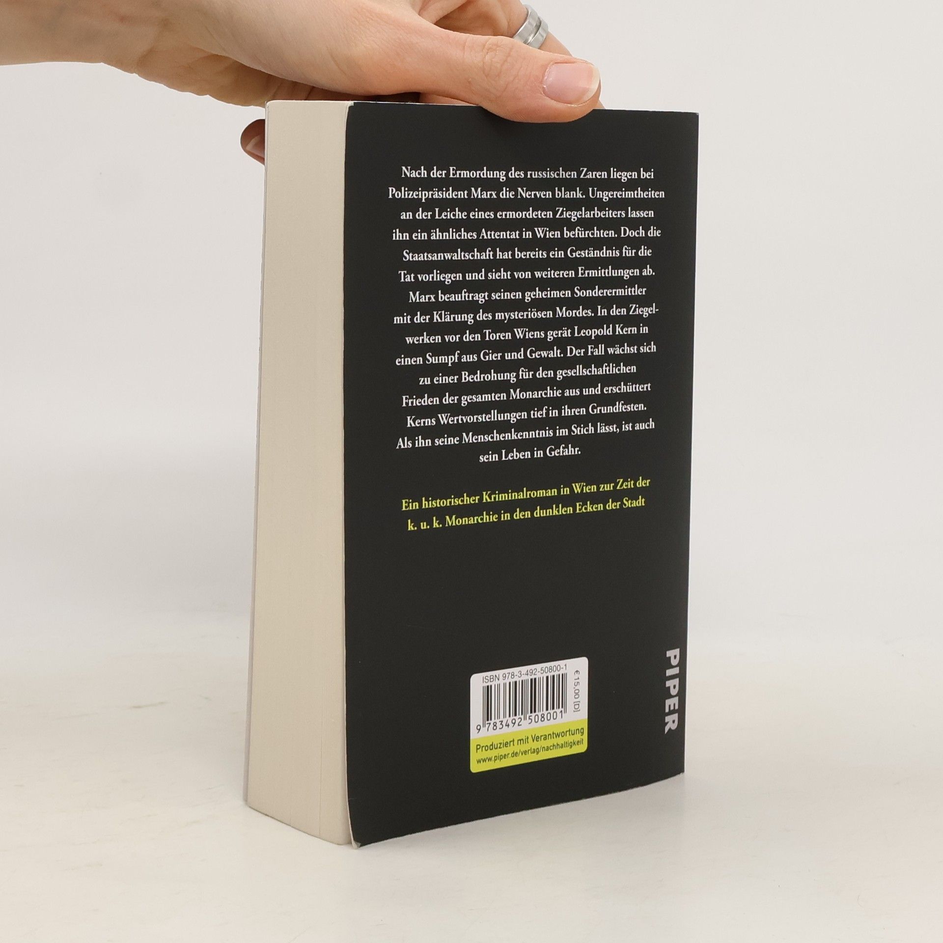 Im Wien der Ringstraßen-Zeit und der Belle Epoque ermittelt Leopold Kern, ein geheimer Sonderermittler mit engen Kontakten zur Halbwelt, in seinem neuesten Fall. Nach der Ermordung des russischen Zaren liegen bei Polizeipräsident Marx die Nerven blank. Ungereimtheiten an der Leiche eines ermordeten Ziegelarbeiters lassen ihn ein ähnliches Attentat in Wien befürchten. Doch die Staatsanwaltschaft hat bereits ein Geständnis für die Tat vorliegen und sieht von weiteren Ermittlungen ab. Marx beauftragt seinen geheimen Sonderermittler mit der Klärung des mysteriösen Falls. In den Ziegelwerken vor den Toren Wiens gerät Leopold Kern in einen Sumpf aus Gier und Gewalt. Sein Fall wächst sich zu einer Gefahr für den gesellschaftlichen Frieden der gesamten Monarchie aus und erschüttert Kerns Wertvorstellungen tief in ihren Grundfesten. Als ihn seine Menschenkenntnis im Stich lässt, ist auch sein Leben in tödlicher Gefahr.