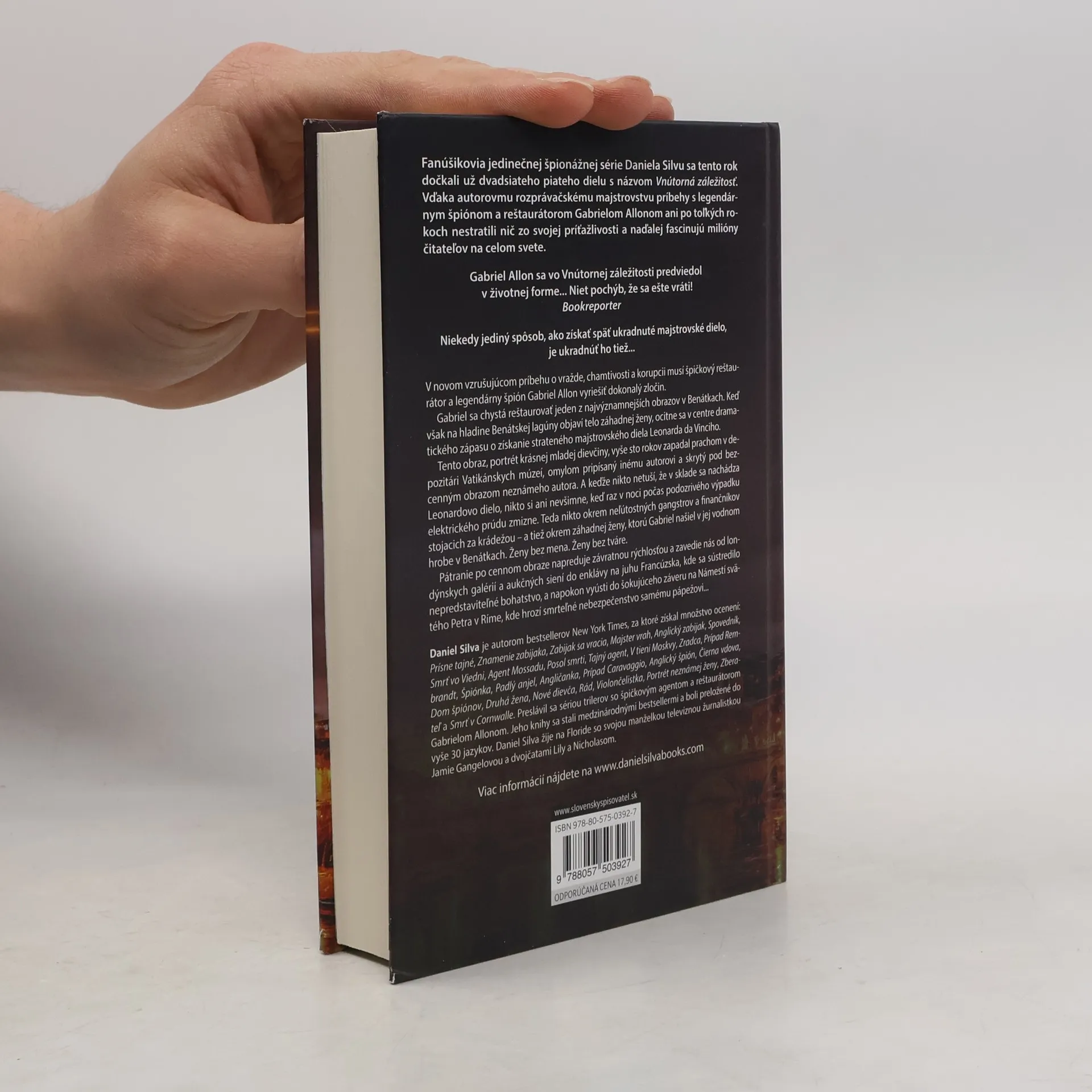 Niekedy jediný spôsob, ako získať späť ukradnuté majstrovské dielo, je ukradnúť ho tiež... V novom vzrušujúcom príbehu o vražde, chamtivosti a korupcii musí špičkový reštaurátor a legendárny špión Gabriel Allon vyriešiť dokonalý zločin. Gabriel sa chystá reštaurovať jeden z najvýznamnejších obrazov v Benátkach. Keď však na hladine Benátskej lagúny objaví telo záhadnej ženy, ocitne sa v centre dramatického zápasu o získanie strateného majstrovského diela Leonarda da Vinciho. Tento obraz, portrét krásnej mladej dievčiny, vyše sto rokov zapadal prachom v depozitári Vatikánskych múzeí, omylom pripísaný inému autorovi a skrytý pod bezcenným obrazom neznámeho autora. A keďže nikto netuší, že v sklade sa nachádza Leonardovo dielo, nikto si ani nevšimne, keď raz v noci počas podozrivého výpadku elektrického prúdu zmizne. Teda nikto okrem neľútostných gangstrov a finančníkov stojacich za krádežou – a tiež okrem záhadnej ženy, ktorú Gabriel našiel v jej vodnom hrobe v Benátkach. Ženy bez mena. Ženy bez tváre. Pátranie po cennom obraze napreduje závratnou rýchlosťou a zavedie nás od londýnskych galérií a aukčných siení do enklávy na juhu Francúzska, kde sa sústredilo nepredstaviteľné bohatstvo, a napokon vyústi do šokujúceho záveru na Námestí svätého Petra v Ríme, kde hrozí smrteľné nebezpečenstvo samému pápežovi...