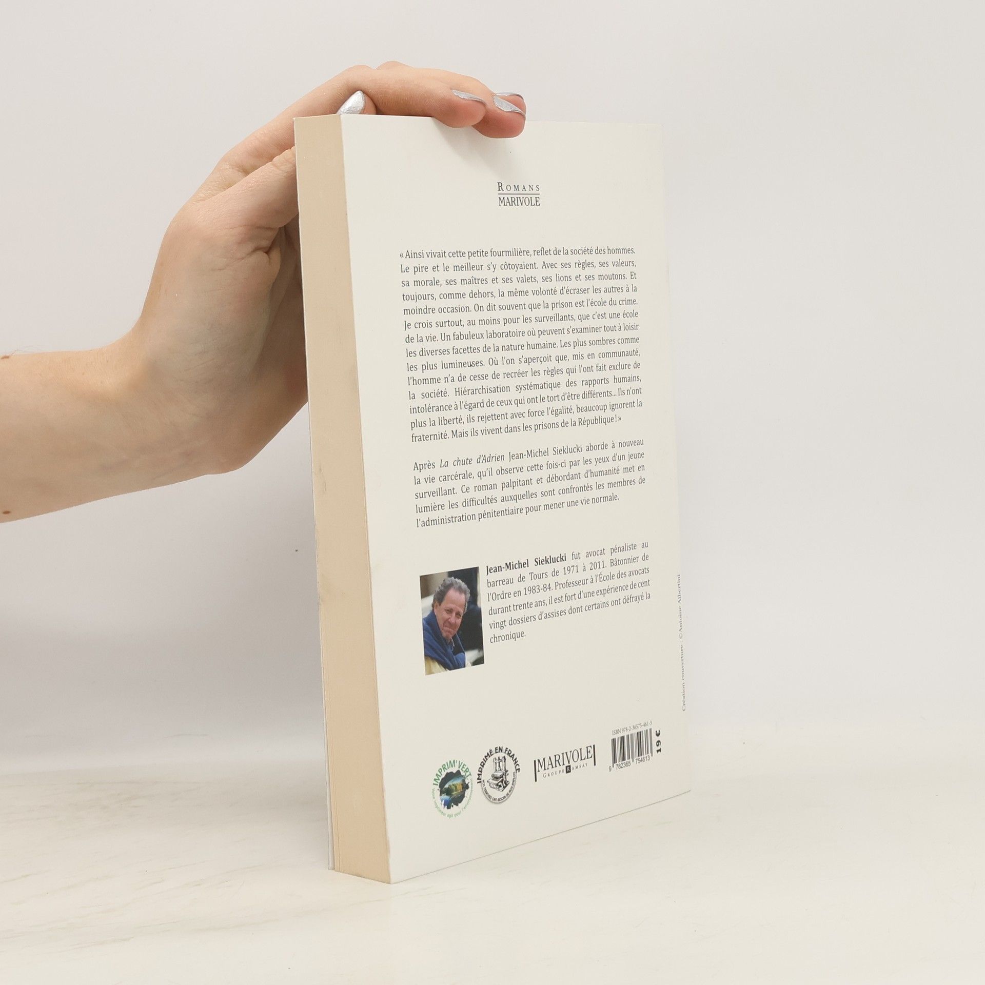 « Ainsi vivait cette petite fourmilière, reflet de la société des hommes. Le pire et le meilleur s’y côtoyaient. Avec ses règles, ses valeurs, sa morale, ses maîtres et ses valets, ses lions et ses moutons. Et toujours, comme dehors, la même volonté d’écraser les autres à la moindre occasion. On dit souvent que la prison est l’école du crime. Je crois surtout, au moins pour les surveillants, que c’est une école de la vie. Un fabuleux laboratoire où peuvent s’examiner tout à loisir les diverses facettes de la nature humaine. Les plus sombres comme les plus lumineuses. Où l’on s’aperçoit que, mis en communauté, l’homme n’a de cesse de recréer les règles qui l’ont fait exclure de la société. Hiérarchisation systématique des rapports humains, intolérance à l’égard de ceux qui ont le tort d’être différents... Ils n’ont plus la liberté, ils rejettent avec force l’égalité, beaucoup ignorent la fraternité. Mais ils vivent dans les prisons de la République ! »Après La chute d’Adrien Jean-Michel Sieklucki aborde à nouveau la vie carcérale, qu’il observe cette fois-ci par les yeux d’un jeune surveillant. Ce roman palpitant et débordant d’humanité met en lumière les difficultés auxquelles sont confrontés les membres de l’administration pénitentiaire pour mener une vie normale.