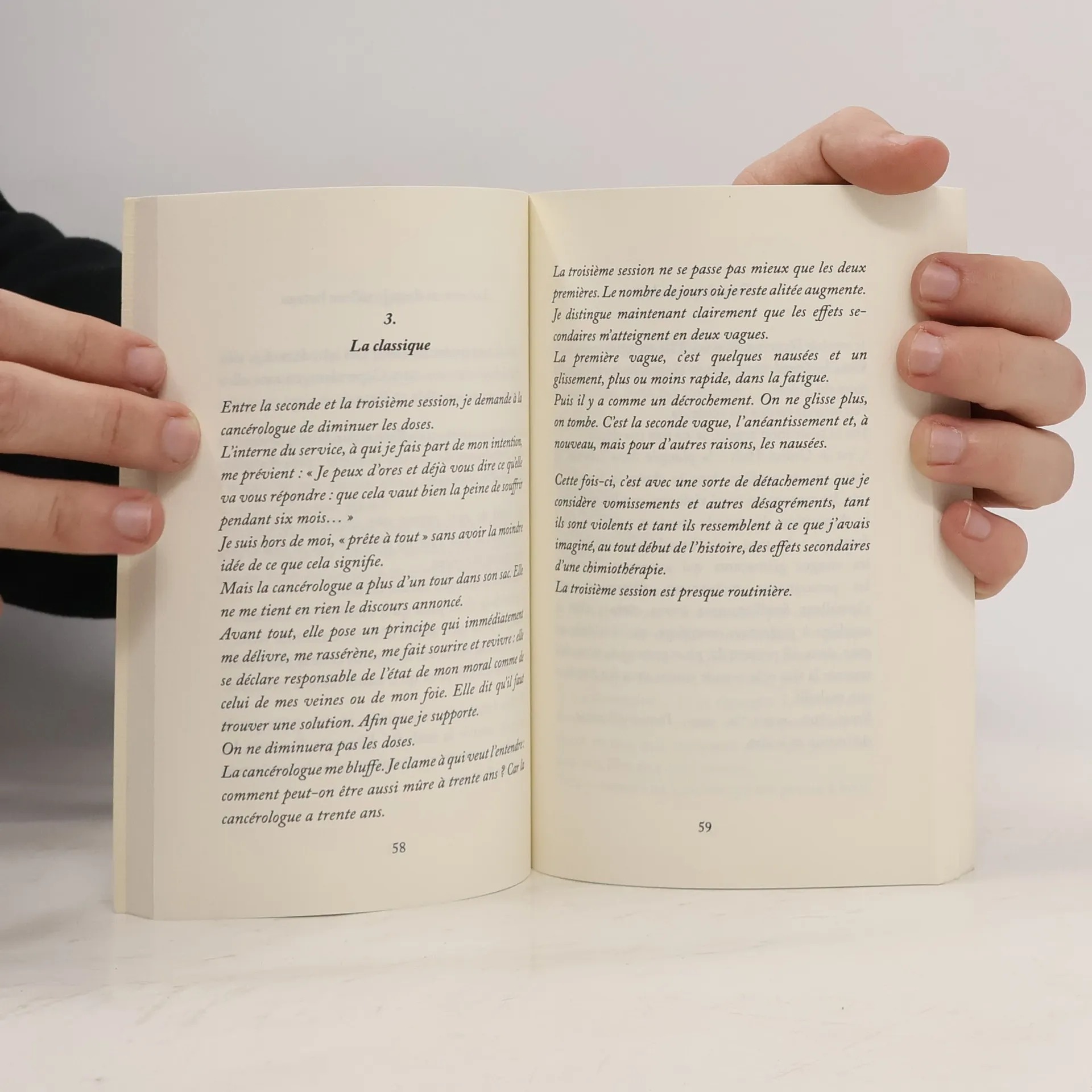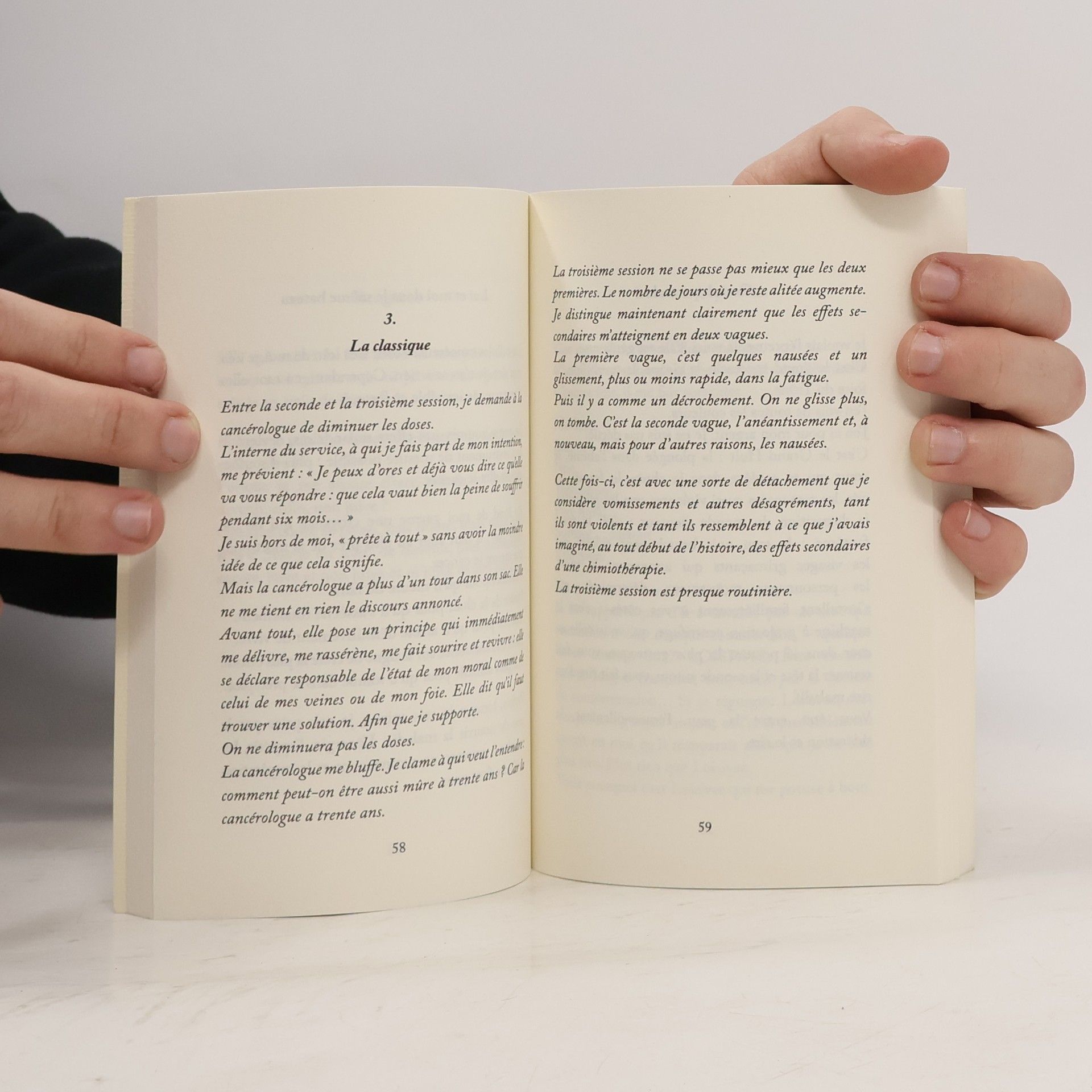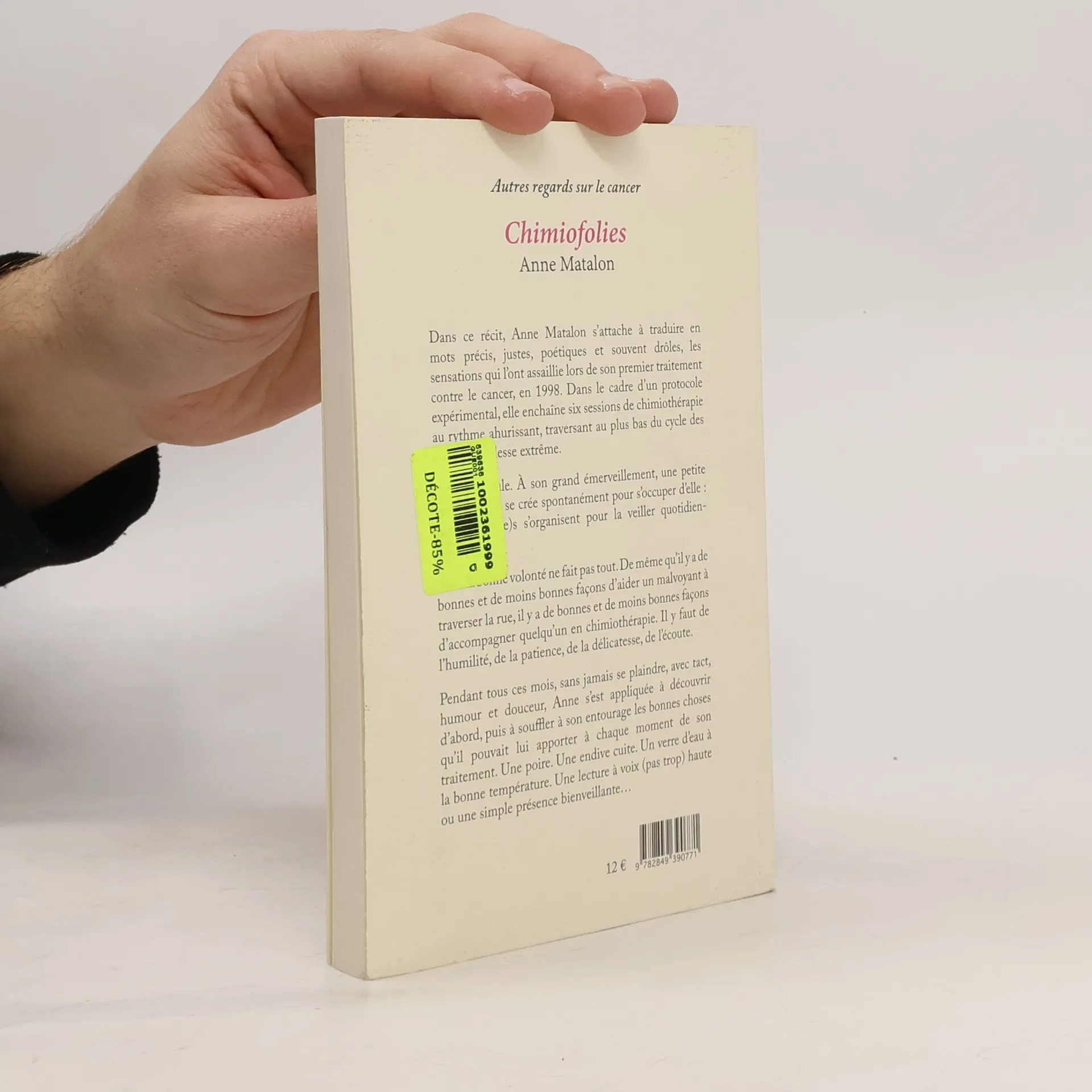 Dans ce récit, Anne Matalon s'attache à traduire en mots précis, justes, poétiques et souvent drôles, les sensations qui l'ont assaillie lors de son premier traitement contre le cancer, en 1998. Dans le cadre d'un protocole expérimental, elle enchaîne six sessions de chimiothérapie au rythme ahurissant, traversant au plus bas du cycle des états de faiblesse extrême. Anne vit seule. A son grand émerveillement, une petite communauté se crée spontanément pour s'occuper d'elle : famille, ami(e)s s'organisent pour la veiller quotidiennement. Mais la bonne volonté ne fait pas tout. De même qu'il y a de bonnes et de moins bonnes façons d'aider un malvoyant à traverser la rue, il y a de bonnes et de moins bonnes façons d'accompagner quelqu'un en chimiothérapie. Il y faut de l'humilité, de la patience, de la délicatesse, de l'écoute. Pendant tous ces mois, sans jamais se plaindre, avec tact, humour et douceur, Anne s'est appliquée à découvrir d'abord, puis à souffler à son entourage les bonnes choses qu'il pouvait lui apporter à chaque moment de son traitement. Une poire. Une endive cuite. Un verre d'eau à la bonne température. Une lecture à voix (pas trop) haute ou une simple présence bienveillante.