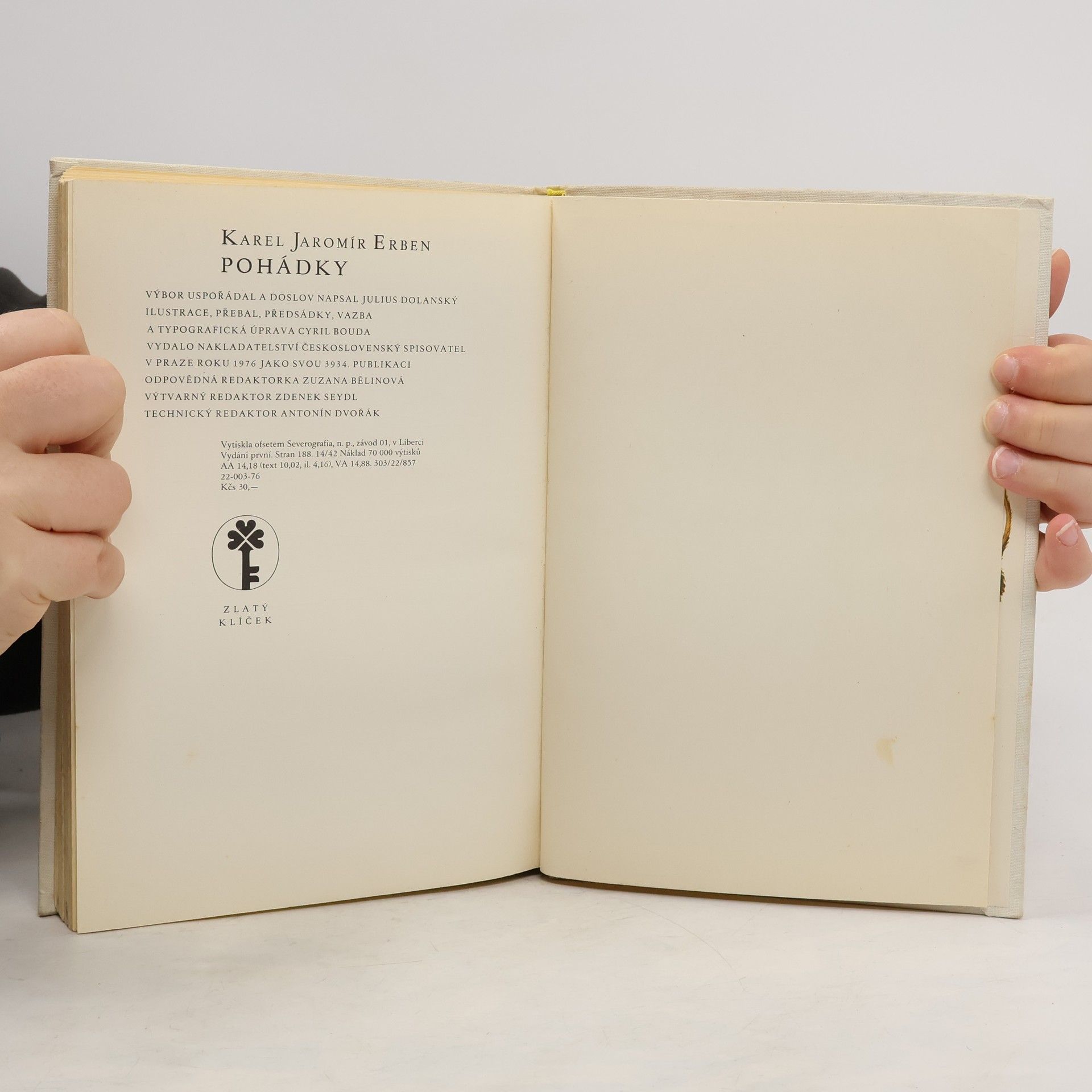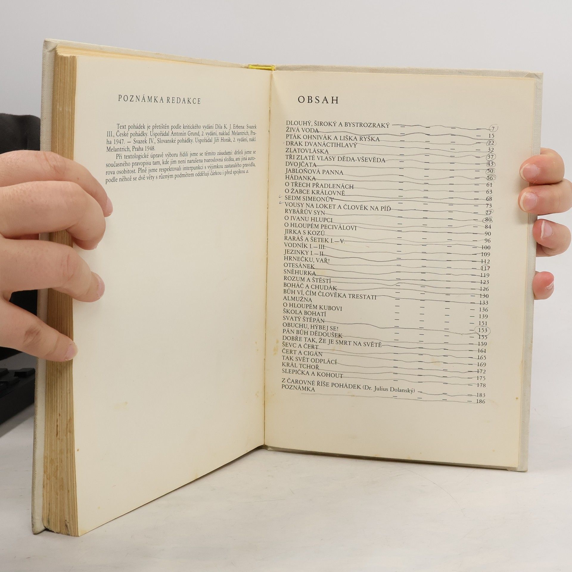 39 více či méně známých pohádek K. J. Erbena doplněných o kouzelné ilustrace C. Boudy. Pohádky: Dlouhý, Široký a Bystrozraký, Živá voda, Pták Ohnivák a liška Ryška, Drak dvanáctihlavý, Zlatovláska, Tři zlaté vlasy Děda-Vševěda, Dvojčata, Jabloňová panna, Hádanka, O třech přadlenách, O žabce královně, Sedm Simeonův, Vousy na loket a člověk na píď, Rybářův syn, O Ivanu Hlupci, O hloupém Peciválovi, Jirka z kozú, Raráš a Šetek I.-V., Vodník I.-III., Jezinky I.-II., Hrnečku, vař !, Otesánek, Sněhurka, Rozum a štěstí, Boháč a chudák, Bůh ví, čím člověka trestati, Almužna, O hloupém Kubovi, Škola bohatí, Svatý Štěpán, Obuchu, hýbej se !, Pán Bůh dědoušek, Dobře tak, že je smrt na světě, Ševc a čert, Čert a cigán, Tak svět odplácí, Král tchoř, Slepička a kohout. Doslov-Z čarovné říše pohádek /Dr. Julius Dolanský/. První vydání. Cena knihy v čase vydání: 30.- Kčs.