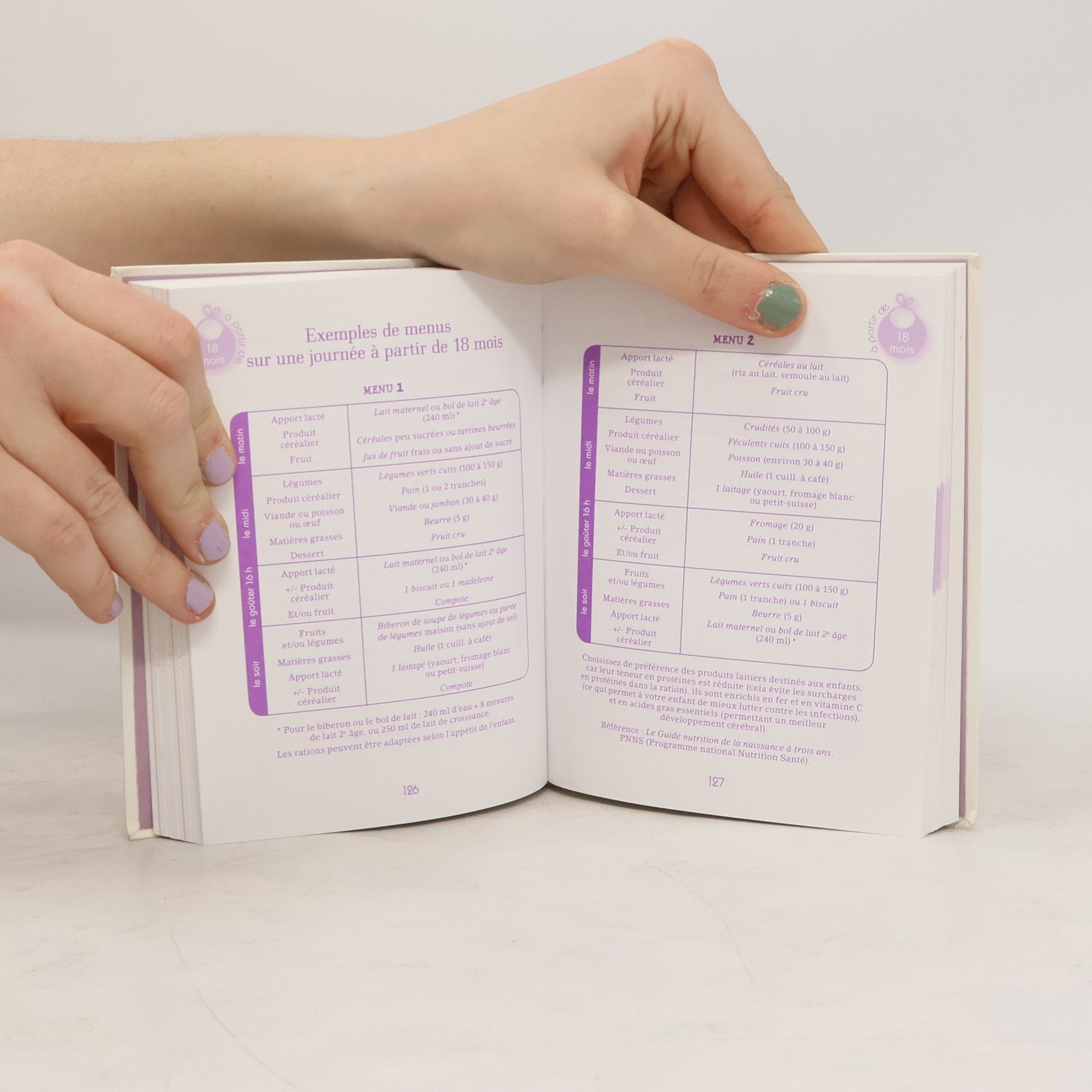 Un livre adapte aux besoins specifiques de chaque age: - de 6 mois a 1 an (du liquide au solide) - de 1 an a 18 mois (vers une alimentation de grand) - de 18 mois a 3 ans (l'enfant mange de tout) Pour chaque recette: le temps de preparation et de cuisson (reel), les ingredients (dans l'ordre d'utilisation), le niveau de difficulte et les etapes de realisation. Les quantites sont prevues pour 1 a 2 portions. Des variantes sont proposees en changeant l'ingredient principal. En complement: des astuces, les conseils d'un pediatre et des encadres apportant des informations sur un aliment. En bonus: - un tableau de repere pour les aliments a introduire selon l'age de l'enfant - les aliments de base qu'il faut avoir chez soi (frais, en conserve, surgeles) - un tableau des valeurs en calories des principaux aliments.