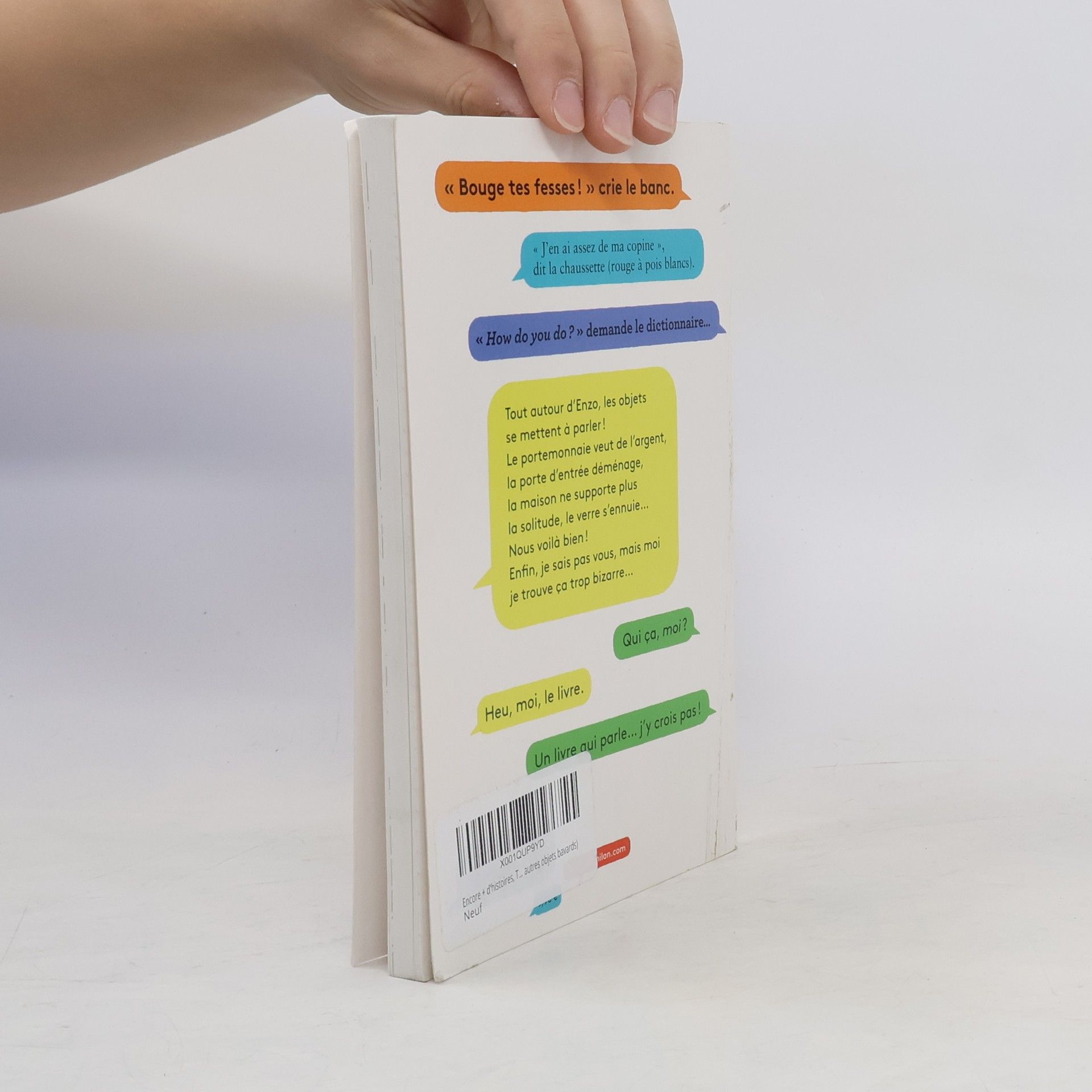 "Bouge tes fesses !" crie le banc. "J'en ai assez de ma copine", dit la chaussette (rouge à pois blancs). "How do you do ?" demande le dictionnaire... Tout autour d'Enzo, les objets se mettent à parler ! Le porte-monnaie veut de l'argent, la porte d'entrée déménage, la maison ne supporte plus la solitude, le verre s'ennuie... Nous voilà bien ! Enfin, je sais pas vous, mais moi je trouve ça trop bizarre... Qui ça, moi ? Heu, moi, le livre. Un livre qui parle... j'y crois pas !