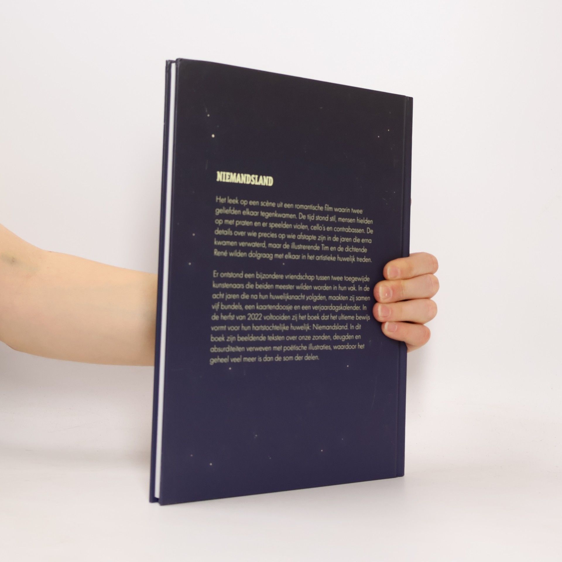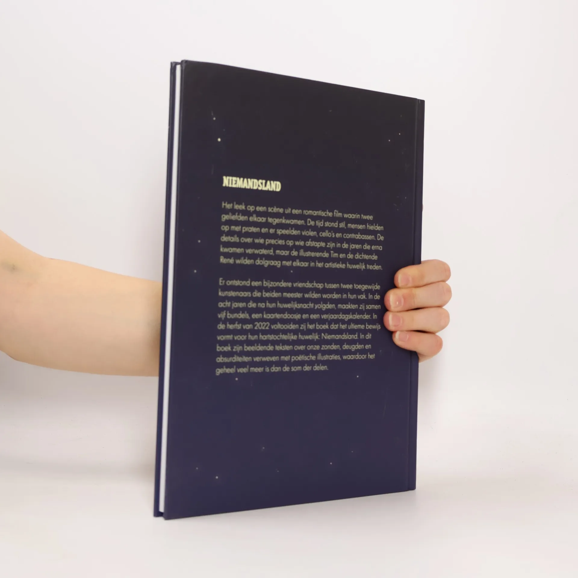 Het leek op een scène uit een romantische film waarin twee geliefden elkaar tegenkwamen. De tijd stond stil, mensen hielden op met praten en er speelden violen, cello’s en contrabassen. De details over wie precies op wie afstapte zijn in de jaren die erna kwamen verwaterd, maar de illustrerende Tim en de dichtende René wilden dolgraag met elkaar in het artistieke huwelijk treden.Er ontstond een bijzondere vriendschap tussen twee toegewijde kunstenaars die beiden meester wilden worden in hun vak. In de acht jaren die na hun huwelijksnacht volgden, maakten zij samen vijf bundels, een kaartendoosje en een verjaardagskalender. In de herfst van 2022 voltooiden zij het boek dat het ultieme bewijs vormt voor hun hartstochtelijke huwelijk: Niemandsland. In dit boek zijn beeldende teksten over onze zonden, deugden en absurditeiten verweven met poëtische illustraties, waardoor het geheel veel meer is dan de som der delen.