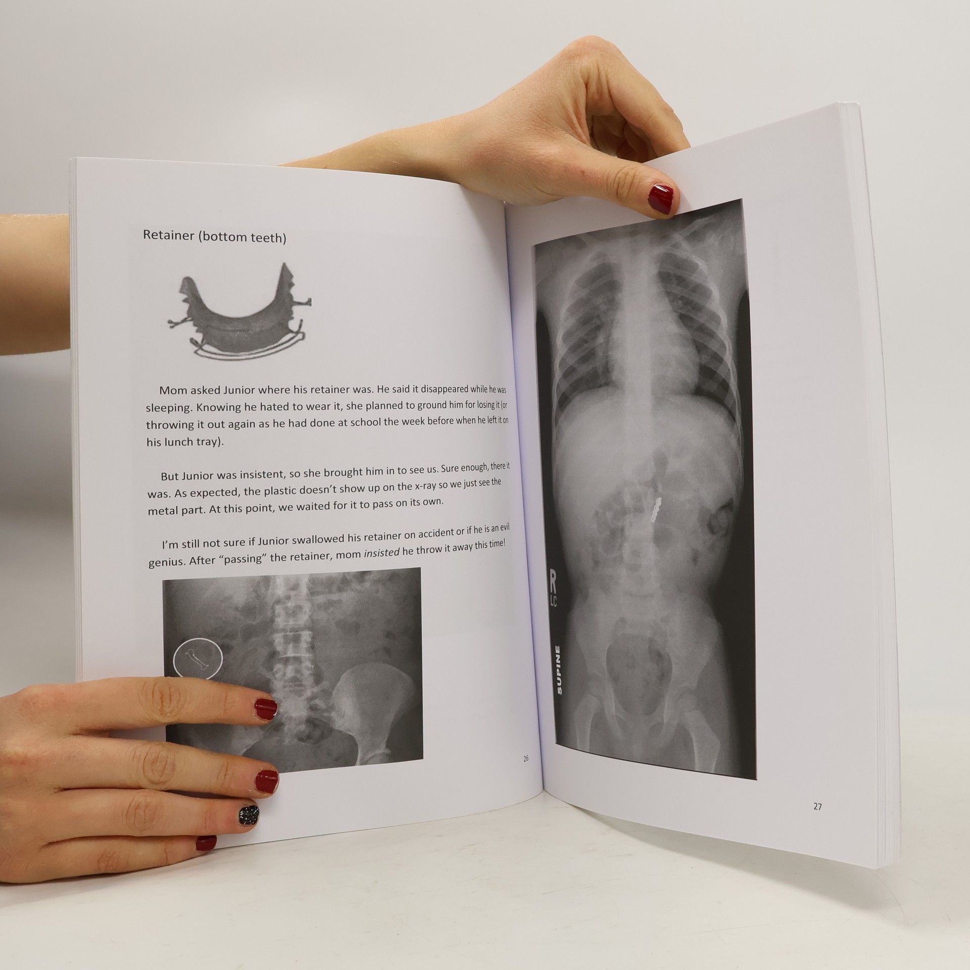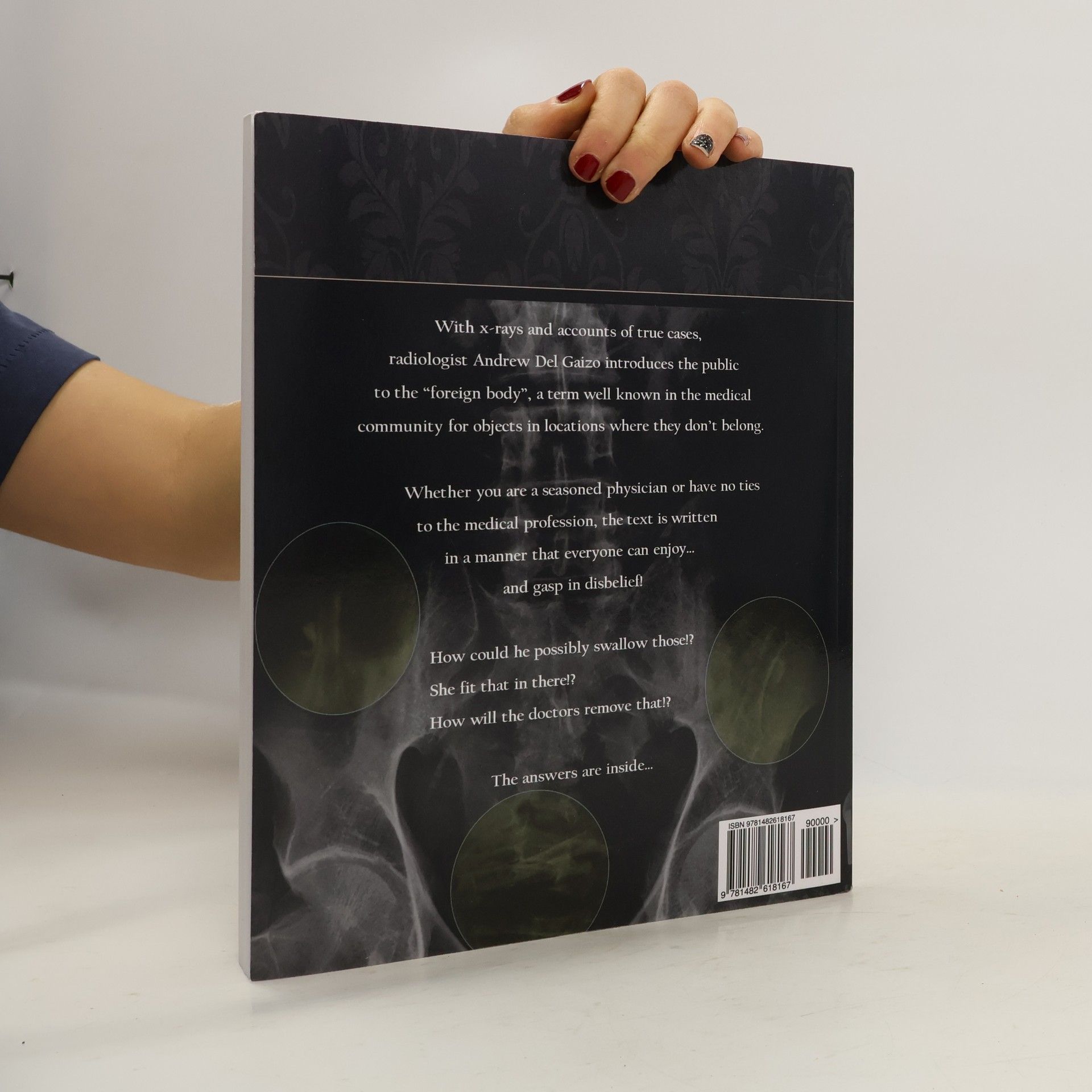 With x-rays and accounts of true cases, radiologist Andrew Del Gaizo introduces the public to the "foreign body", a term well known in the medical community for objects in locations where they don't belong. Whether you are a seasoned physician or have no ties to the medical profession, the text is written in a manner that everyone can enjoy... and gasp in disbelief! "How could he possibly swallow those?" "She fit that in there?" "How will the doctors remove that!?" The answers are inside... The book focuses on interesting x-rays of foreign bodies that brought patients to emergency rooms and is written without complex medical terminology so that everyone can benefit from it. X-rays are shown as "unknowns" to let the reader guess what the foreign body is. Occasionally, a clue is provided to get started. But, as a picture is worth a thousand words, often the image does the talking! On the next page, the foreign body is explained, along with how it got there. Often why it’s there is as interesting as the image itself. Of course, all patient identifying information has been removed or changed to protect patient privacy and anonymity. The x-rays are broken down into 3 categories. Category 1: Ingested or Inhaled The mouth innocuously enough accepts foreign bodies. Unfortunately, there are tight areas within the gastrointestinal tract where these items can get stuck. Furthermore, some objects (such as sharp items or certain types of batteries) can be dangerous or toxic if not retrieved. Category 2: Introduced Welcome to the gun and knife show. Whether inadvertently caused by the patient or inflicted by someone else intending harm to the patient, x-rays play an important role in characterizing and localizing the weapons used. In addition to their medical relevance, these x-rays often end up in forensics, delineating the type and trajectory of the weapon involved. Category 3: Inserted Last but not least…the XXX-rays. Technically, these foreign bodies can be classified as introduced. However, given the “unique” circumstances under which many of these cases present, they deserve a category of their own.