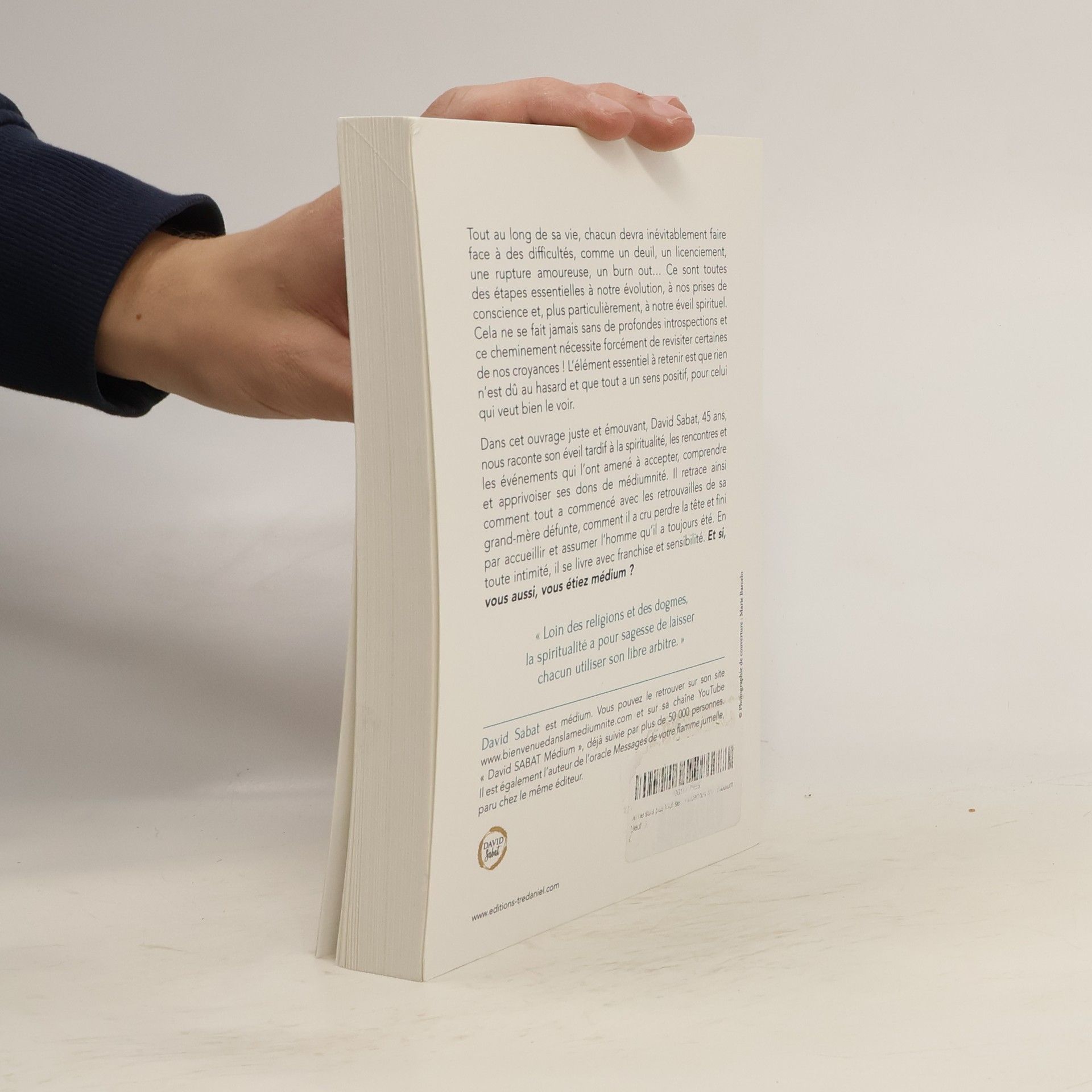 Le témoignage fascinant de David Sabat, afin de mieux comprendre le parcours spirituel d'un médium mais aussi réfléchir à son propre rapport avec la spiritualité. " Loin des religions et des dogmes, la spiritualité a pour sagesse de laisser chacun utiliser son libre arbitre. "Tout au long de sa vie, chacun devra inévitablement faire face à certaines difficultés, à un deuil, à un licenciement, à une rupture amoureuse, à un burn out... Ce sont toutes des étapes essentielles à notre évolution, aux prises de conscience, et plus particulièrement à l'éveil spirituel. Cela ne se fait jamais sans de profondes introspections, et nécessite de revisiter certaines croyances !La chose essentielle à retenir est que rien n'est dû au hasard, et que tout a un sens positif pour celui qui veut bien le regarder.Médium, David Sabat, 45 ans, nous raconte son éveil tardif à la spiritualité, les rencontres et les événements qui l'ont amené à accepter, comprendre et apprivoiser ses dons de médiumnité. Il retrace ainsi comment tout a commencé avec les retrouvailles de sa grand-mère défunte, comment il a cru perdre la tête et fini par accueillir et assumer l'homme qu'il a toujours été. En toute intimité, il se livre avec franchise et sensibilité. Et si, vous aussi, vous étiez médium ?
