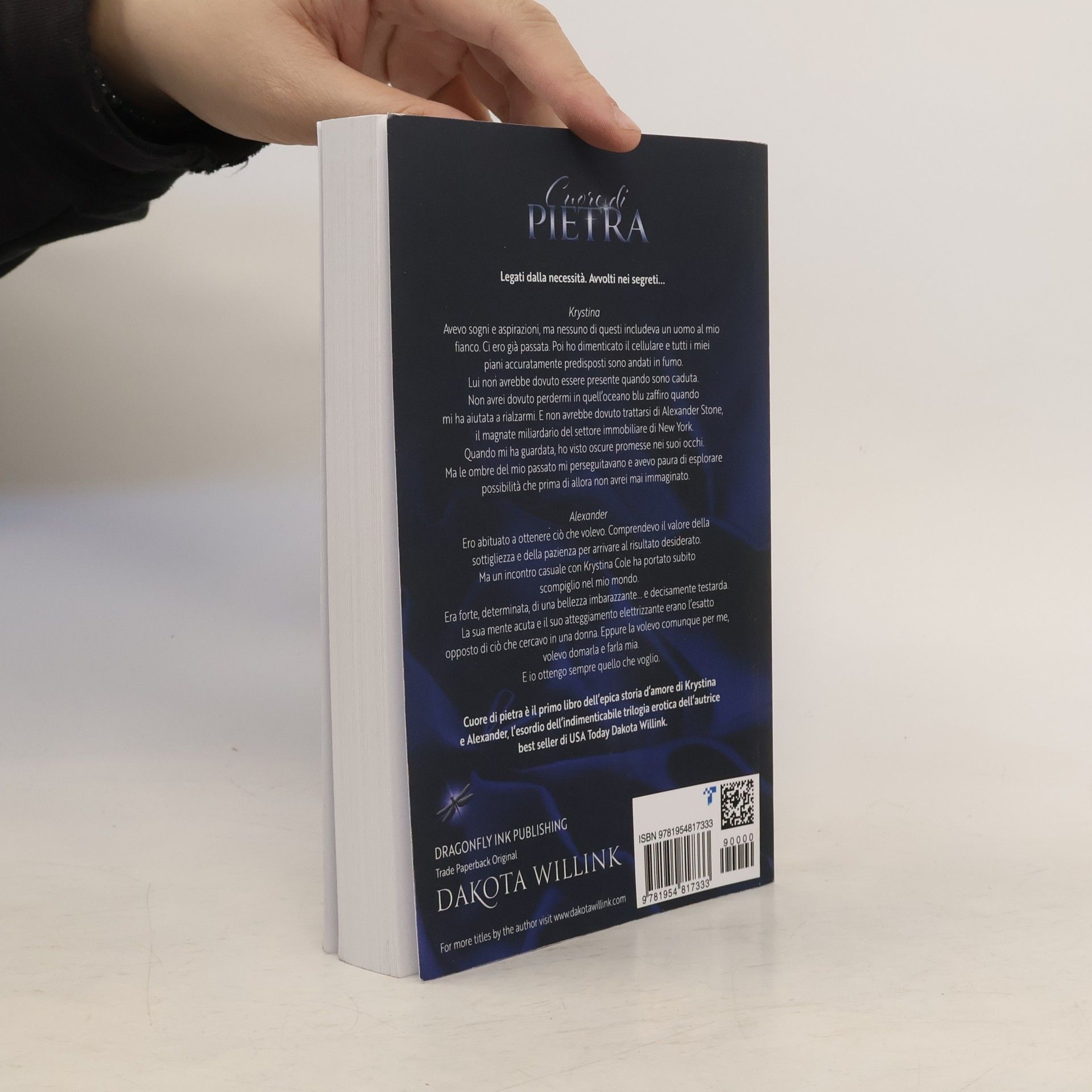 Legati dalla necessità. Avvolti nei segreti...KrystinaAvevo sogni e aspirazioni, ma nessuno di questi includeva un uomo al mio fianco. Ci ero già passata. Poi ho dimenticato il cellulare e tutti i miei piani accuratamente predisposti sono andati in fumo.Lui non avrebbe dovuto essere presente quando sono caduta.Non avrei dovuto perdermi in quell'oceano blu zaffiro quando mi ha aiutata a rialzarmi.E non avrebbe dovuto trattarsi di Alexander Stone, il magnate miliardario del settore immobiliare di New York.Quando mi ha guardata, ho visto oscure promesse nei suoi occhi. Ma le ombre del mio passato mi perseguitavano e avevo paura di esplorare possibilità che prima di allora non avrei mai immaginato.AlexanderEro abituato a ottenere ciò che volevo. Comprendevo il valore della sottigliezza e della pazienza per arrivare al risultato desiderato. Ma un incontro casuale con Krystina Cole ha portato subito scompiglio nel mio mondo.Era forte, determinata, di una bellezza imbarazzante... e decisamente testarda.La sua mente acuta e il suo atteggiamento elettrizzante erano l'esatto opposto di ciò che cercavo in una donna.Eppure la volevo comunque per me, volevo domarla e farla mia.E io ottengo sempre quello che voglio.Cuore di pietra è il primo libro dell'epica storia d'amore di Krystina e Alexander, l'esordio dell'indimenticabile trilogia erotica dell'autrice best seller di USA Today Dakota Willink.