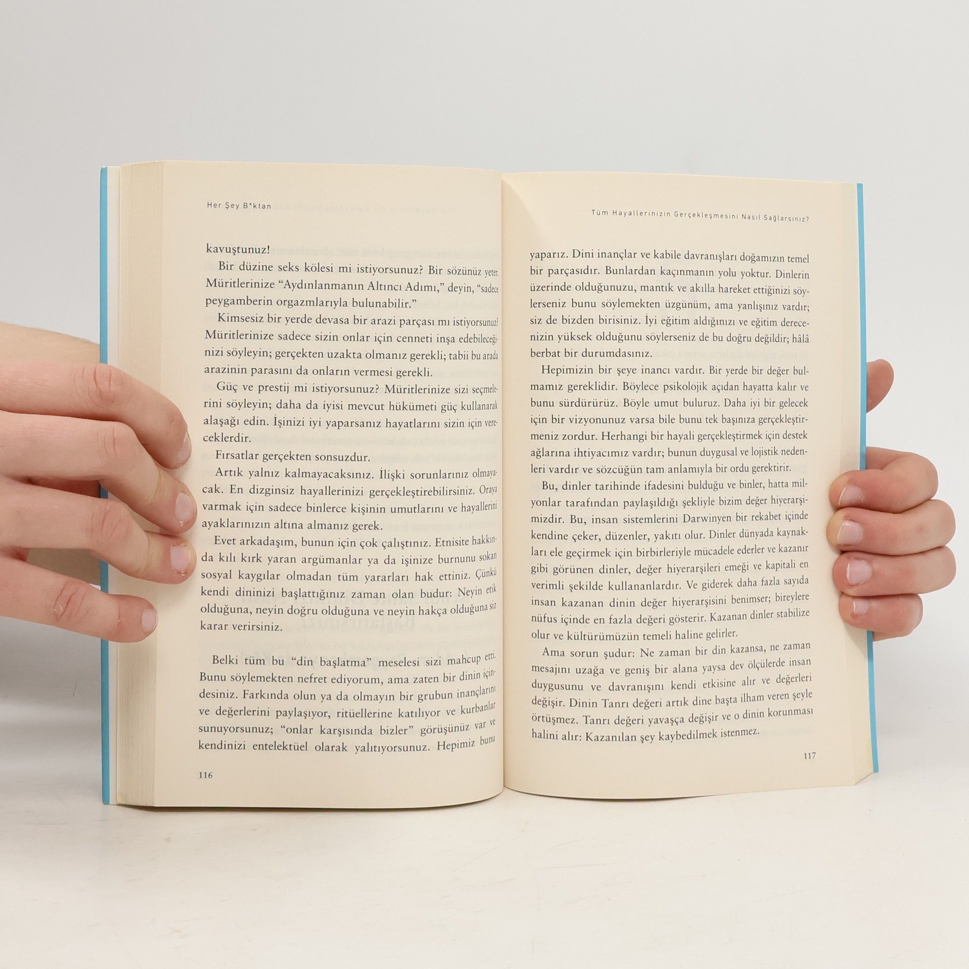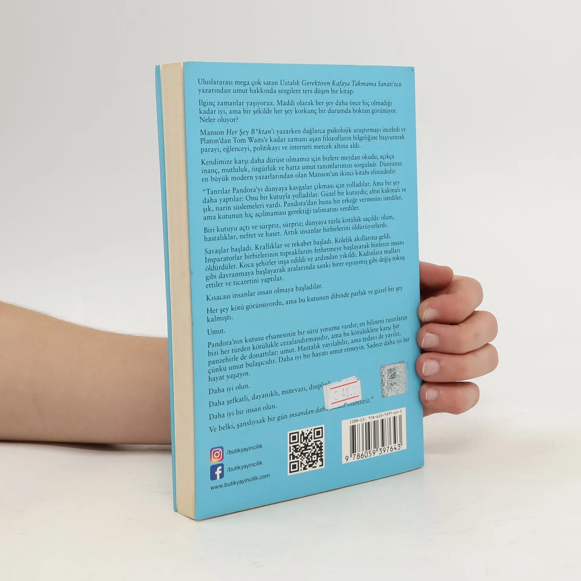 Uluslararası mega çok satan Ustalık Gerektiren Kafaya Takmama Sanatı’nın yazarından umut hakkında sezgilere ters düşen bir kitap. İlginç zamanlar yaşıyoruz. Maddi olarak her şey daha önce hiç olmadığı kadar iyi, ama bir şekilde her şey korkunç bir durumda boktan görünüyor. Neler oluyor? Manson Her Şey B*ktan’ı yazarken dağlarca psikolojik araştırmayı inceledi ve Platon’dan Tom Waits’e kadar zamanı aşan filozofların bilgeliğine başvurarak parayı, eğlenceyi, politikayı ve interneti mercek altına aldı. Kendimize karşı daha dürüst olmamız için bizlere meydan okudu; açıkça inanç, mutluluk, özgürlük ve hatta umut tanımlarımızı sorguladı. Dünyanın en büyük modern yazarlarından olan Manson’un ikinci kitabı elinizdedir. “Tanrılar Pandora’yı dünyaya kavgalar çıkması için yolladılar. Ama bir şey daha yaptılar: Onu bir kutuyla yolladılar. Güzel bir kutuydu; altın kakmalı ve şık, narin süslemeleri vardı. Pandora’dan bunu bir erkeğe vermesini istediler, ama kutunun hiç açılmaması gerektiği talimatını verdiler. Biri kutuyu açtı ve sürpriz, sürpriz; dünyaya türlü kötülük saçıldı: ölüm, hastalıklar, nefret ve haset. Artık insanlar birbirlerini öldürüyorlardı. Savaşlar başladı. Krallıklar ve rekabet başladı. Kölelik akıllarına geldi. İmparatorlar birbirlerinin topraklarını fethetmeye başlayarak binlerce insanı öldürdüler. Koca şehirler inşa edildi ve ardından yıkıldı. Kadınlara malları gibi davranmaya başlayarak aralarında sanki birer eşyaymış gibi değiş-tokuş ettiler ve ticaretini yaptılar. Kısacası insanlar insan olmaya başladılar. Her şey kötü görünüyordu, ama bu kutunun dibinde parlak ve güzel bir şey kalmıştı. Umut. Pandora’nın kutusu efsanesinin bir sürü yorumu vardır; en bilineni tanrıların bizi her türden kötülükle cezalandırmasıdır, ama bu kötülüklere karşı bir panzehirle de donattılar: umut. Hastalık yayılabilir, ama tedavi de yayılır, çünkü umut bulaşıcıdır. Daha iyi bir hayatı umut etmeyin. Sadece daha iyi bir hayat yaşayın. Daha iyi olun. Daha şefkatli, dayanıklı, mütevazı, disiplinli. Daha iyi bir insan olun. Ve belki, şanslıysak bir gün insandan daha fazlası olabiliriz.”