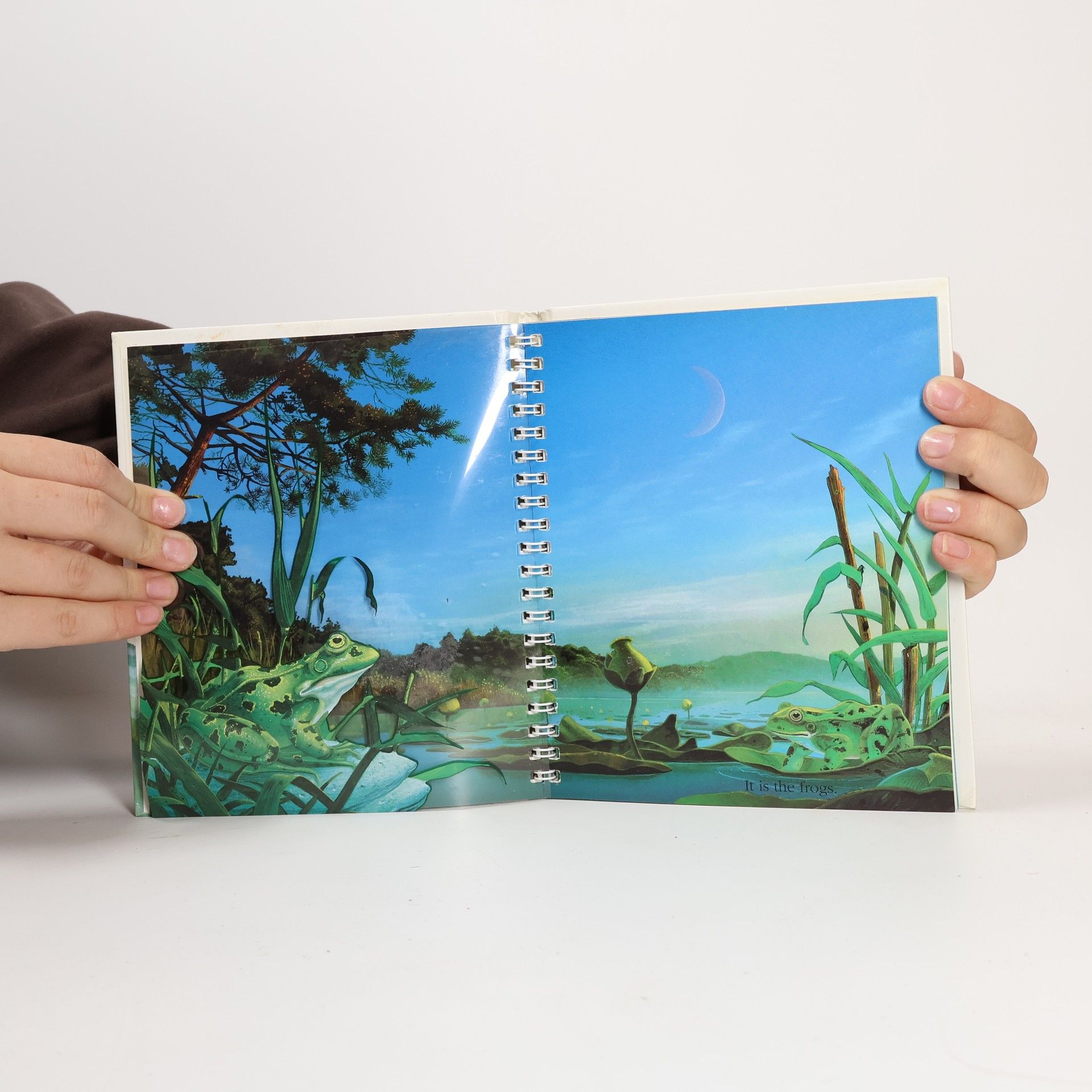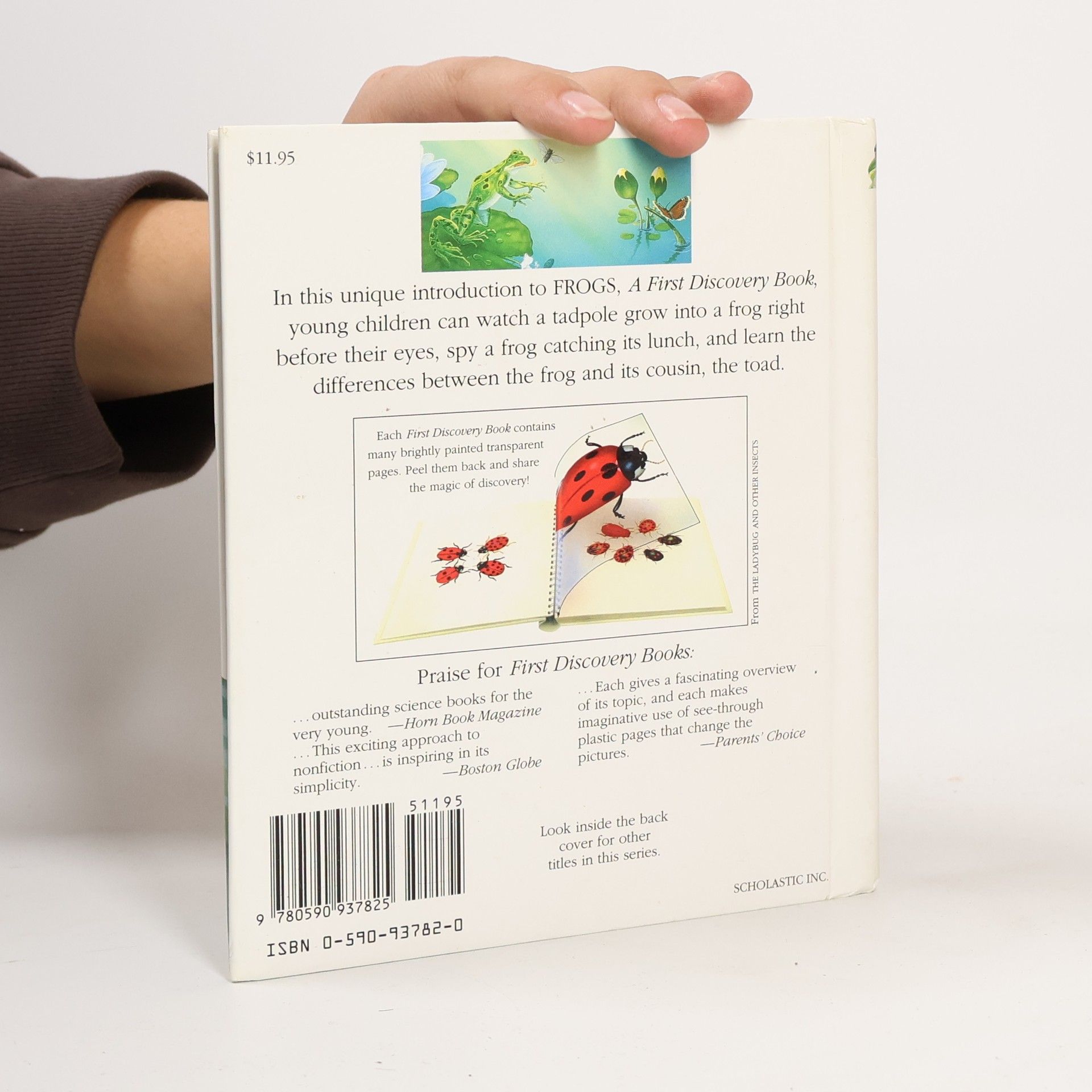 Illustrations with transparent overlays and brief text describe the physical characteristics, life cycle, habits, and various species of frogs, as well as presenting several related amphibians