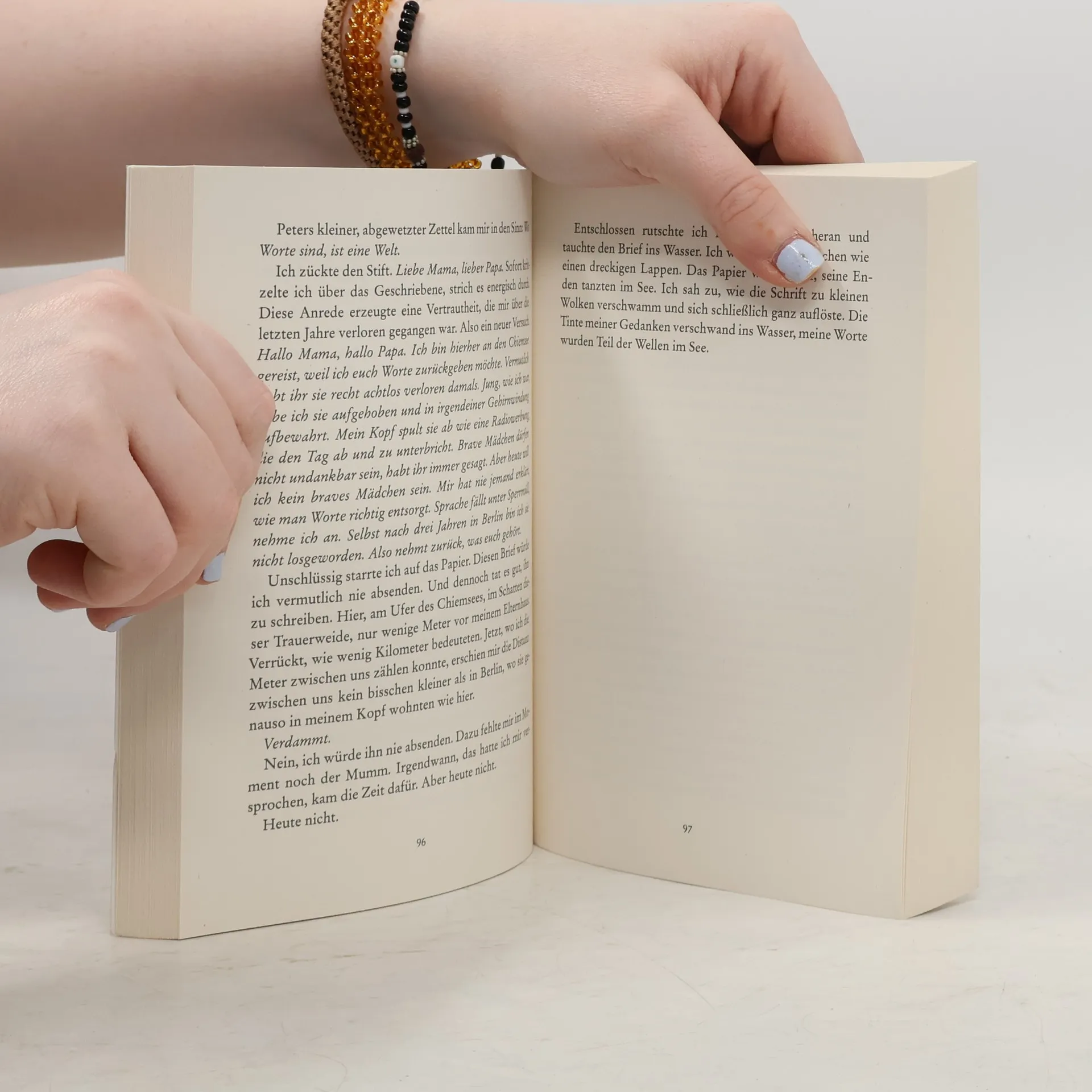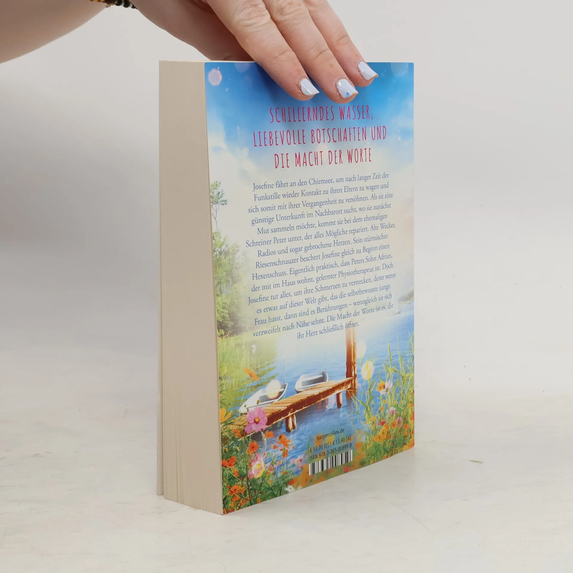 Schillerndes Wasser, liebevolle Botschaften und die Macht der Worte Josefine fährt an den Chiemsee, um sich ihrer Vergangenheit zu stellen und nach langer Zeit der Funkstille Kontakt zu ihren Eltern zu wagen. Als sie eine günstige Unterkunft im Nachbarort sucht, wo sie zunächst Mut sammeln möchte, kommt sie bei dem ehemaligen Schreiner Peter unter, der alles Mögliche repariert. Alte Wecker, Radios, und sogar gebrochene Herzen. Sein unerzogener, stürmischer Riesenschnauzer beschert Josefine gleich zu Beginn einen Hexenschuss. Eigentlich praktisch, dass Peters Sohn Adrian, der mit im Haus wohnt, gelernter Physiotherapeut ist. Doch Josefine tut alles, um ihre Schmerzen zu verstecken, denn wenn es etwas auf dieser Welt gibt, das die selbstbewusste junge Frau hasst, dann sind es Berührungen – wenngleich sie sich verzweifelt nach Nähe sehnt. Die Macht der Worte ist es, die ihr Herz schließlich öffnet.