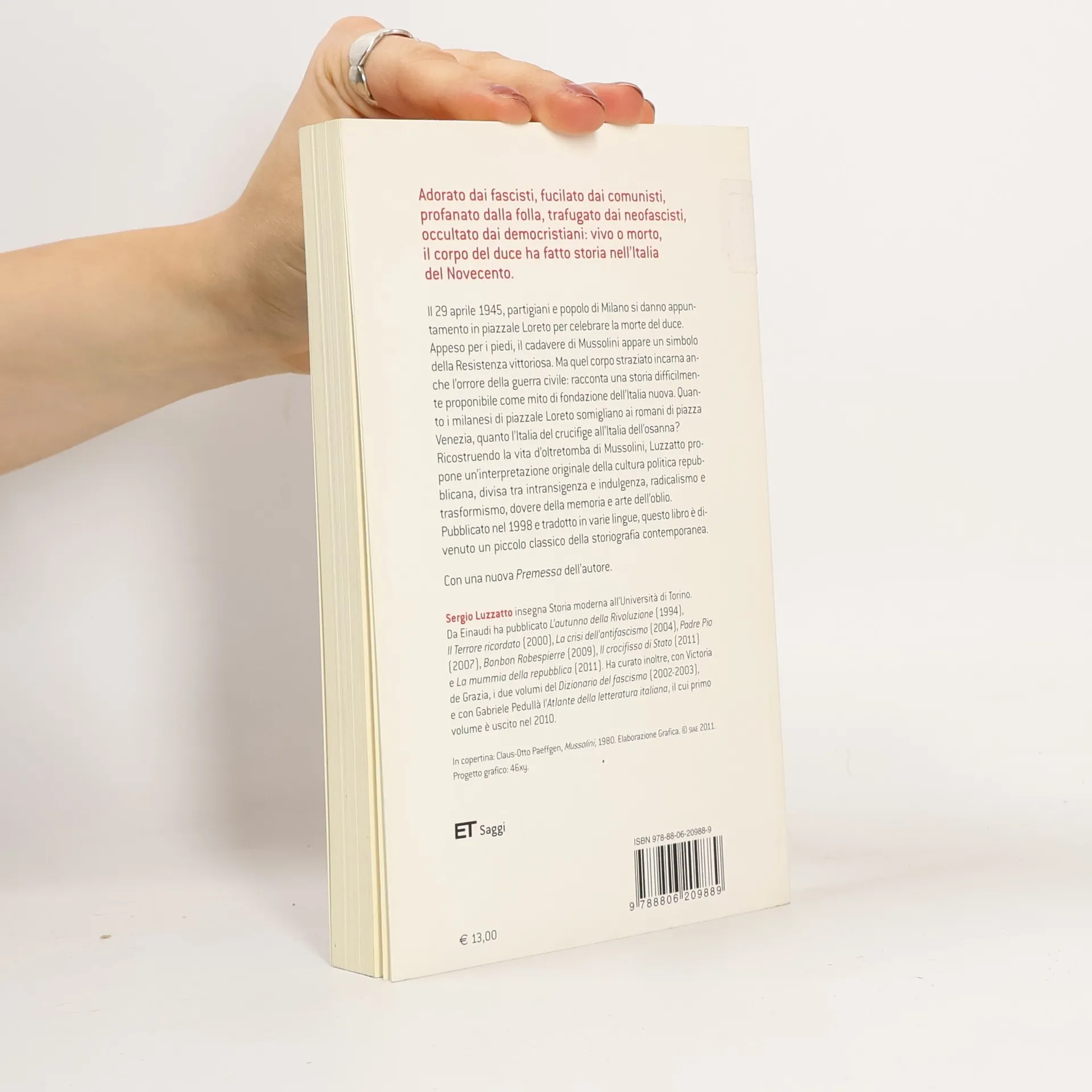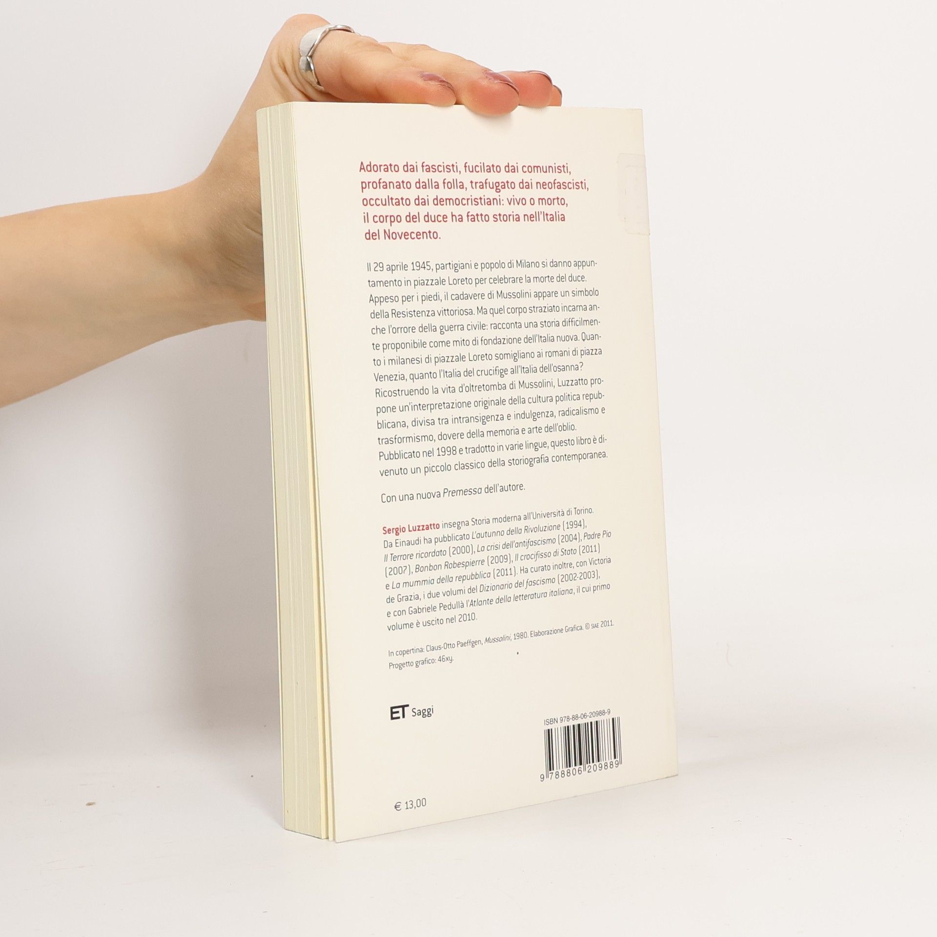 Il 29 aprile 1945, partigiani e popolo di Milano si danno appuntamento in piazzale Loreto per celebrare la morte del duce. Appeso per i piedi, il cadavere di Mussolini appare un simbolo della Resistenza vittoriosa. Ma quel corpo straziato incarna anche l'orrore della guerra civile: racconta una storia diffìcilmente proponibile come mito di fondazione dell'Italia nuova. Quanto i milanesi di piazzale Loreto somigliano ai romani di piazza Venezia, quanto l'Italia del crucifìge all'Italia dell'osanna? Ricostruendo la vita d'oltretomba di Mussolini, Luzzatto propone un'interpretazione originale della cultura politica repubblicana, divisa tra intransigenza e indulgenza, radicalismo e trasformismo, dovere della memoria e arte dell'oblio. Pubblicato nel 1998 e tradotto in varie lingue, questo libro è divenuto un piccolo classico della storiografia contemporanea.