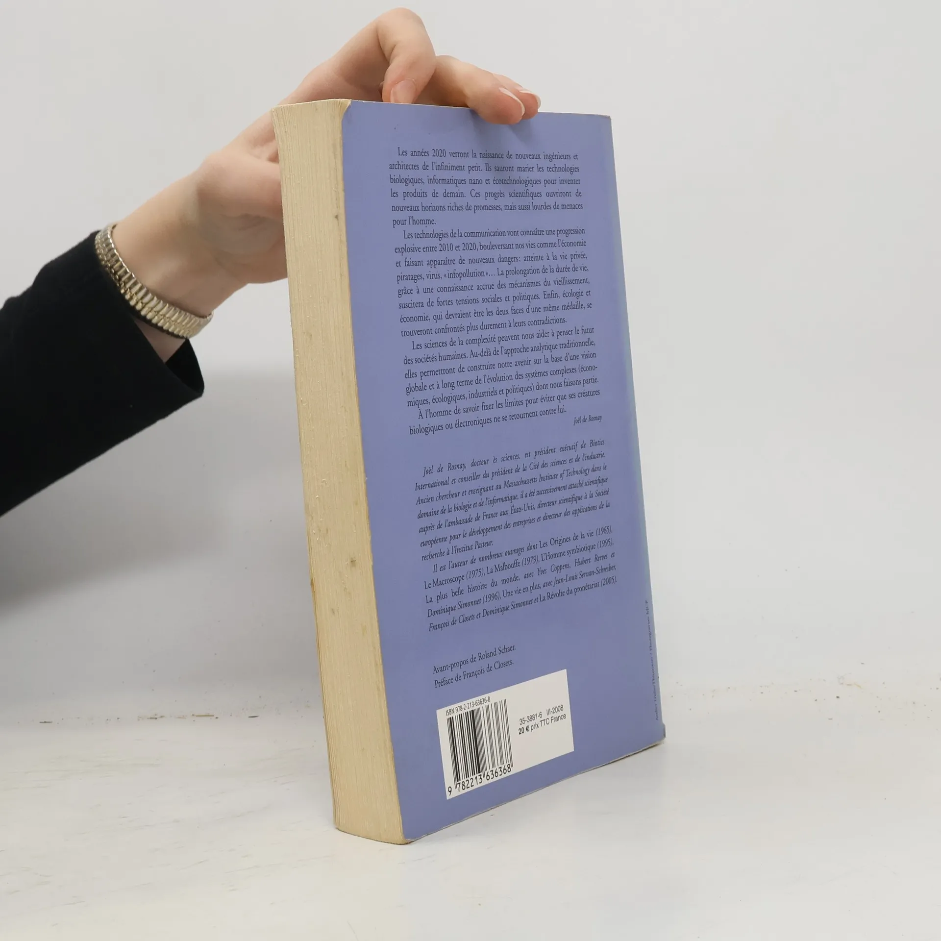 Les années 2020 verront la naissance de nouveaux ingénieurs et architectes de l'infiniment petit. Ils sauront marier les technologies biologiques, informatiques nano et écotechnologiques pour inventer les produits de demain. Ces progrès scientifiques ouvriront de nouveaux horizons riches de promesses, mais aussi lourdes de menaces pour l'homme. Les technologies de la communication vont connaître une progression explosive entre 2010 et 2020, bouleversant nos vies comme l'économie et faisant apparaître de nouveaux dangers: atteinte à la vie privée, piratages, virus, "infopollution"... La prolongation de la durée de vie, grâce à une connaissance accrue des mécanismes du vieillissement, suscitera de fortes tensions sociales et politiques. Enfin, écologie et économie, qui devraient être les deux faces d'une même médaille, se trouveront confrontés plus durement à leurs contradictions. Les sciences de la complexité peuvent nous aider à penser le futur des sociétés humaines. Au-delà de l'approche analytique traditionnelle, elles permettront de construire notre avenir sur la base d'une vision globale et à long terme de l'évolution des systèmes complexes (économiques, écologiques, industriels et politiques) dont nous faisons partie. A l'homme de savoir fixer les limites pour éviter que ses créatures biologiques ou électroniques ne se retournent contre lui. Joël de Rosnay.