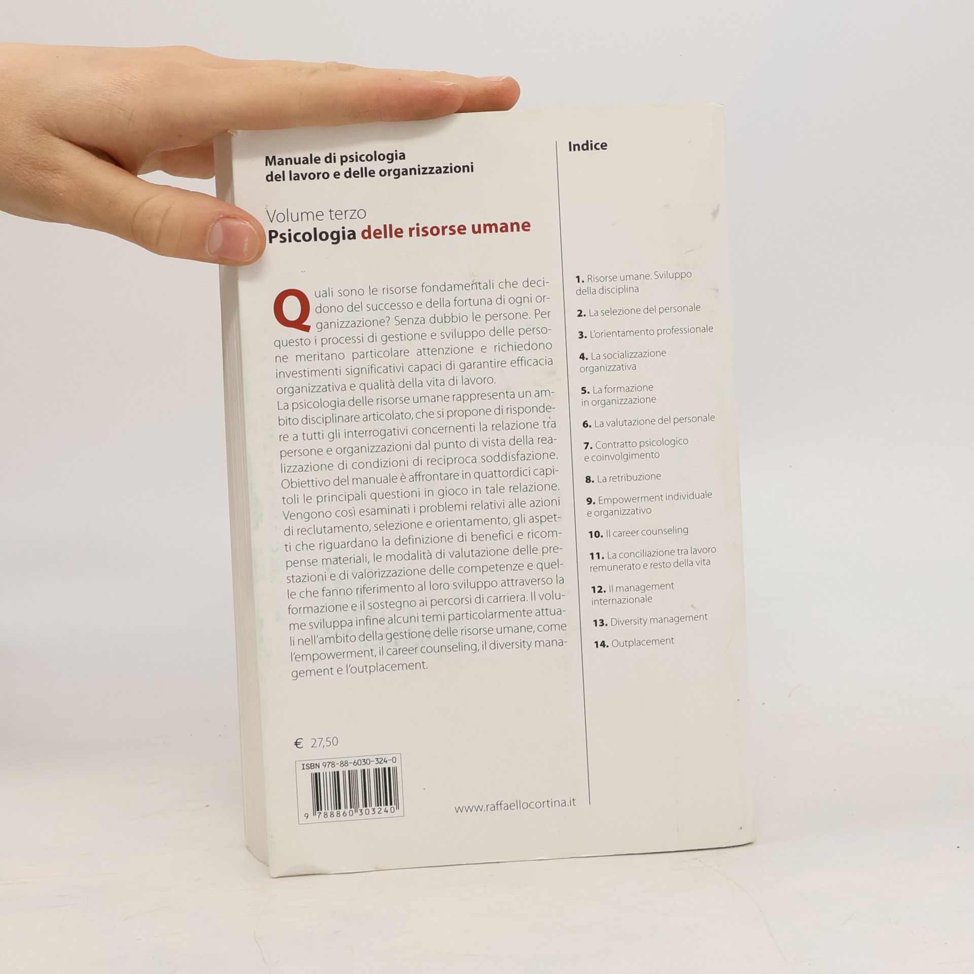 Vengono analizzati gli aspetti legati alla gestione delle persone nei contesti di lavoro organizzato: dal momento dell'ingresso nell'organizzazione (selezione, orientamento, socializzazione) allo sviluppo nel corso della carriera professionale (valutazione, formazione, empowerment, counselling) alla soluzione dei problemi che caratterizzano oggi il mondo del lavoro (internazionalizzazione, contratto psicologico, riqualificazione).