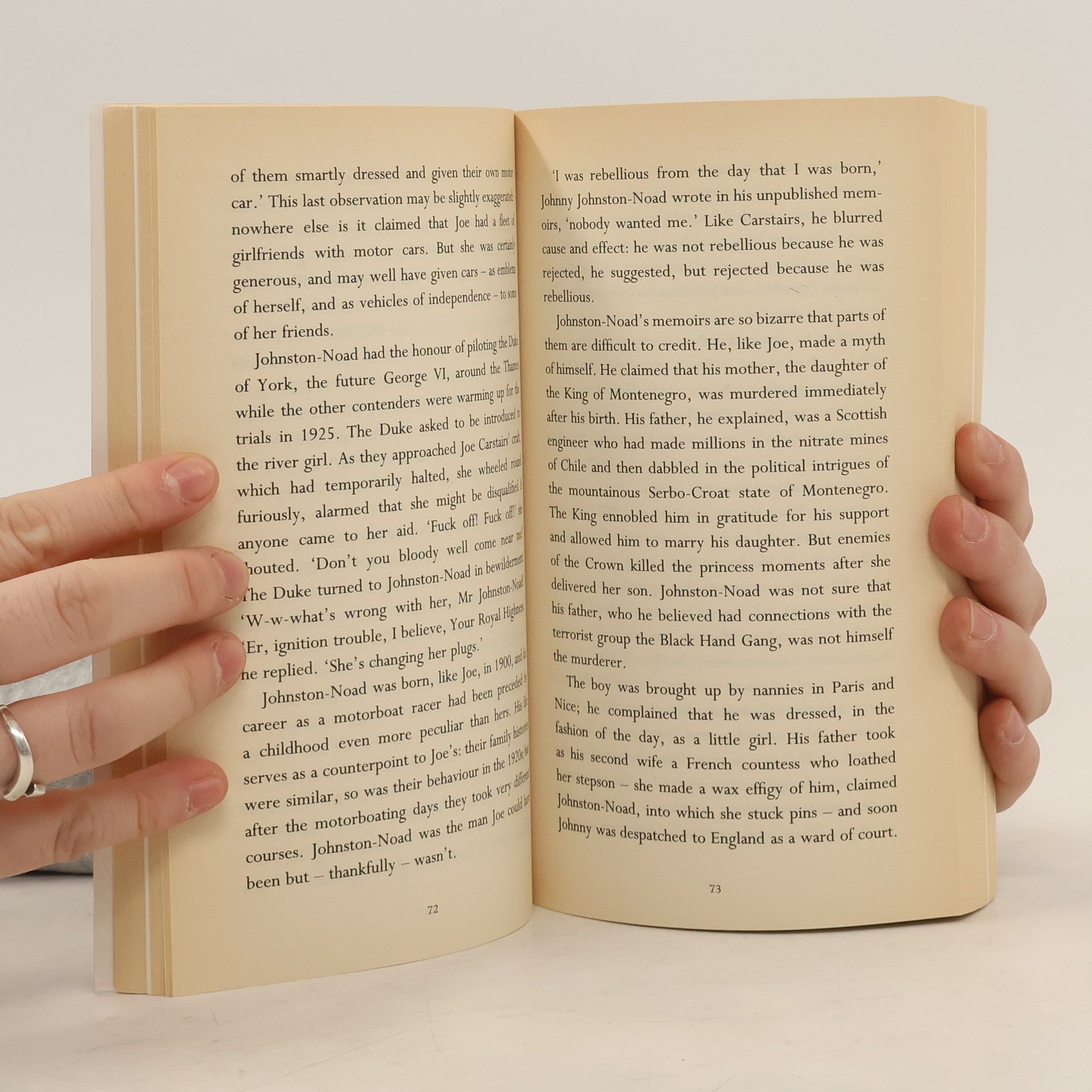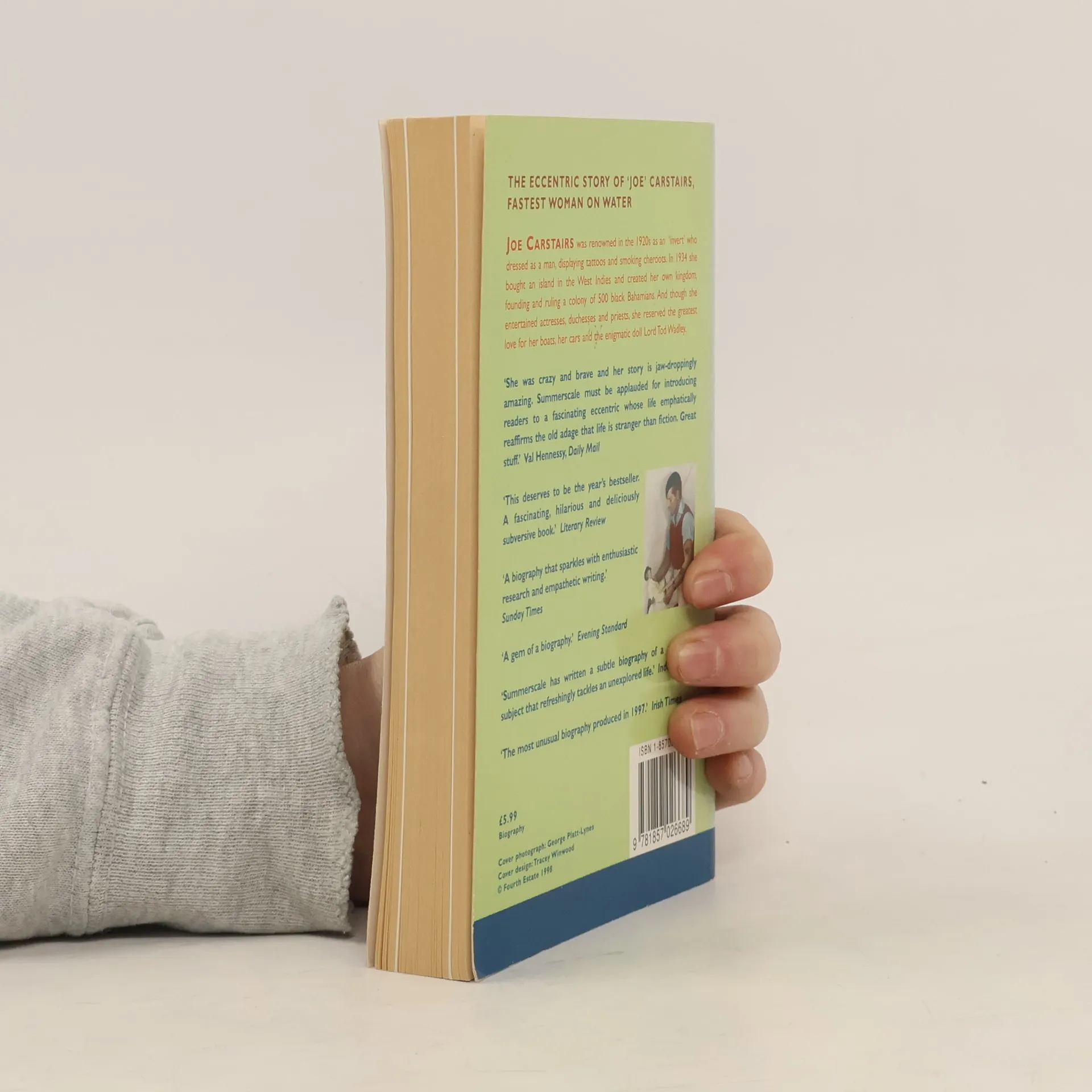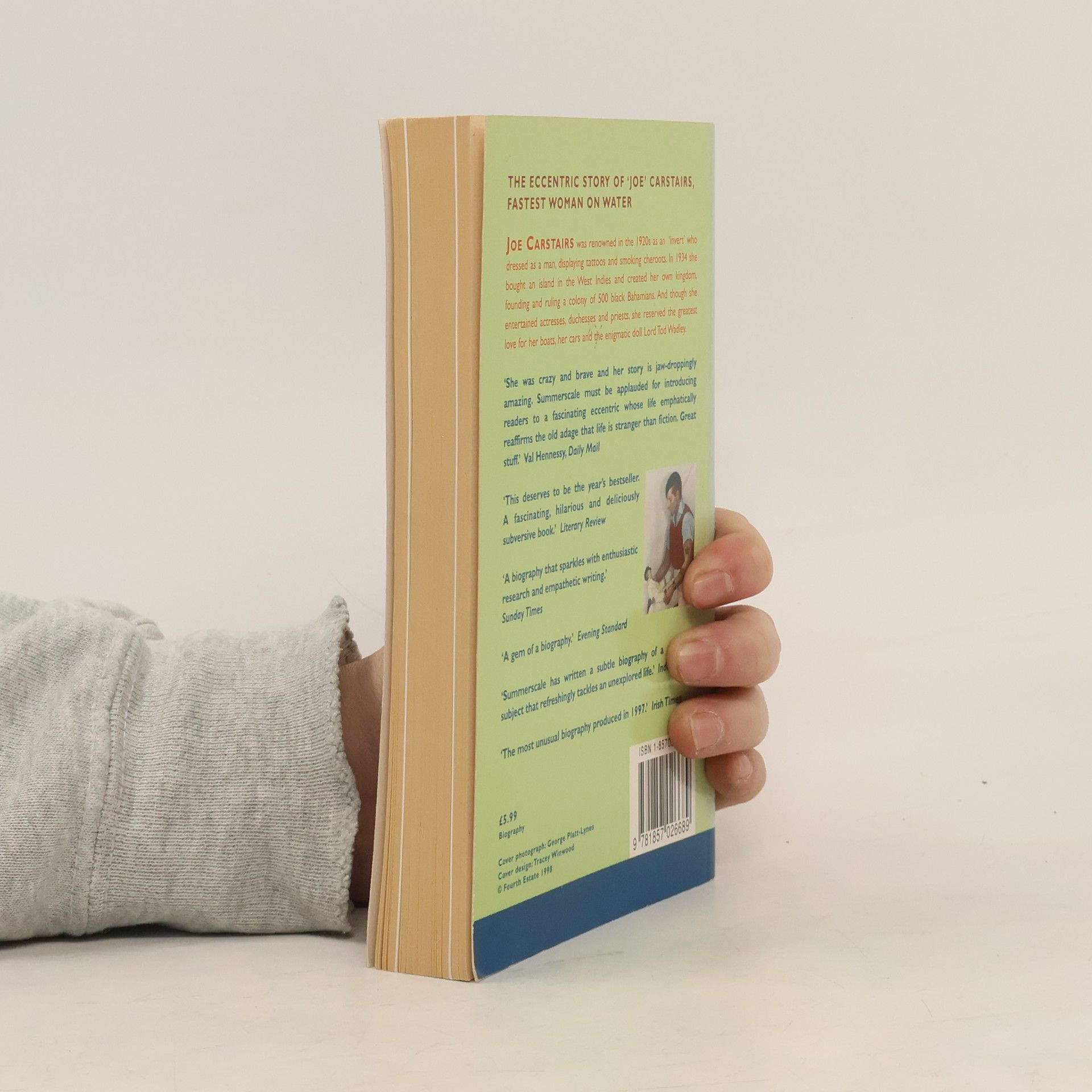Joe Carstairs was born in London in 1900, the daughter of a Scottish colonel and an American heiress. She was educated in Connecticut and returned to Europe in 1916, to drive ambulances for the Women's Legion in France. She deserted her husband at the church door (marriage having been a prerequisite of her coming into her $4 million inheritance) and settled in England, where she took up motor-boat racing, winning many trophies, and established a boatyard at Cowes.